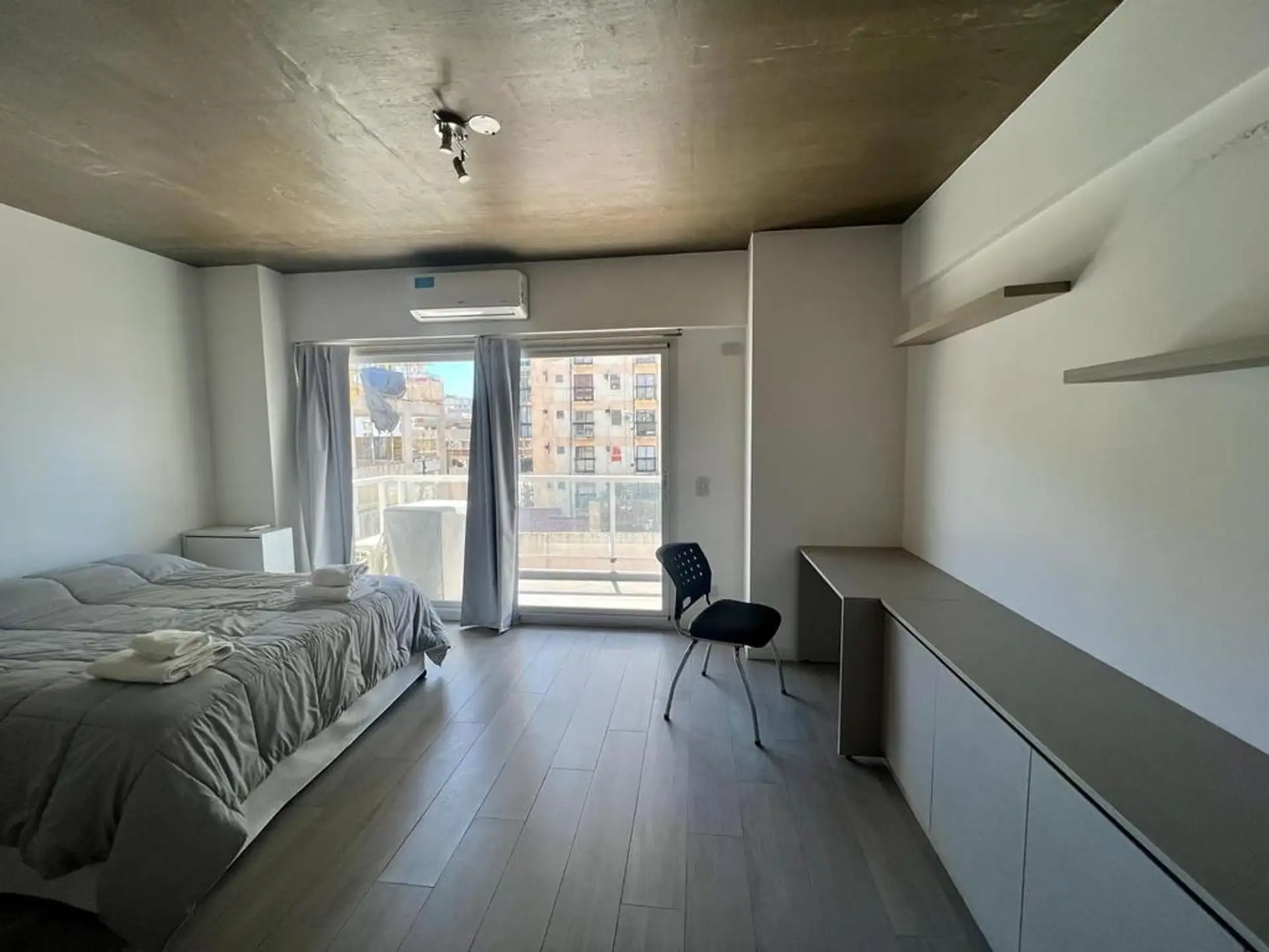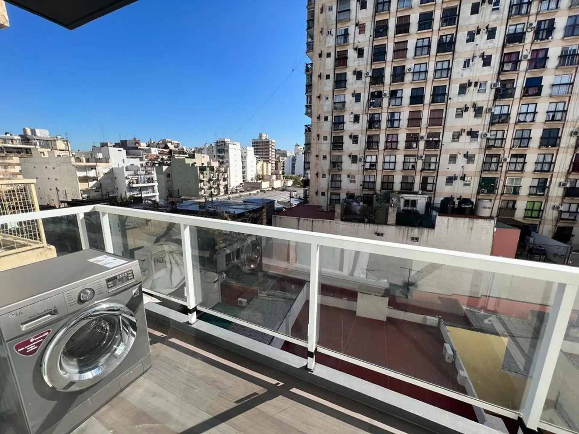 Departamento de 2 ambientes de 55,8 m² totales en Almagro, contrafrente, con balcón aterrazado. Cuenta con living comedor, 1 baño completo y está equipado para estadía inmediata: split frío/calor, heladera, lavarropa, camas y servicio de wifi. El edificio tiene portería y acceso apto para personas con movilidad reducida. El alquiler temporario admite estadías de 3 noches a 3 meses, con opción de renovación.
