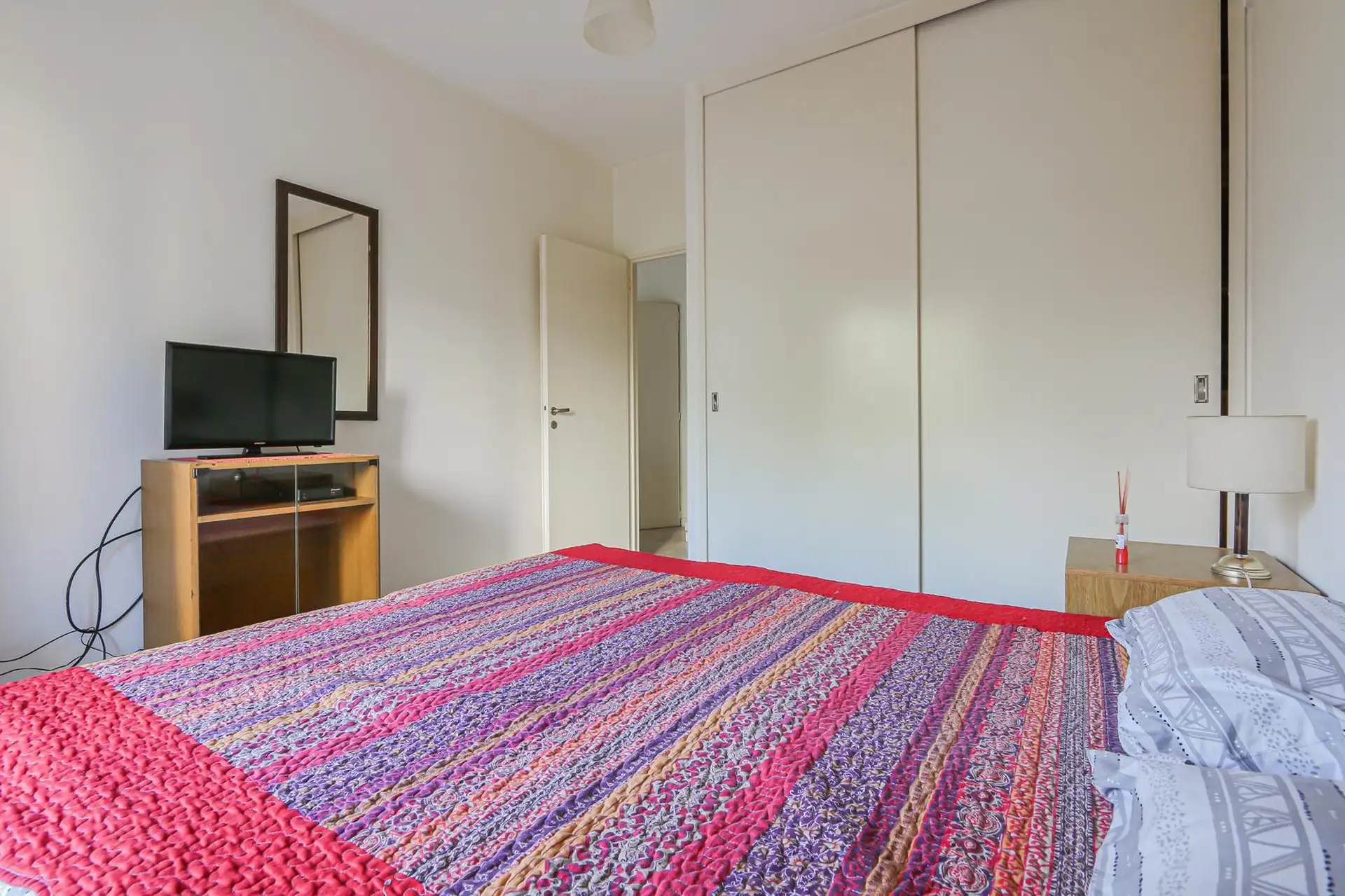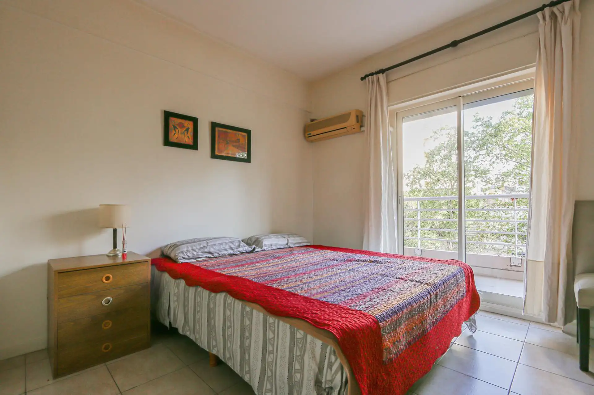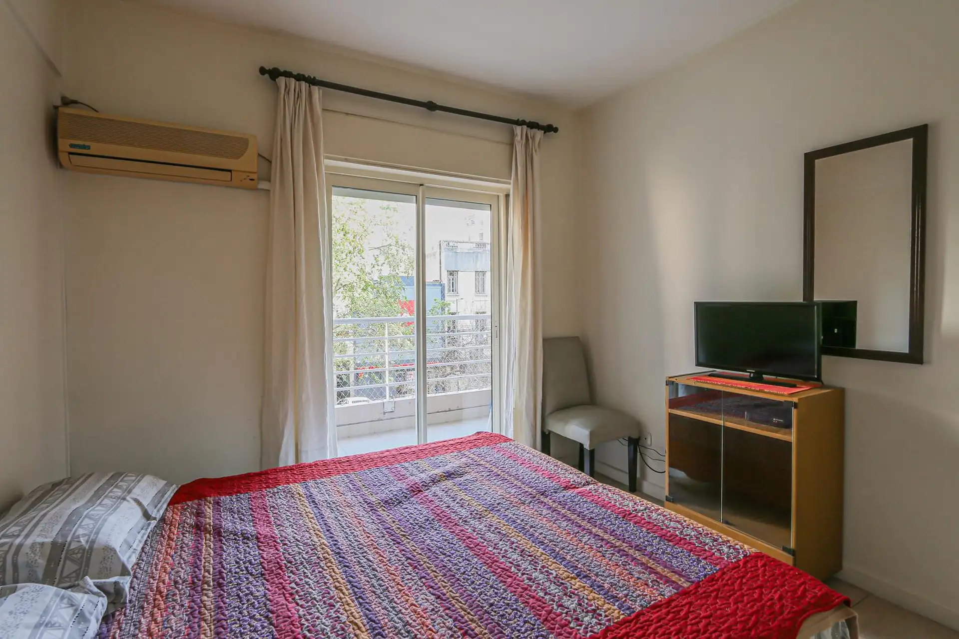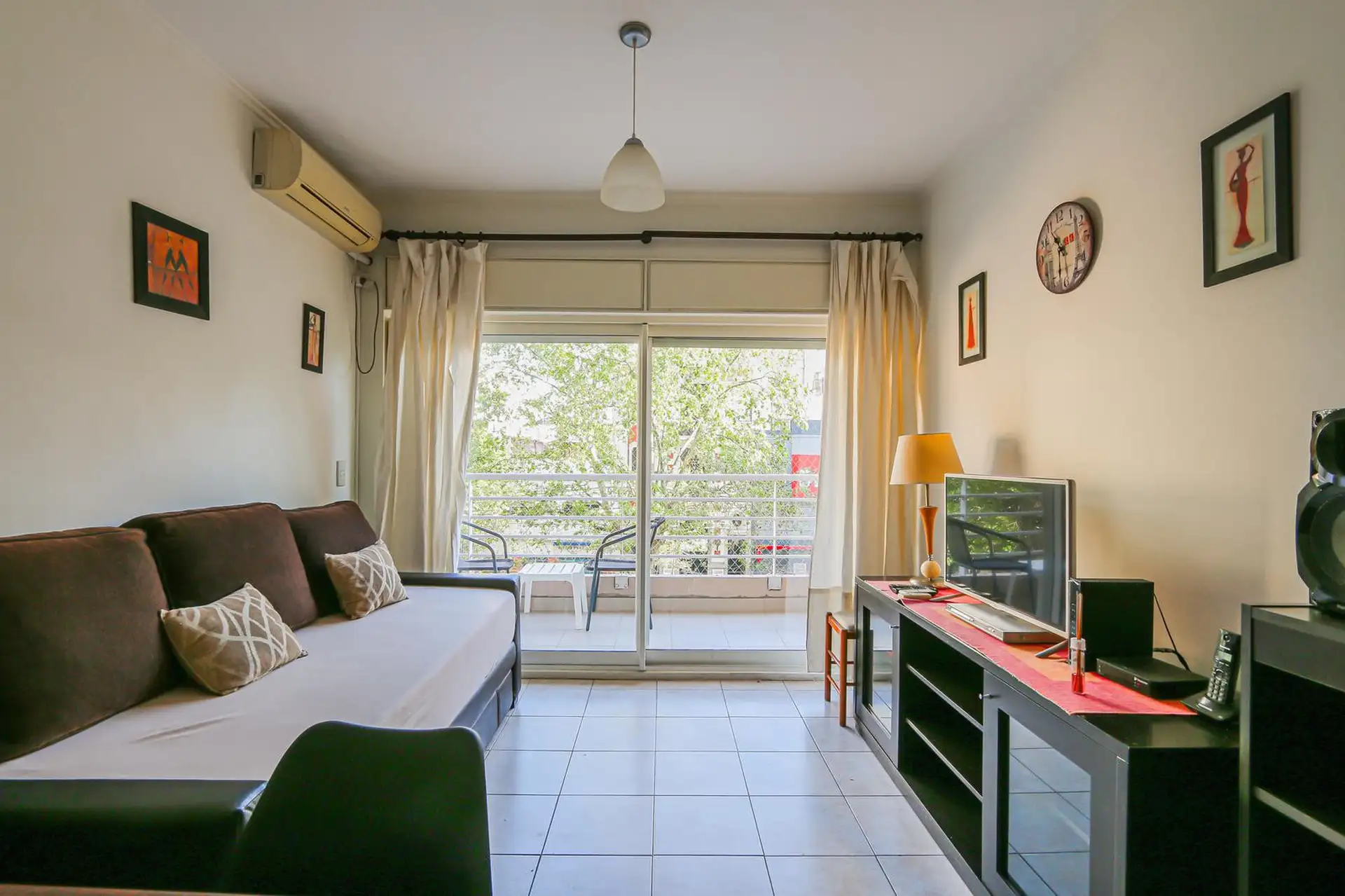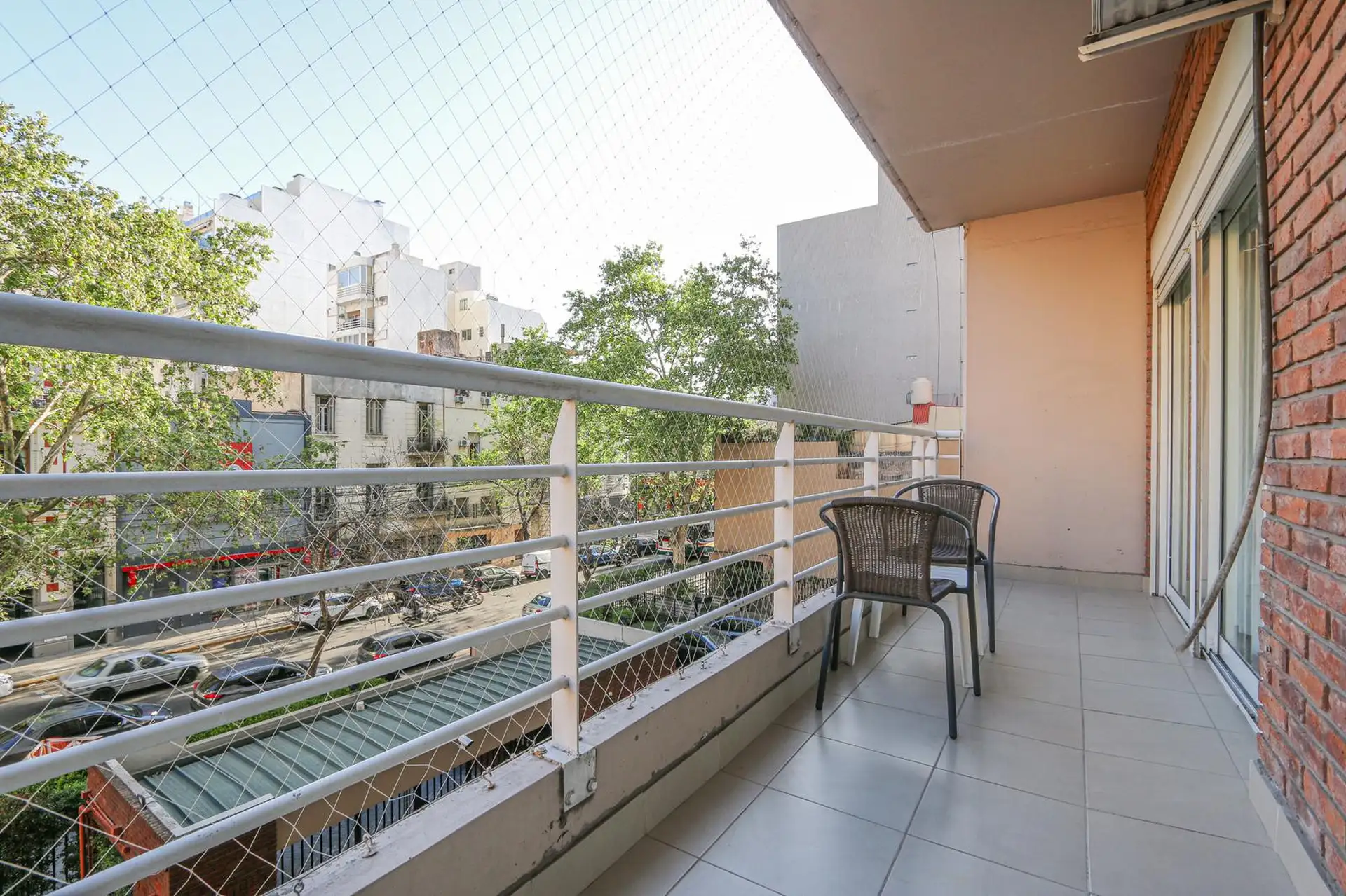 Departamento de 2 ambientes en Almagro, en una torre con seguridad las 24 horas. Cuenta con balcón con vista frente a la calle Sarmiento, living-comedor con TV, aire acondicionado frío/calor y router Wi-Fi, y cocina totalmente equipada con horno eléctrico, cafetera eléctrica y pava eléctrica. Dormitorio con cama de 2 plazas (posibilidad de separar en 2 camas de 1 plaza), placard de dos cuerpos y aire acondicionado frío/calor. Tiene 1 baño totalmente equipado y capacidad máxima para 2 personas. I