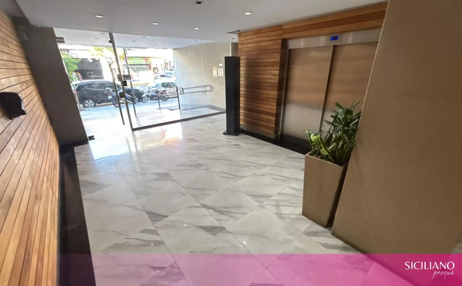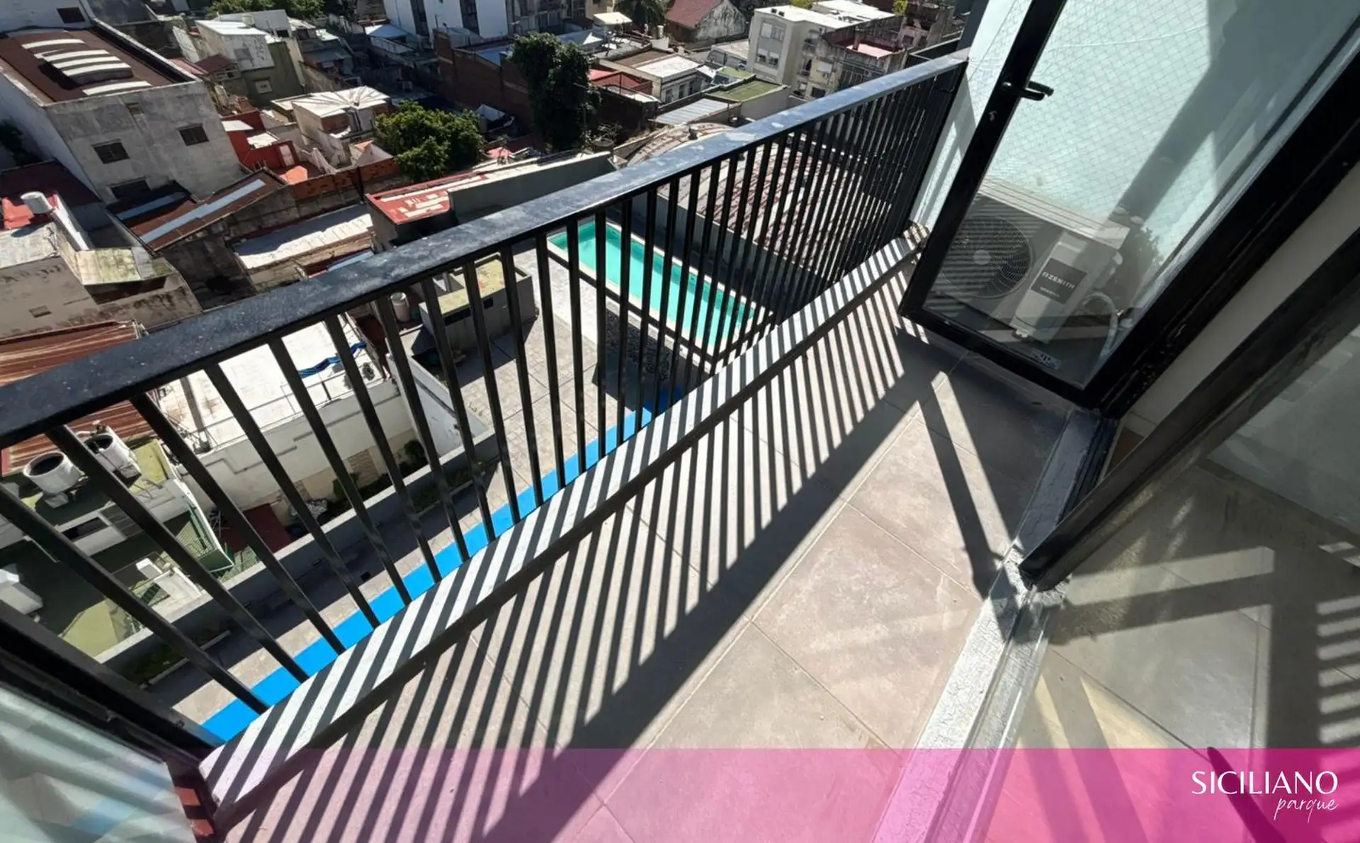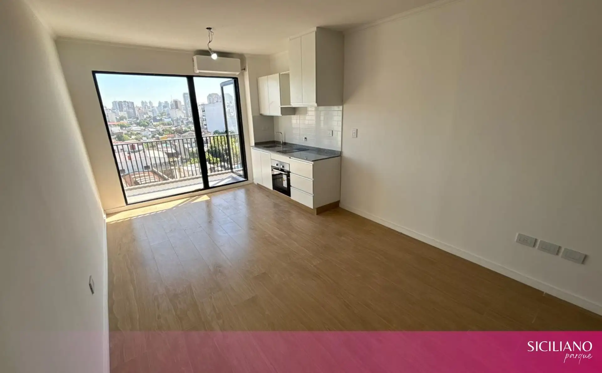 Departamento monoambiente de 30 m² totales, 26,5 m² cubiertos y 3,5 m² descubiertos, ubicado en el 10º piso. Orientación norte, balcón al contrafrente con vista abierta. Cocina integrada, ambiente principal con placard y baño completo con bañera. Incluye aire acondicionado frío/calor, cocina eléctrica y agua caliente individual por termotanque eléctrico; no tiene instalación de gas. Edificio PB + 15 pisos, entre medianeras, 9 departamentos por piso, 2 ascensores, servicio de limpieza, 2 piscinas