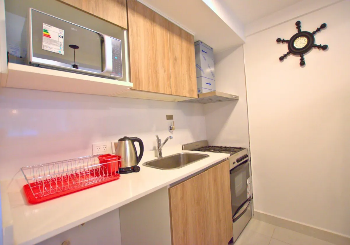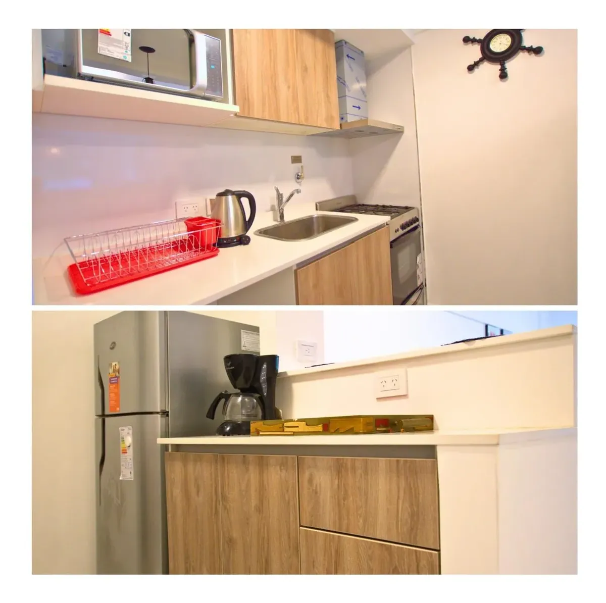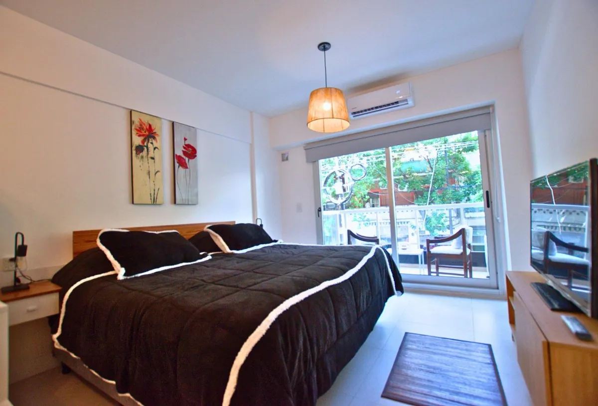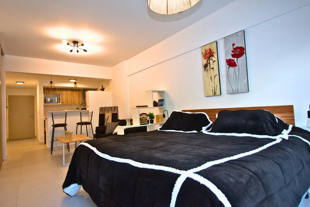 Monoambiente en alquiler totalmente amoblado y equipado, al frente con balcón, en Almagro. Cocina semi integrada con barra desayunadora y campana extractora en acero inoxidable, con cocina horno a gas; baño completo. Cuenta con calefacción y climatización por equipo split frío-calor, y el edificio dispone de accesibilidad para movilidad reducida, 2 ascensores, SUM, parrillas, terraza con solarium y pileta. El precio publicado incluye el mobiliario.