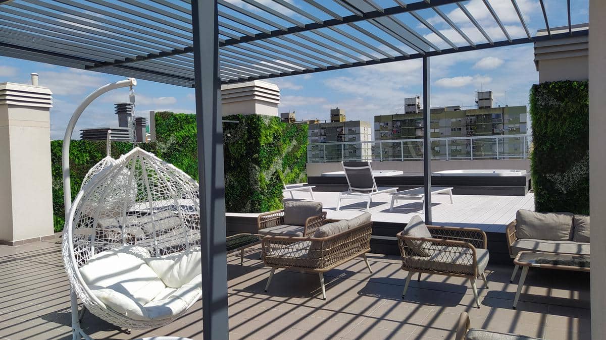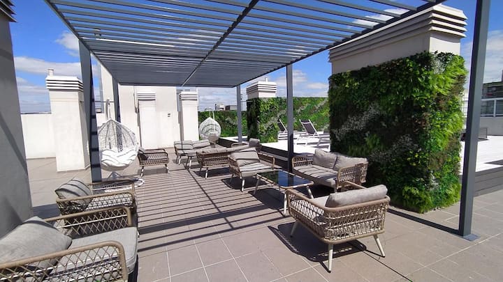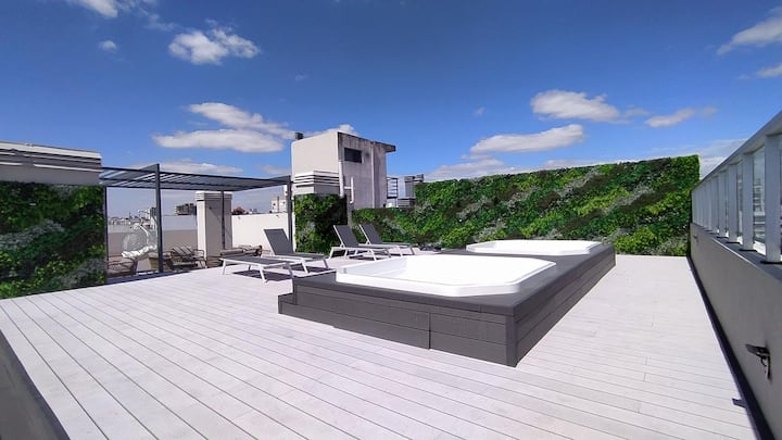 Квартира-студия в Almagro, с мебелью и полностью оборудованная. Площадь в описании не указана; этаж и ориентация не указаны. В здании есть SUM, терраса общего пользования, джакузи, солярий и зоны гриля. Терраса, а также помещения SUM используются по предварительной записи через приложение. В 4 кварталах от Parque Centenario; до станций Subte A и Subte B — 7 и 4 квартала соответственно.