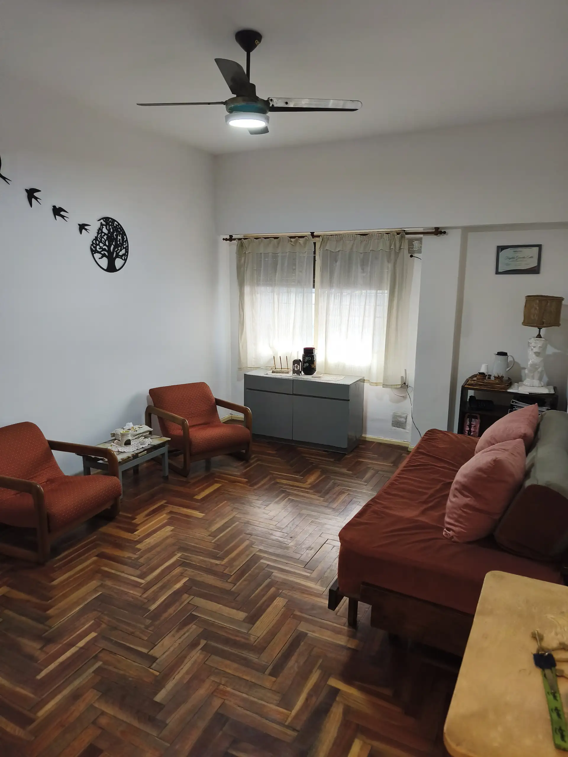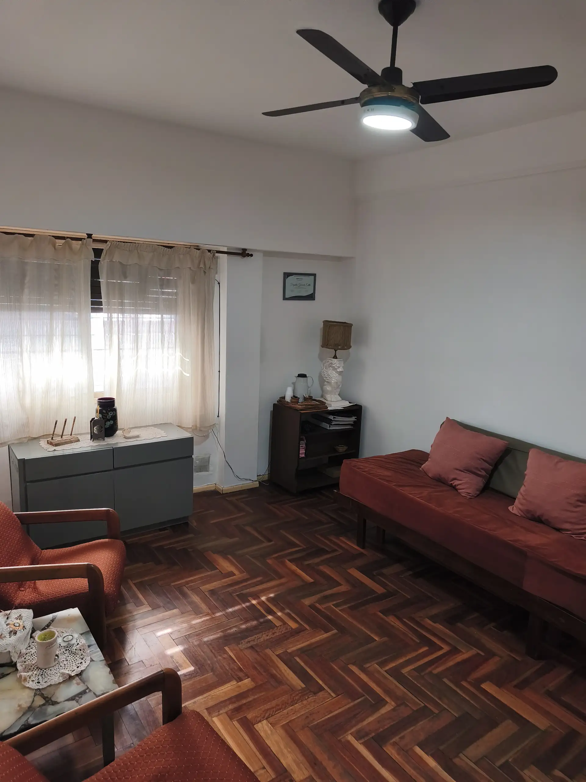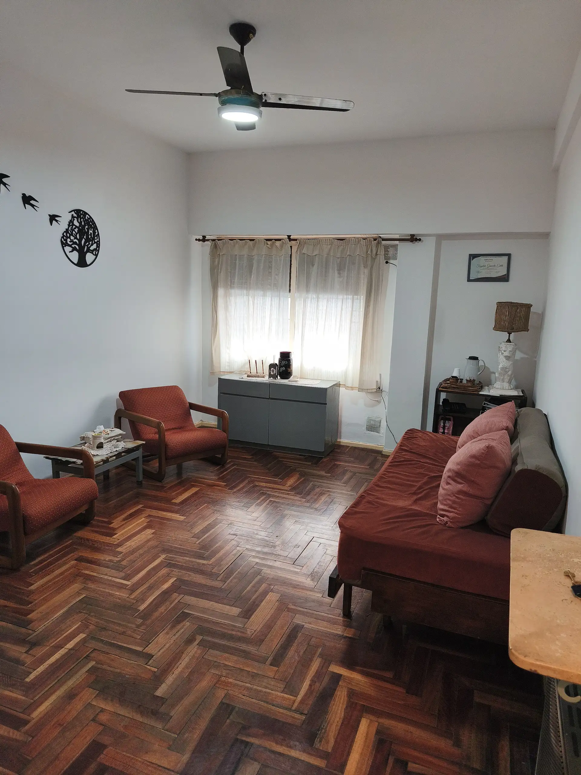 Departamento de 2 ambientes de 48 m² en planta baja, al frente. Incluye living comedor con ventanal a la calle, pisos de madera, estufa, ventilador de techo y luminarias, y habitación con placard empotrado con baulera, ventilador de techo y ventanal al frente. Tiene baño completo con bañera y vanitory, cocina independiente con bajo mesada, alacena y calefón Orbis con salida al patio, donde hay sector de lavadero. El alquiler es de $500.000, con expensas de $80.000 y TSG de $45.000; contrato por