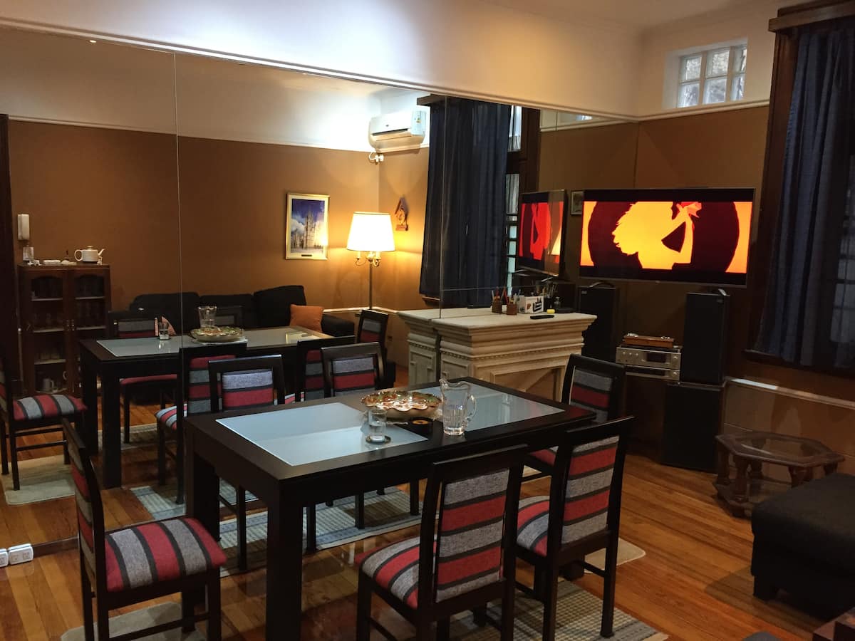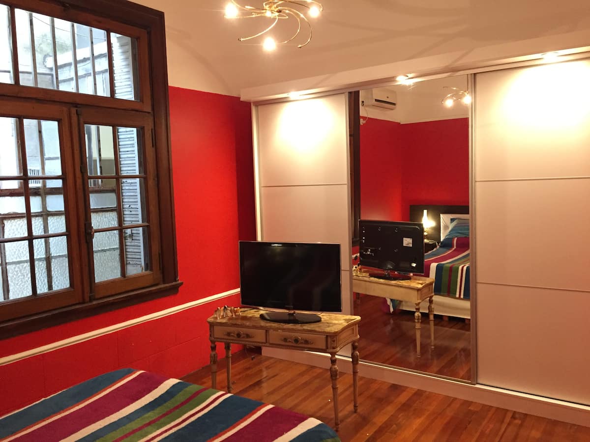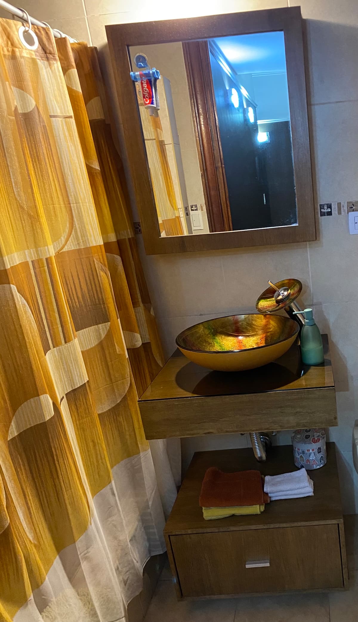 Departamento de 90 m² en planta baja, con patio y sector de lavandería. Cuenta con aire acondicionado, ventilador de techo y TV. En el equipamiento hay heladera, microondas, tostadora, licuadora, exprimidor, horno eléctrico y cocina con vajilla y utensilios; también incluye 2 TVs (50" y 32") con Netflix. Se informa que hay teléfono fijo y un número de celular para contacto durante la estadía.