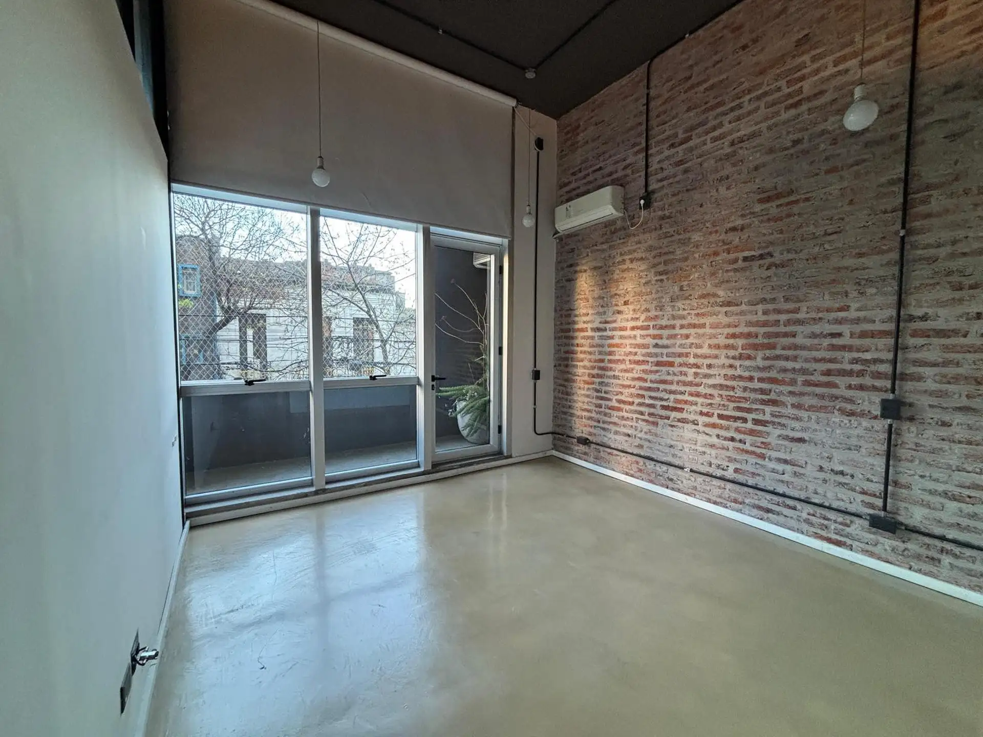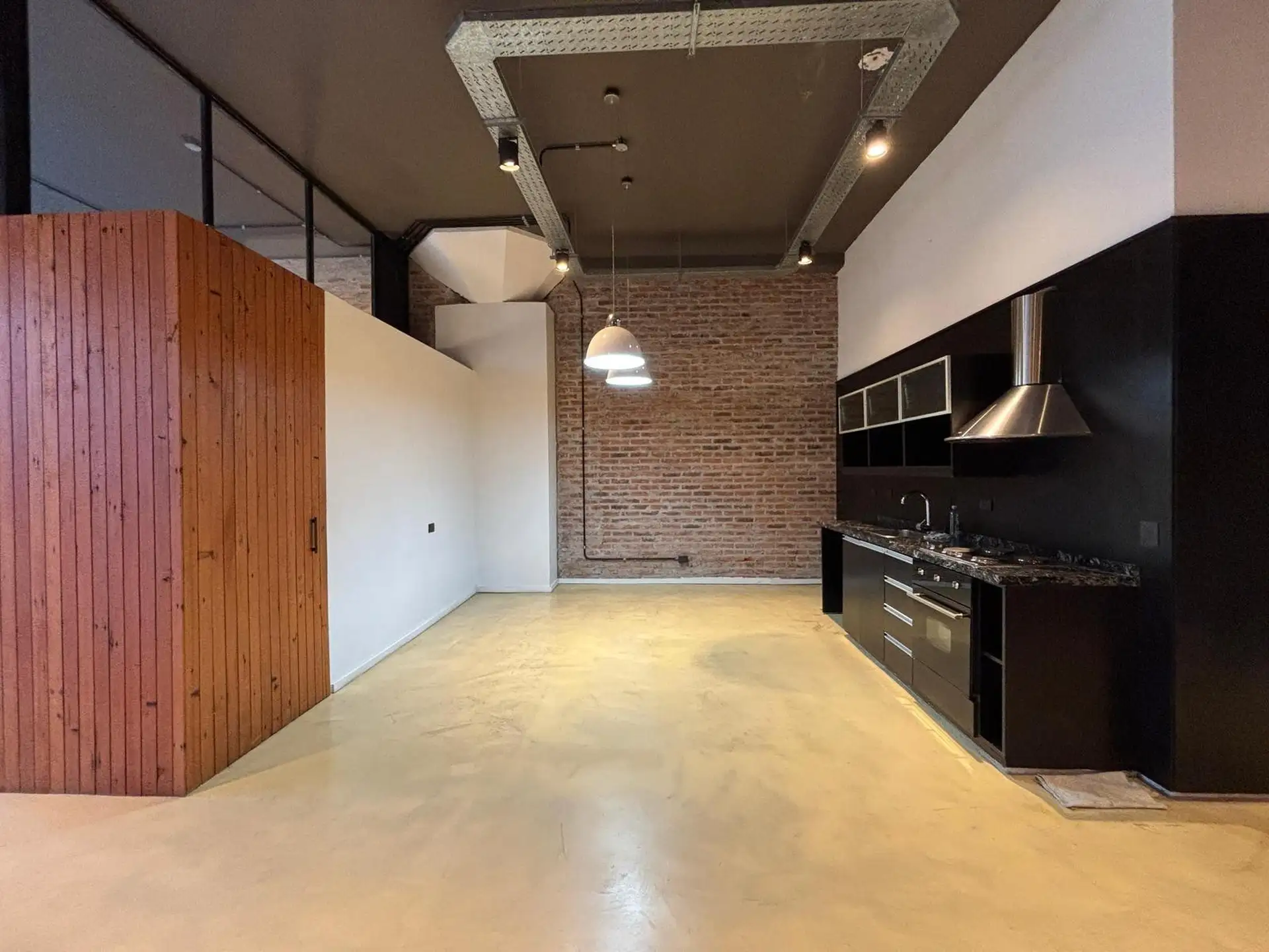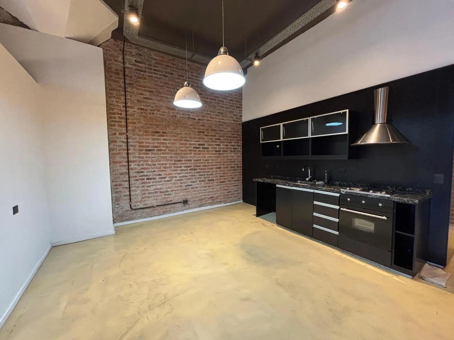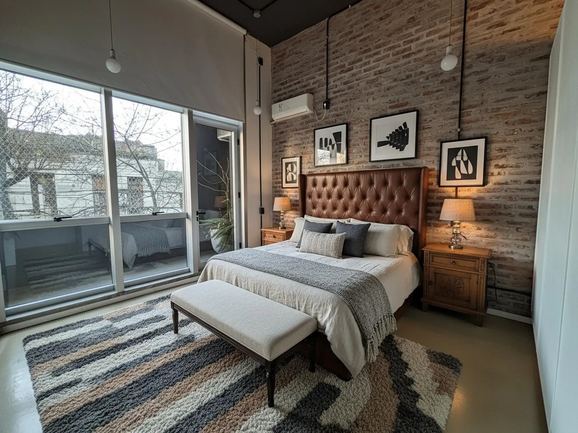 Departamento loft de 2 ambientes en Barracas. Se alquila con contrato por 1 año por USD 900 mensuales más expensas. Cuenta con cocina integrada con barra, muebles de cocina completos, alacena y bajo mesada, living-comedor con salida al balcón, dormitorio con vestidor y baño completo. Tiene cortinas black out en el dormitorio, 2 aires acondicionados frío-calor y cerradura electrónica para el ingreso. El homestaging de la imagen es ilustrativo y se generó con IA a partir de una foto real.