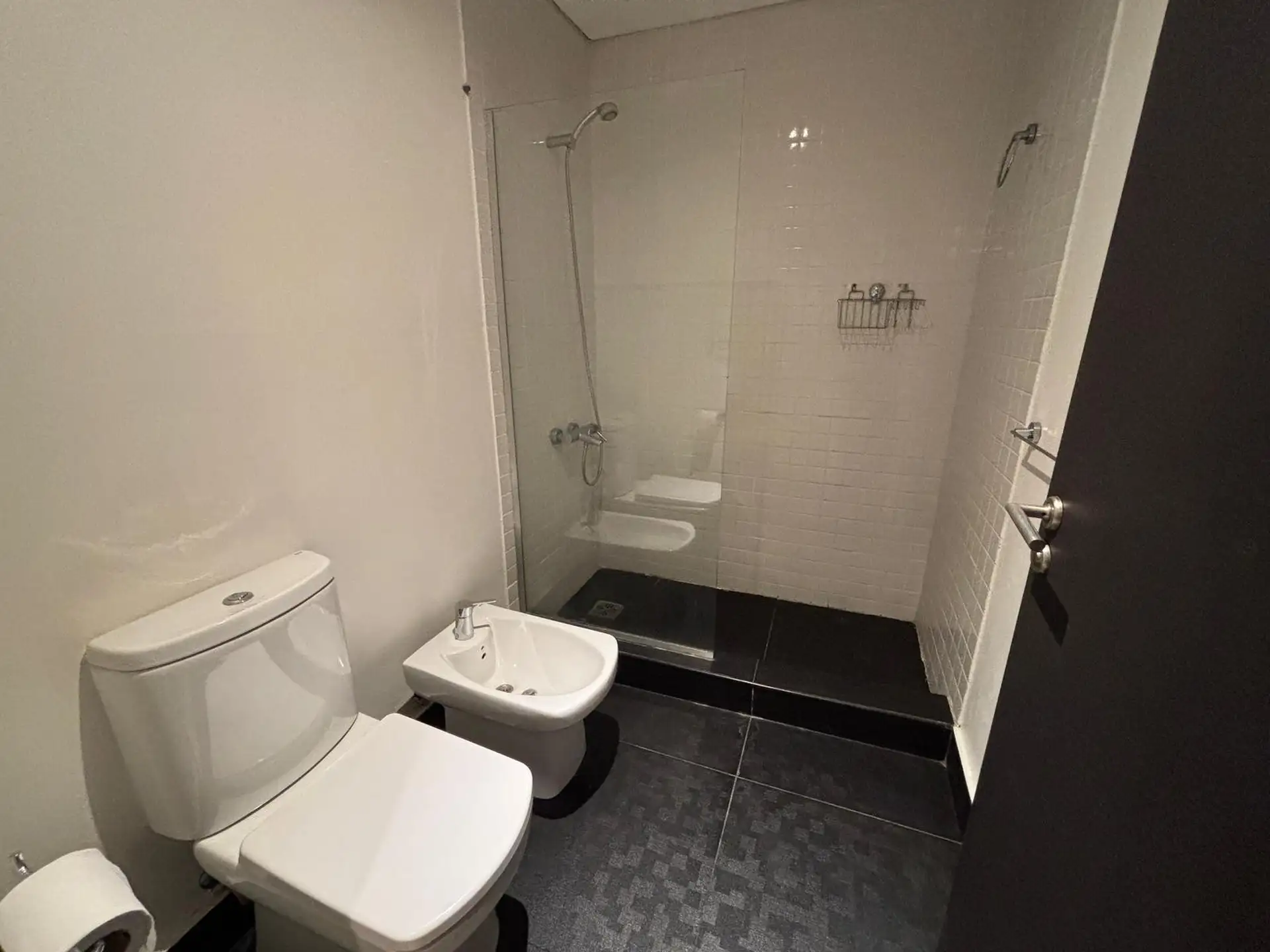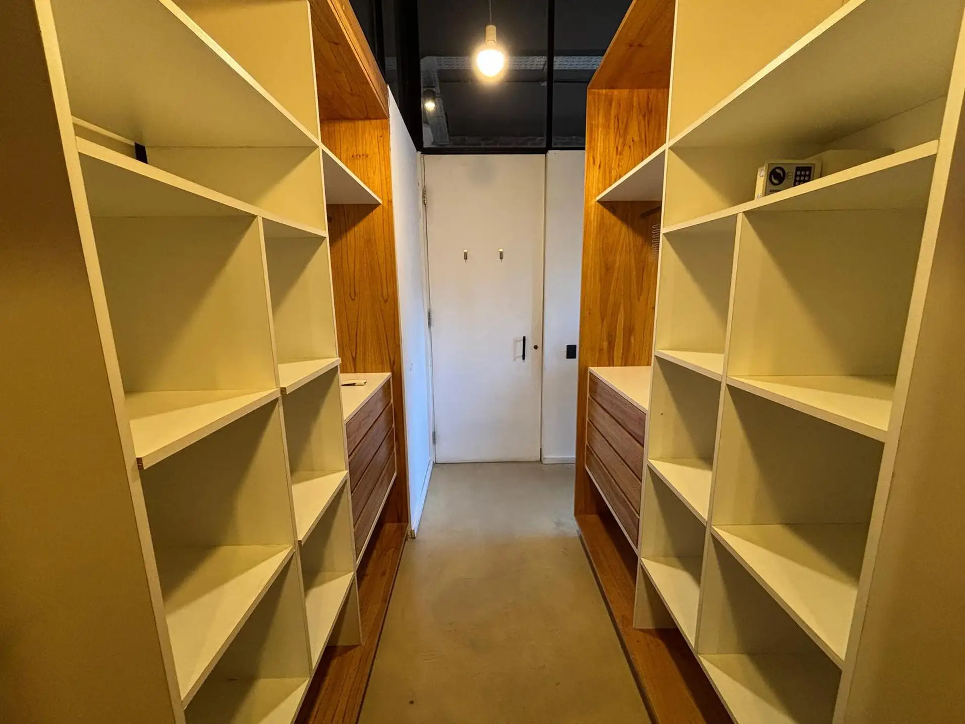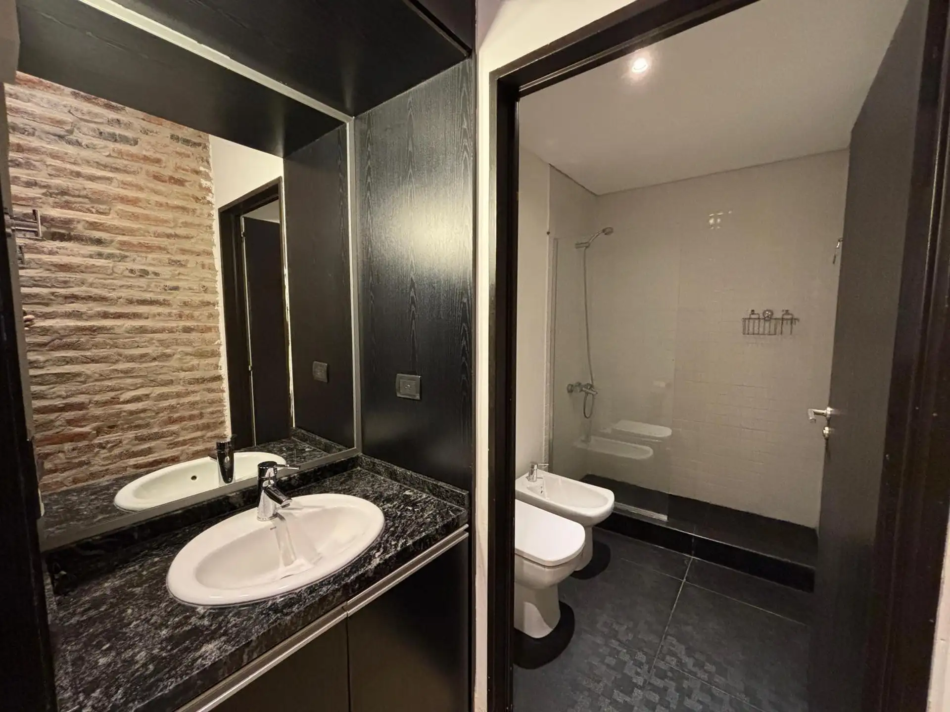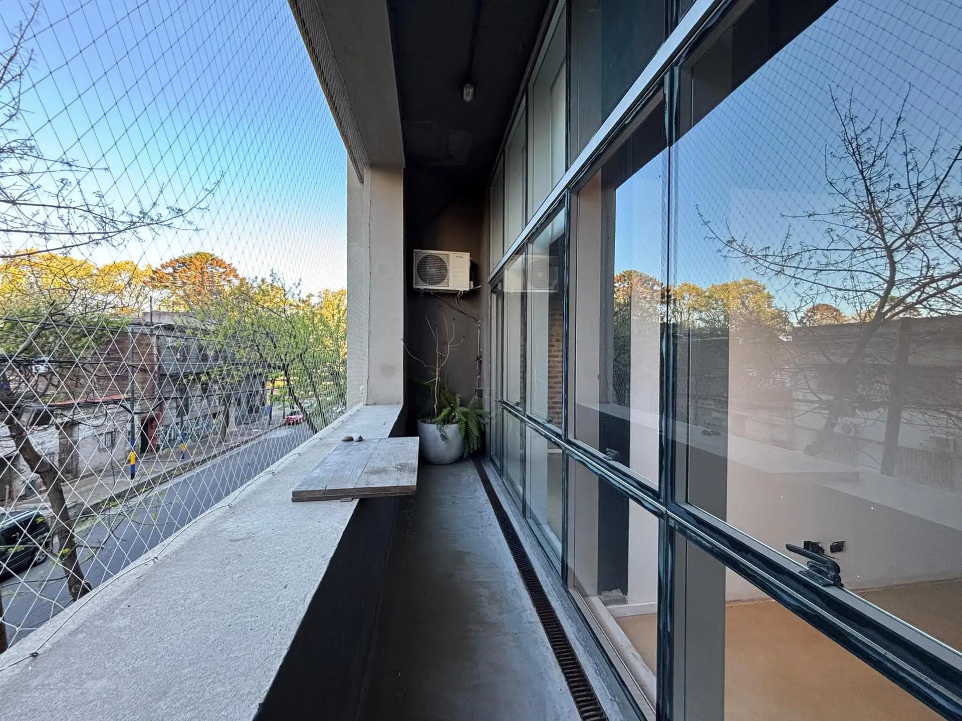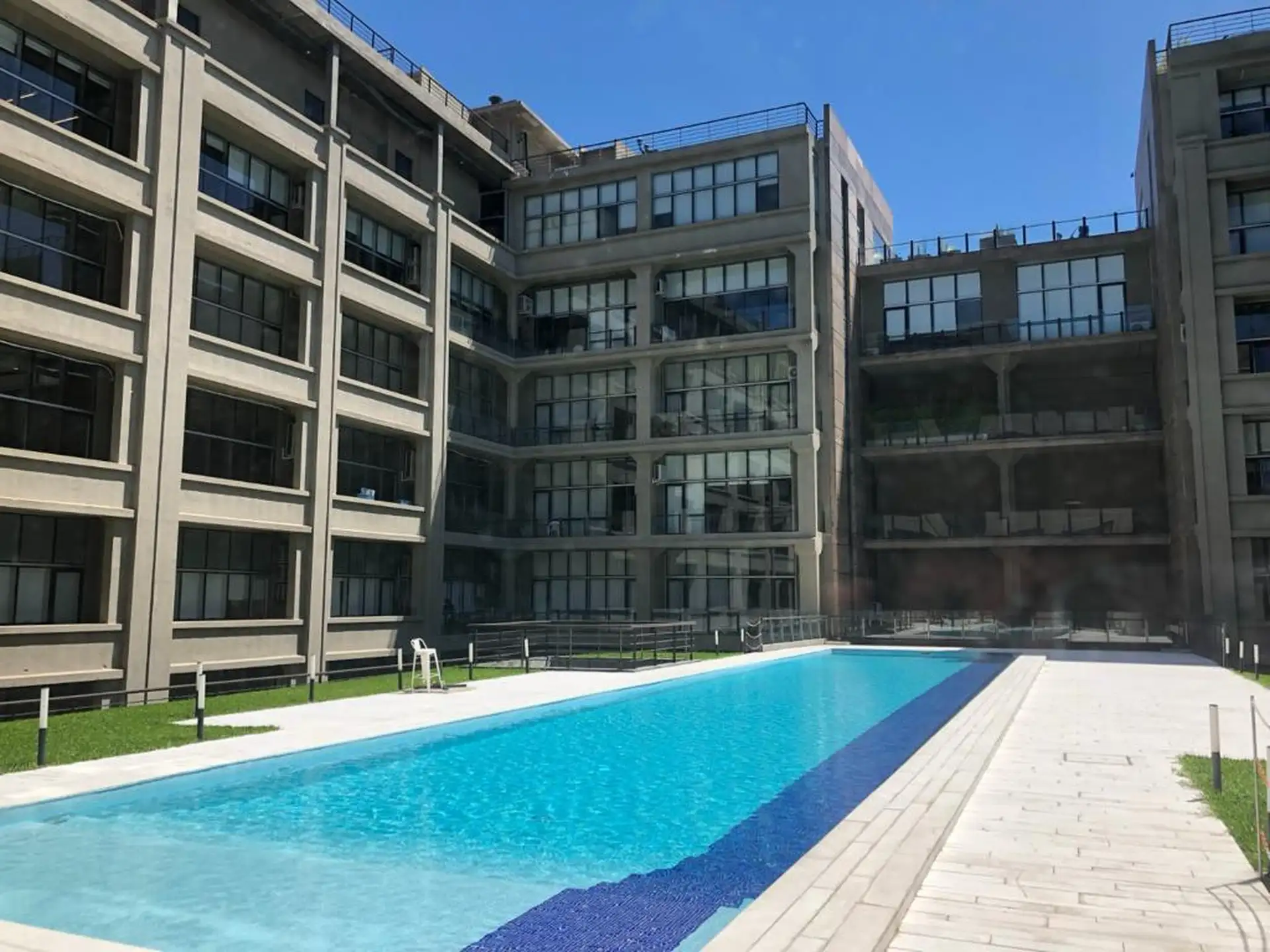 Departamento loft de 2 ambientes en Barracas. Se alquila con contrato por 1 año por USD 900 mensuales más expensas. Cuenta con cocina integrada con barra, muebles de cocina completos, alacena y bajo mesada, living-comedor con salida al balcón, dormitorio con vestidor y baño completo. Tiene cortinas black out en el dormitorio, 2 aires acondicionados frío-calor y cerradura electrónica para el ingreso. El homestaging de la imagen es ilustrativo y se generó con IA a partir de una foto real.