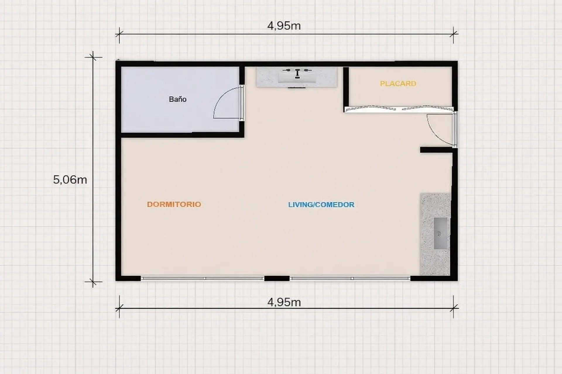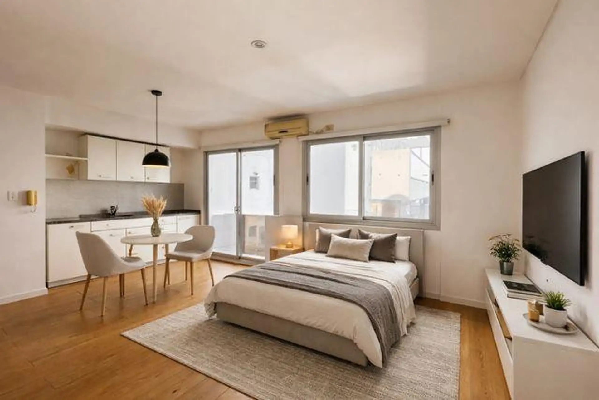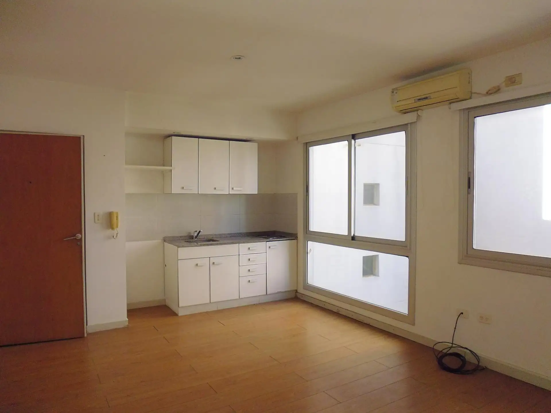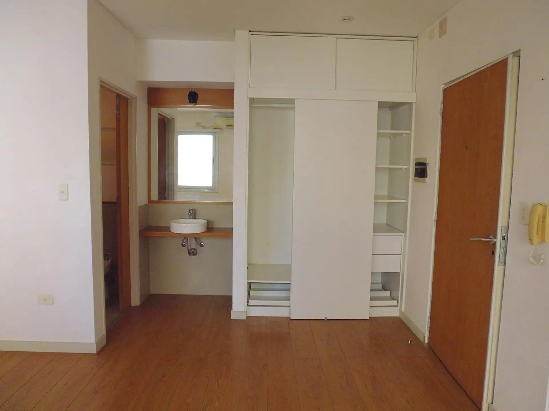 Departamento monoambiente de 25,09 m² en el 6º piso, ubicado en Calle Conesa al 2600, entre Pedro Ignacio Rivera y Franklin D. Roosevelt, Belgrano. Está deshabitado; las fotos muestran la distribución del ambiente. Incluye espacio para living y dormitorio con cortinas Roller Blackout, split frío, estufa Ecosol, cocina integrada con anafe eléctrico de 2 hornallas y termotanque eléctrico, placard y baño compartimentado con ducha, ventana y extractor. El edificio cuenta con baulera individual en pl
