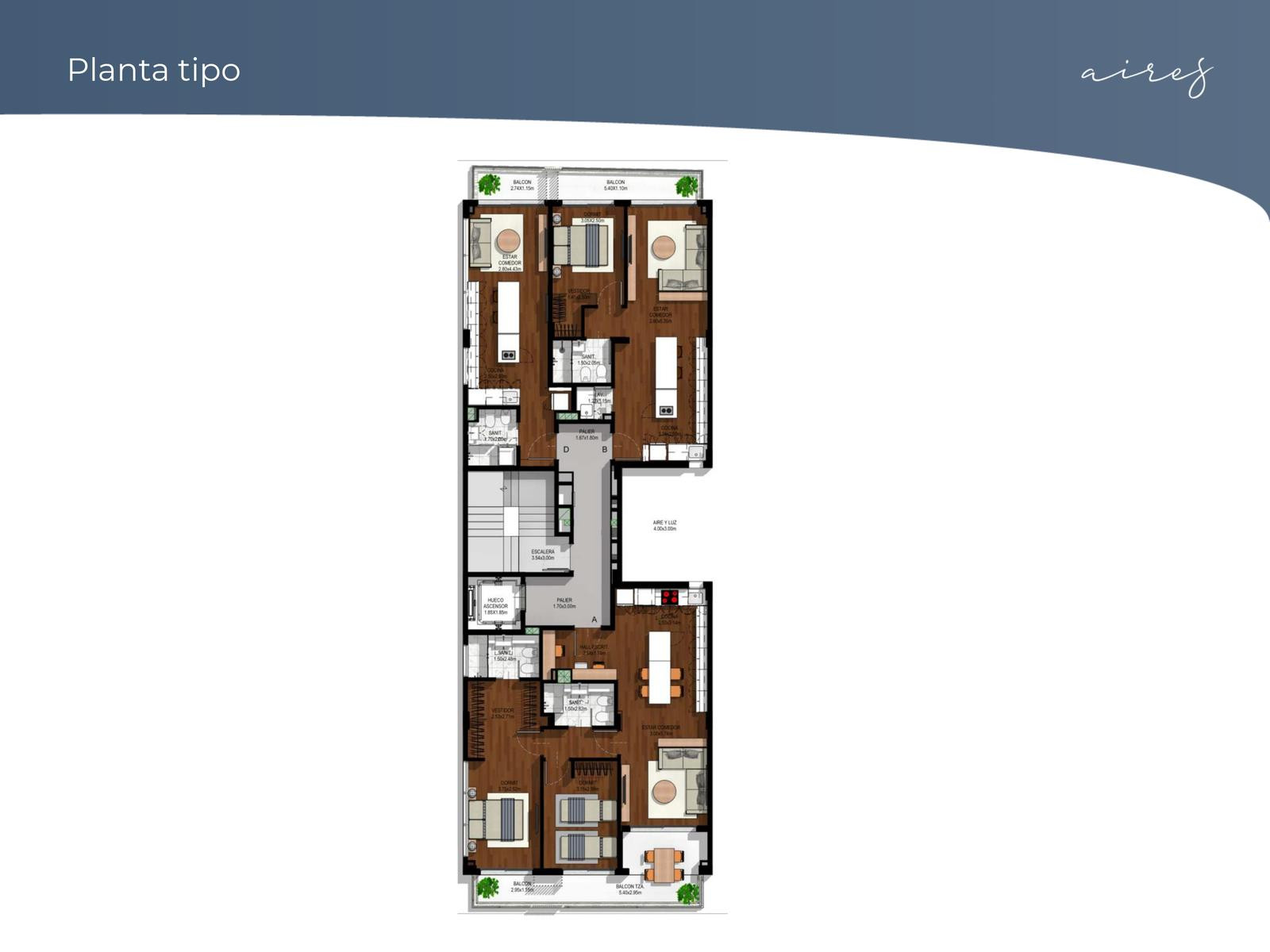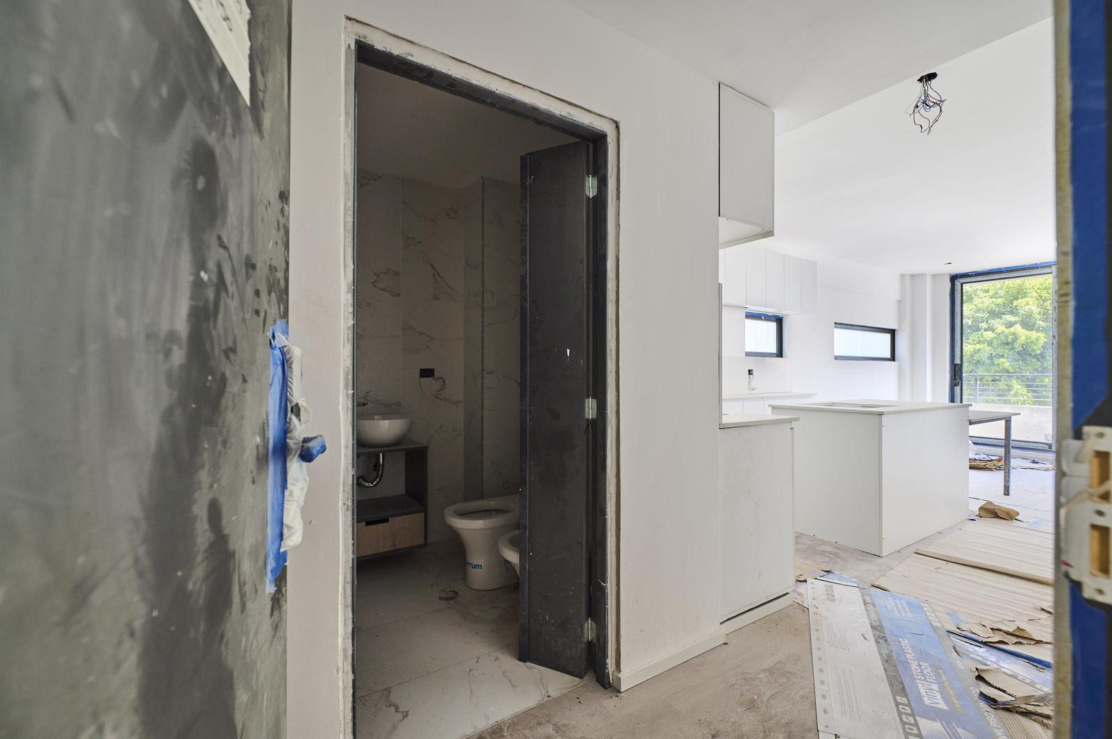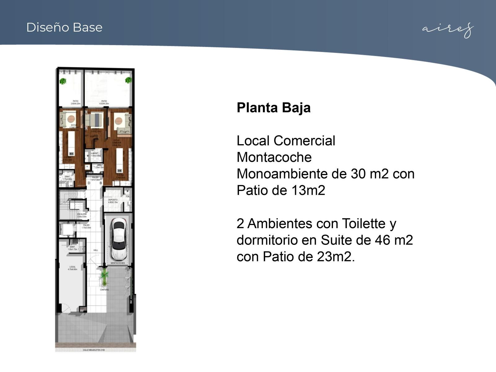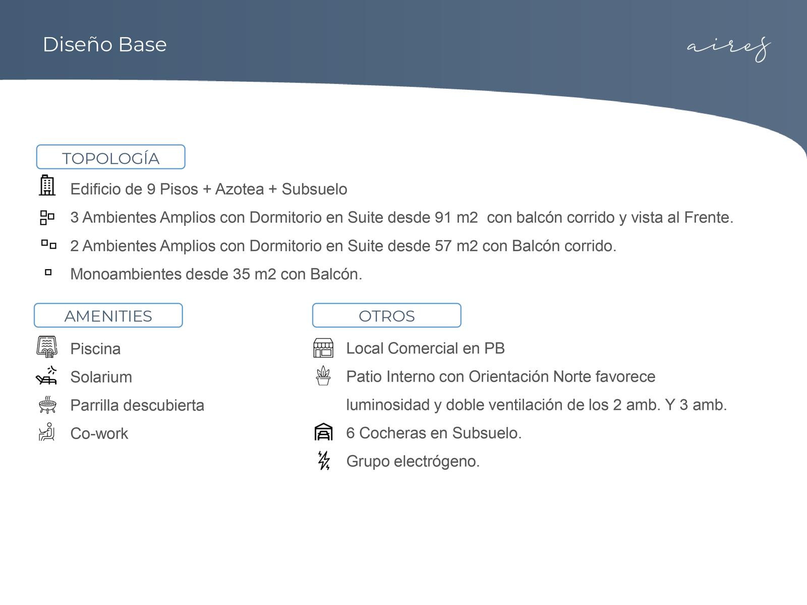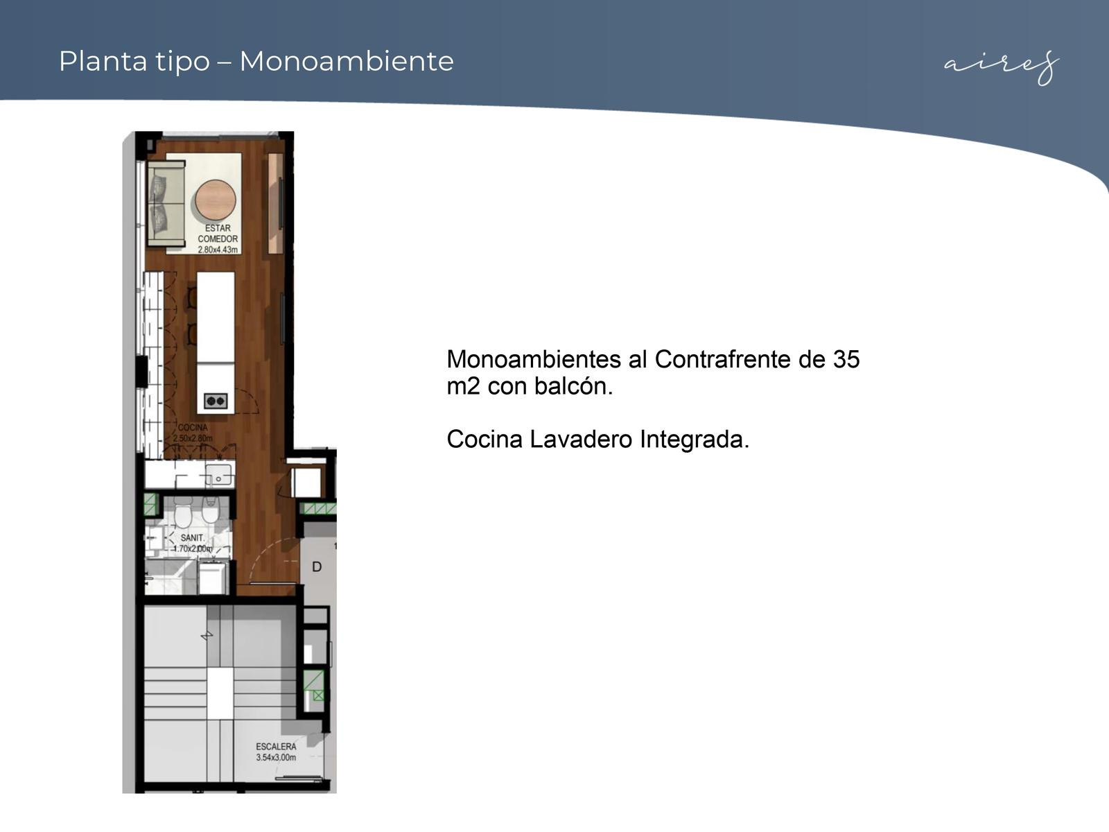 Departamento monoambiente en el 8° piso, al contrafrente, en el emprendimiento Aires Migueletes. La entrega prevista es para marzo de 2026. Se entregan unidades completamente equipadas: cocina completa, placares con interiores, aires acondicionados instalados, calefacción por piso eléctrico y cerradura digital. El edificio cuenta con 9 pisos habitables, 6 cocheras en subsuelo, terraza con parrillas y pileta, grupo electrógeno y amenities con piscina, solarium, parrilla descubierta y espacio de c