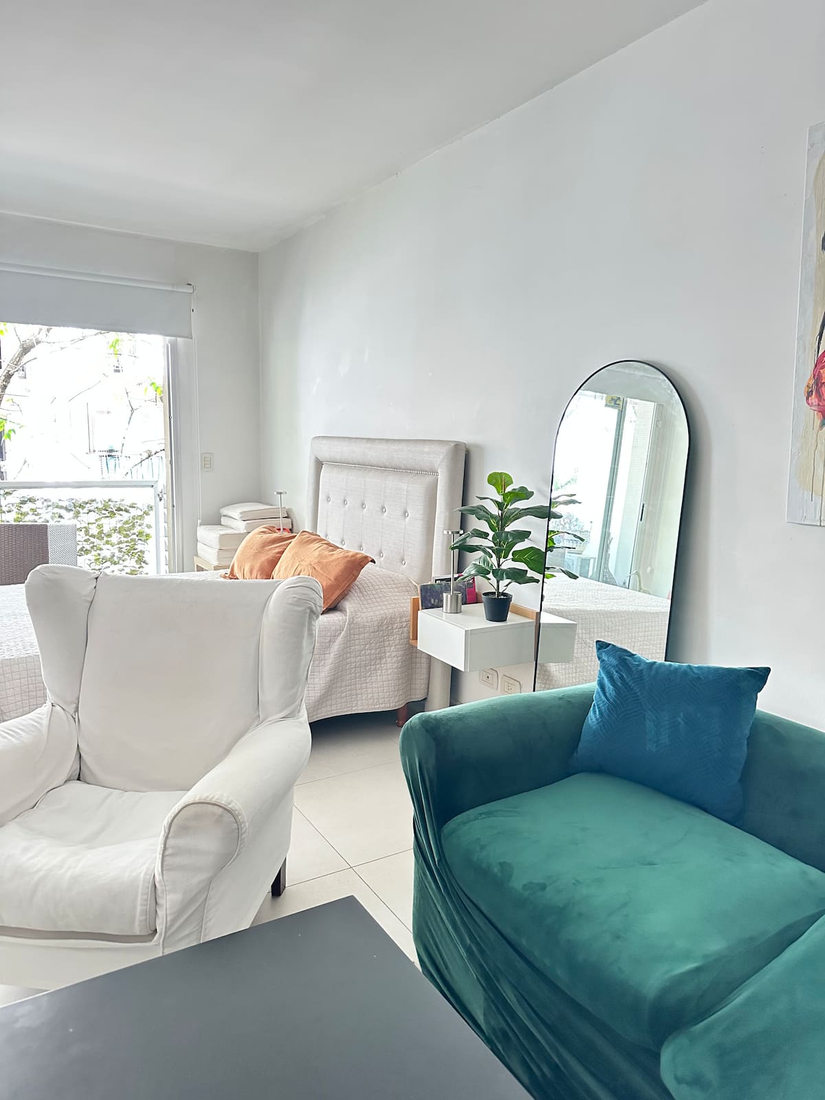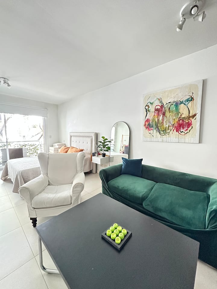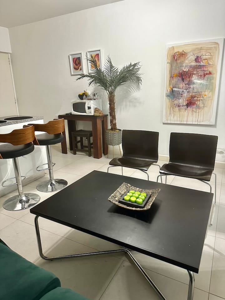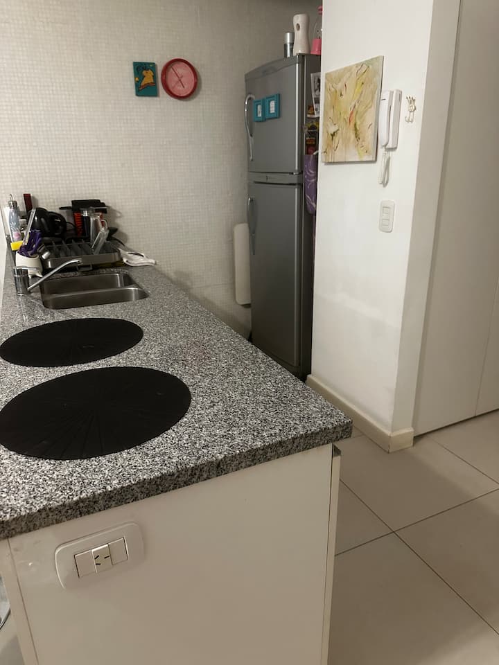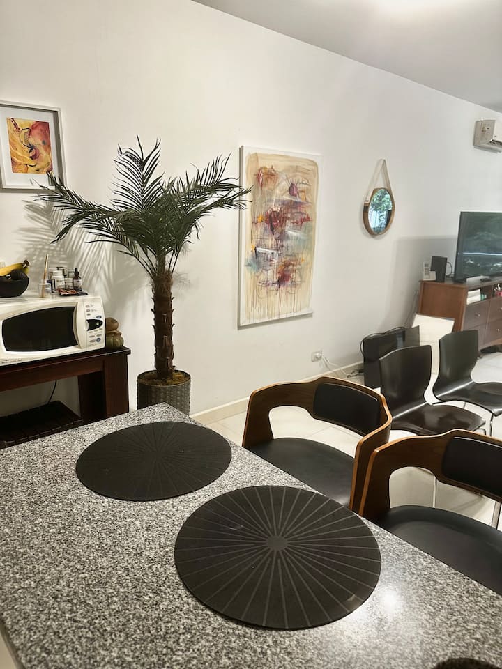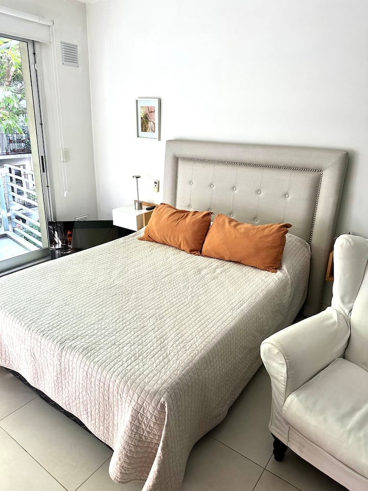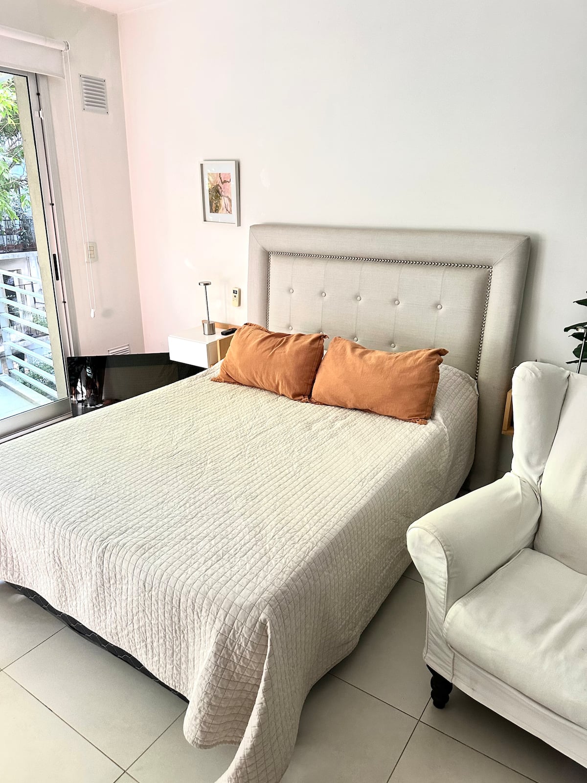 Monoambiente de departamento en Belgrano, con cama doble, ambiente comedor y cocina americana. Cuenta con heladera con freezer, microondas, horno y cocina eléctrica; aire acondicionado y estufa eléctrica. Hay lavandería de uso con fichas en planta baja, y parrilla en la terraza con reserva previa. Incluye Wi-Fi de alta velocidad y TV por cable. El acceso es al departamento completo.