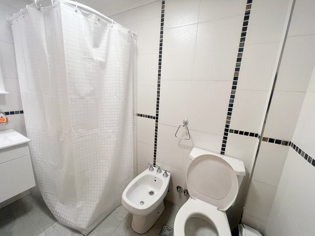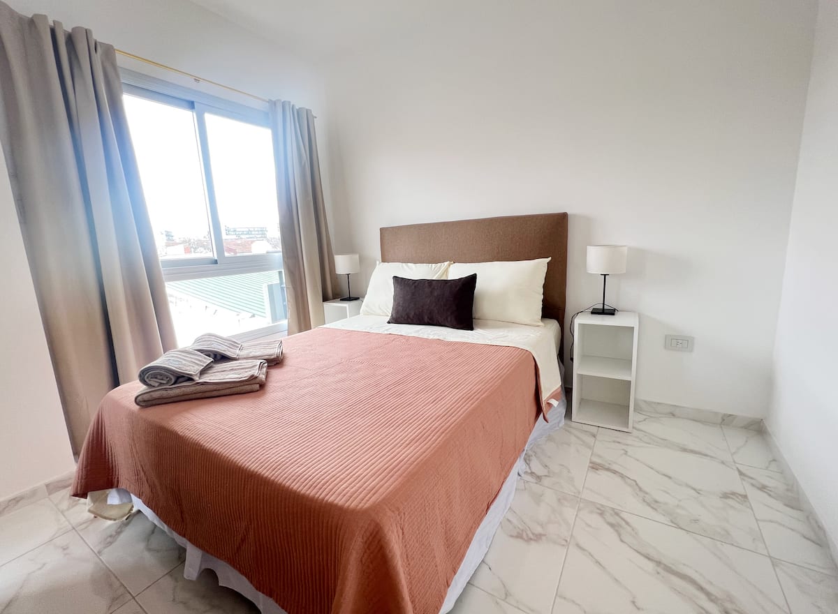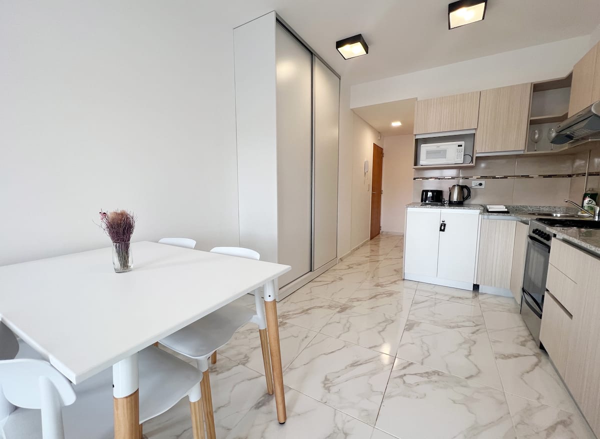 Monoambiente con balcón, con capacidad para 4 personas. Incluye mobiliario nuevo con cama, ropa de cama y toallas para cada huésped. Cuenta con internet de alta velocidad y TV por suscripción, cocina equipada con cafetera Nespresso y espumador, y está permitido el ingreso de mascotas pequeñas.