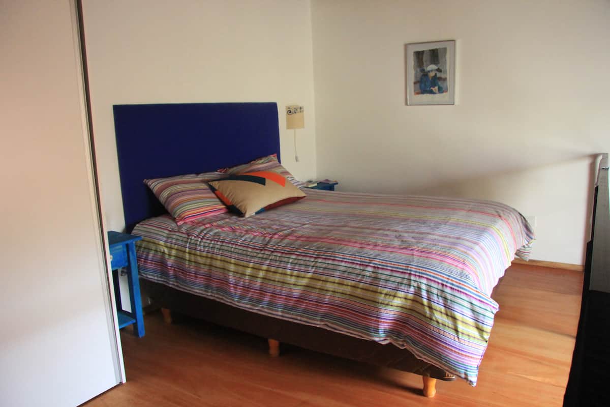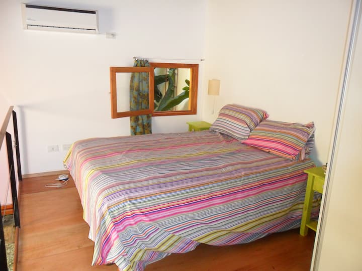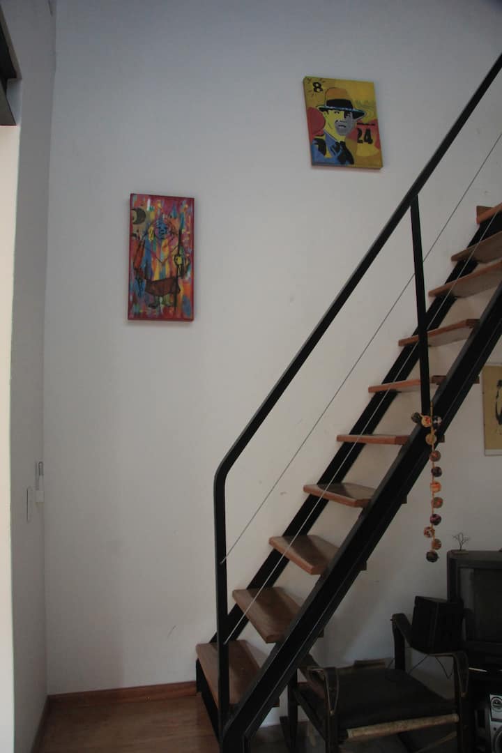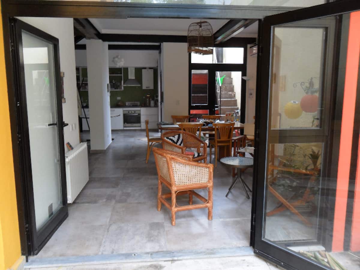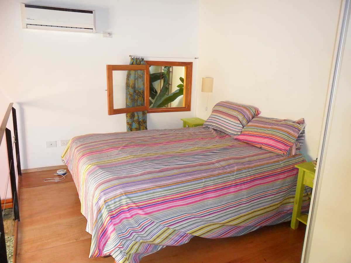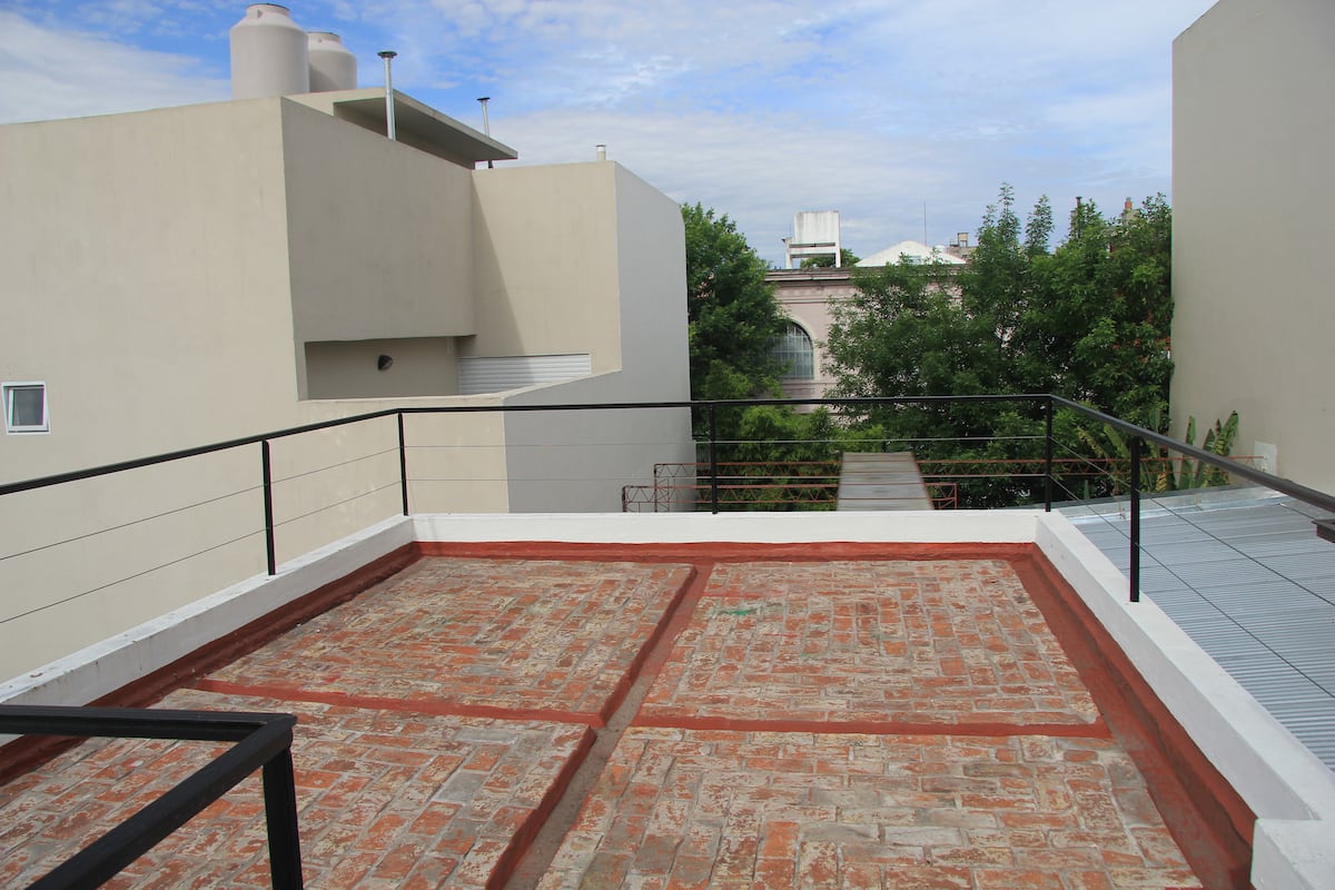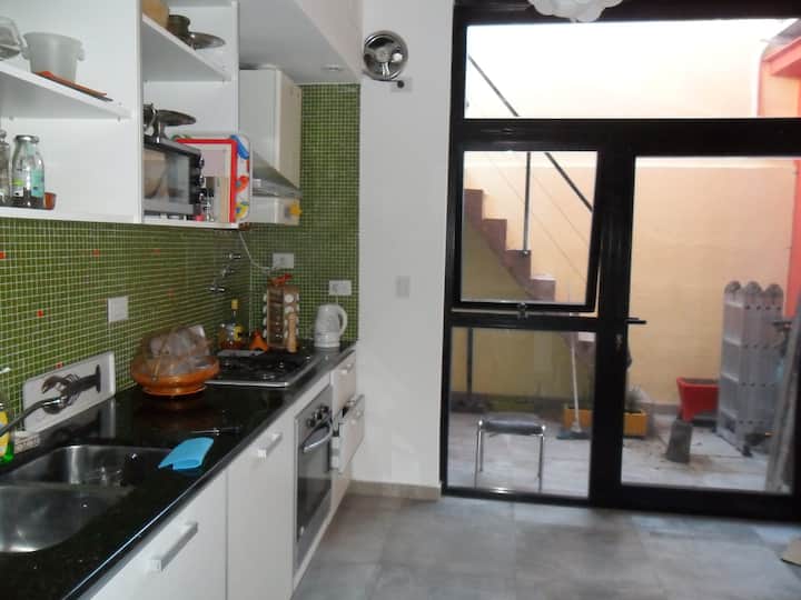 Casa tipo chorizo en Boedo. Dos habitaciones en alquiler (mínimo 5 días) con cama doble y placard; ambos espacios dan a un patio. En el entrepiso hay caja de seguridad. Las áreas comunes son cocina, living y sector de TV, parrilla y terraza. Tiene calefacción central, aire acondicionado en todos los ambientes e internet.