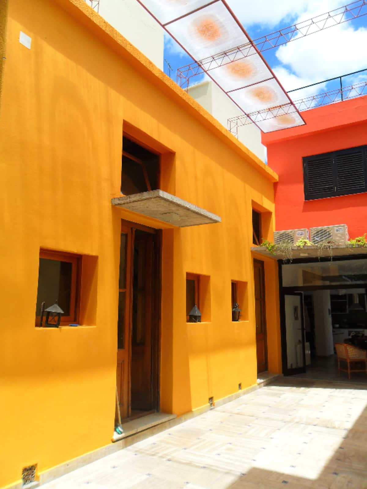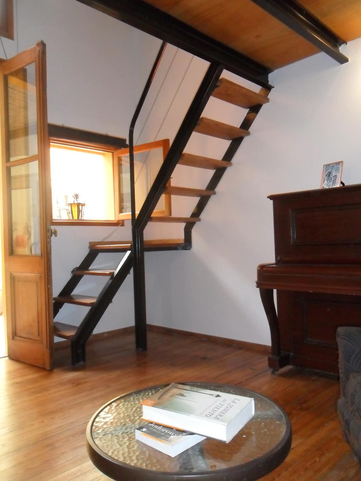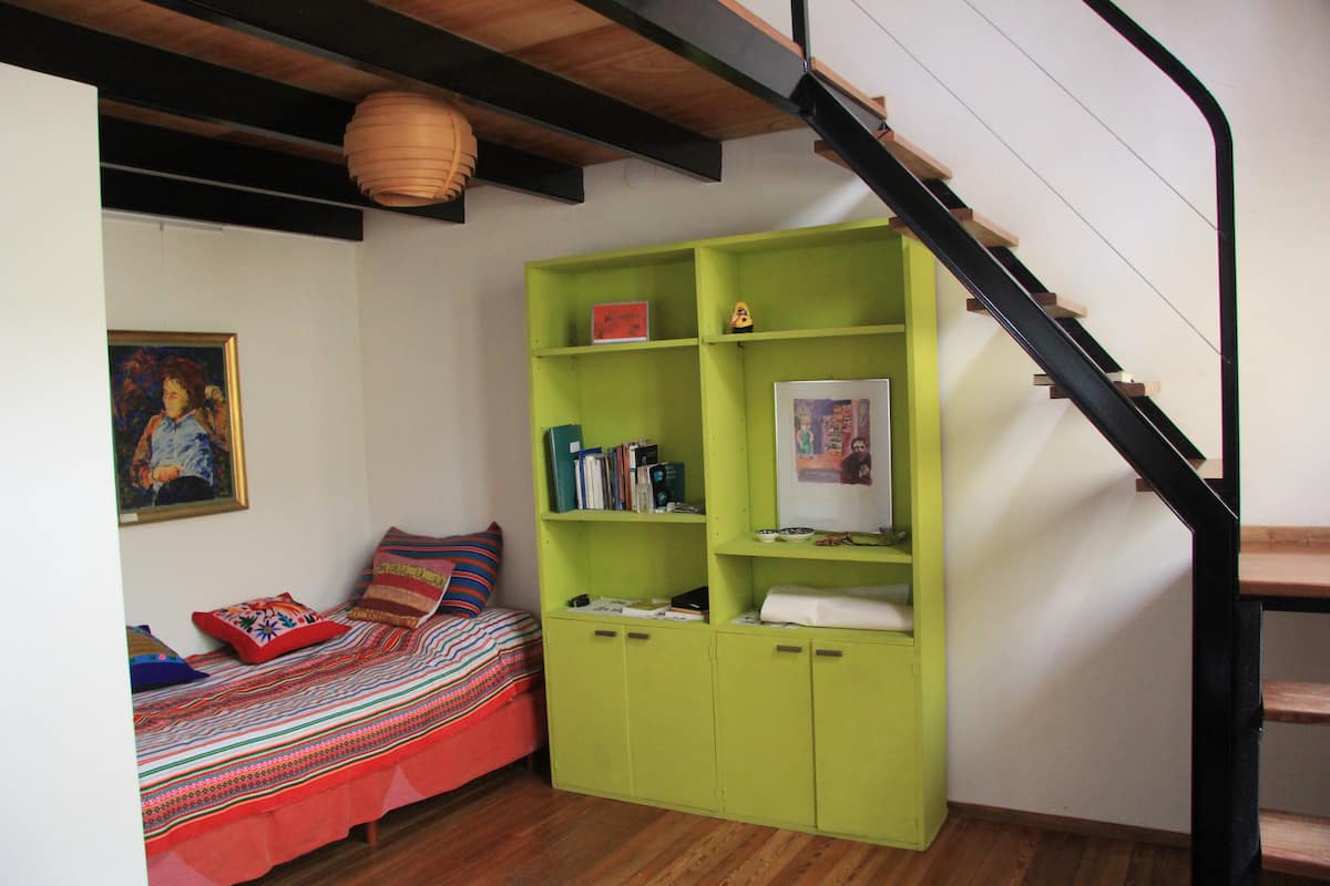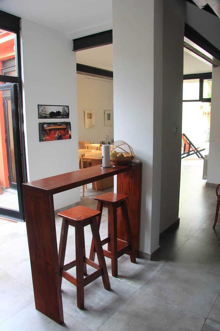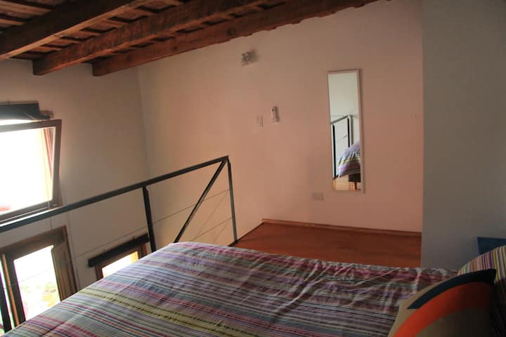 Casa tipo chorizo en Boedo. Dos habitaciones en alquiler (mínimo 5 días) con cama doble y placard; ambos espacios dan a un patio. En el entrepiso hay caja de seguridad. Las áreas comunes son cocina, living y sector de TV, parrilla y terraza. Tiene calefacción central, aire acondicionado en todos los ambientes e internet.