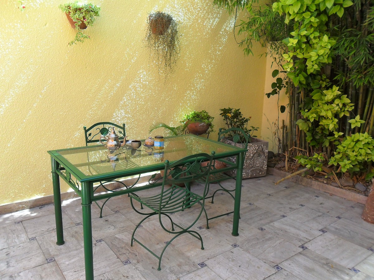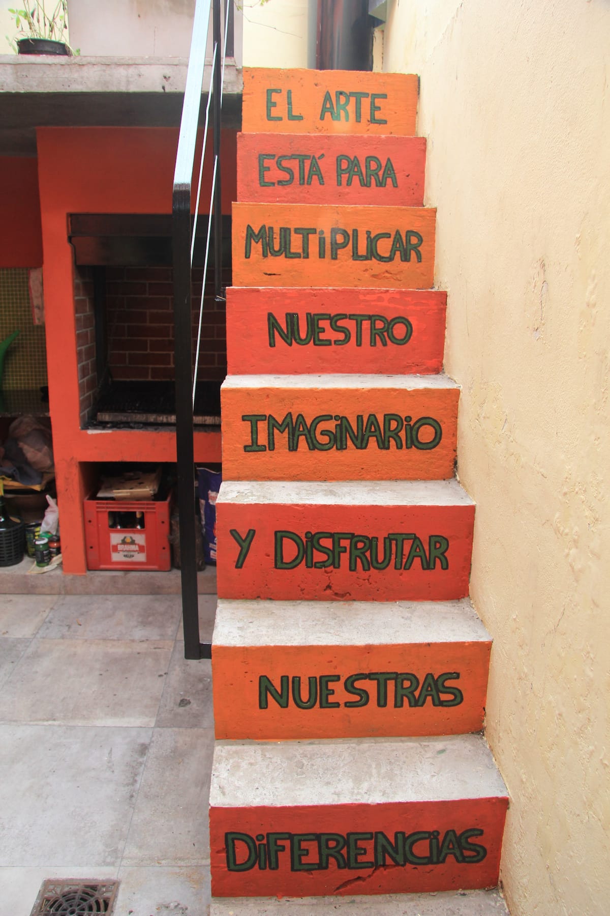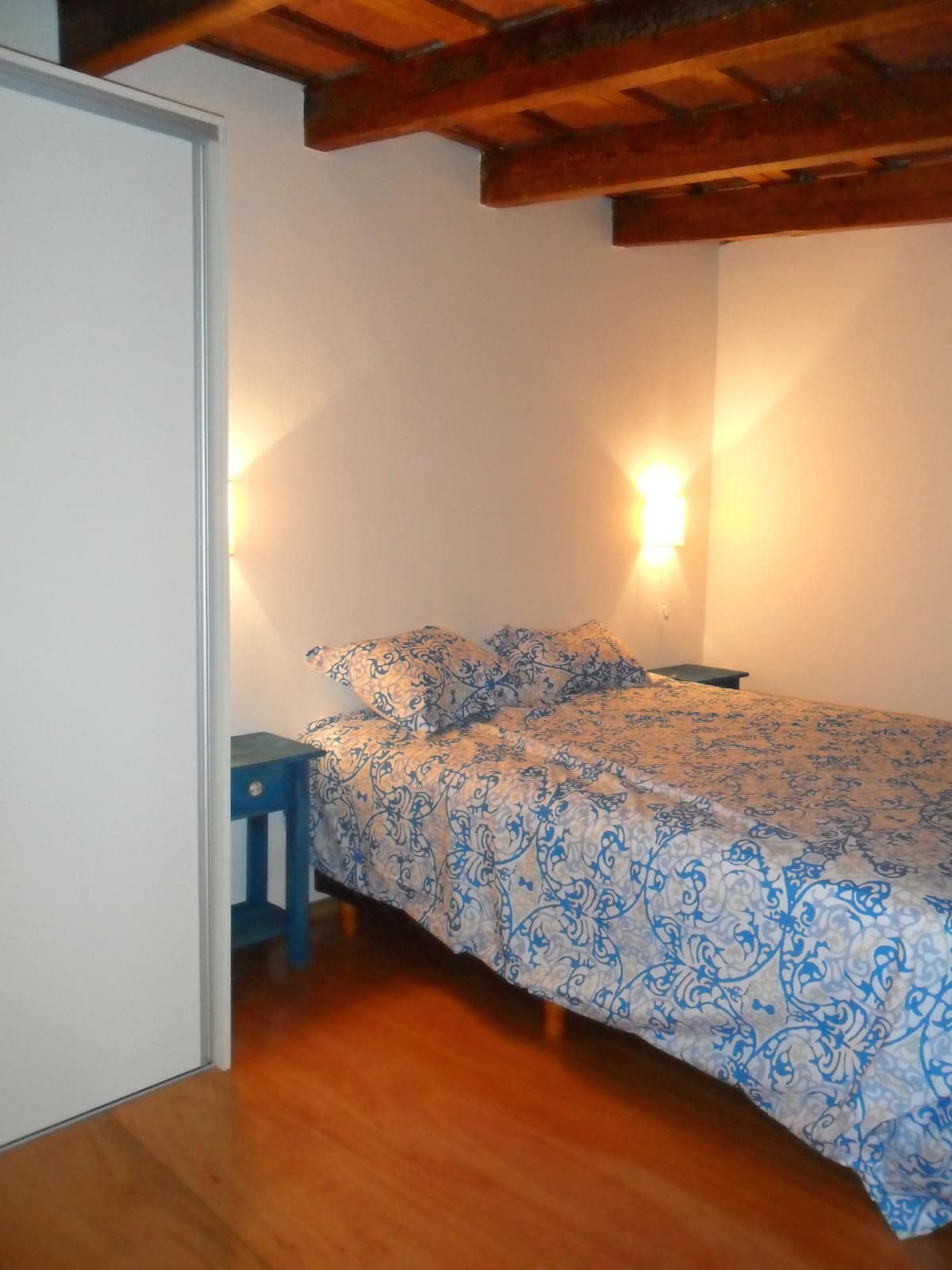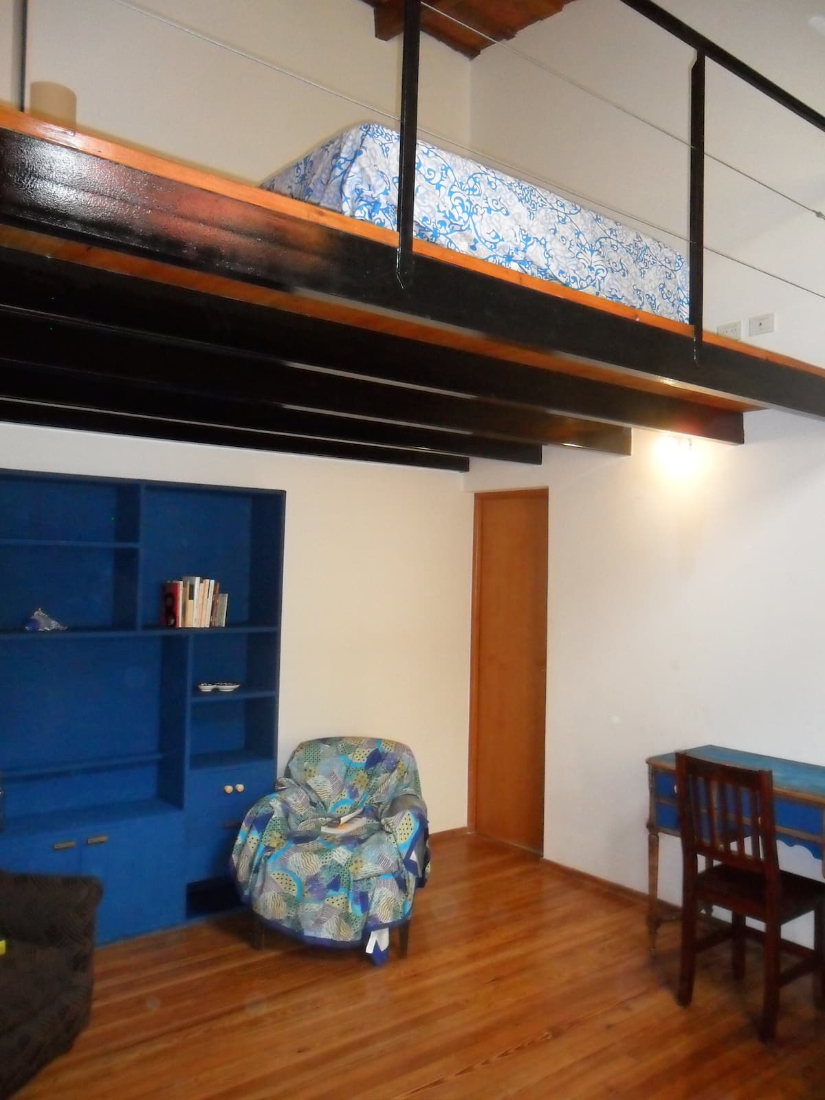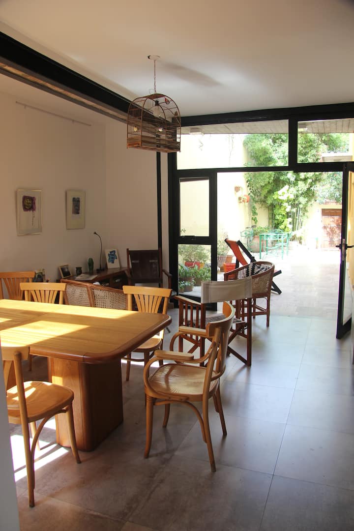 Casa tipo chorizo en Boedo. Dos habitaciones en alquiler (mínimo 5 días) con cama doble y placard; ambos espacios dan a un patio. En el entrepiso hay caja de seguridad. Las áreas comunes son cocina, living y sector de TV, parrilla y terraza. Tiene calefacción central, aire acondicionado en todos los ambientes e internet.