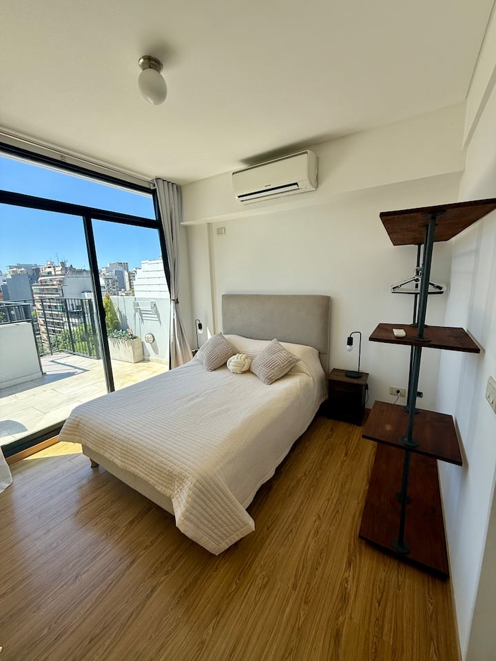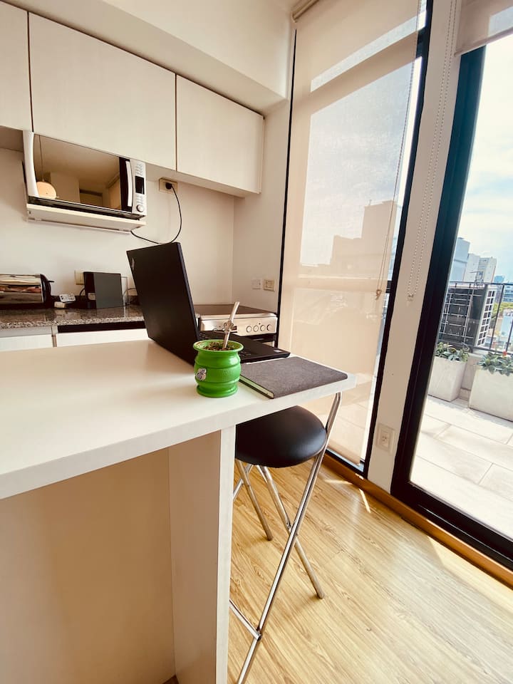 Departamento tipo monoambiente en el último piso en Caballito. Cuenta con balcón y acceso directo desde el ascensor a un hall privado. Se ubica a 200 m de subte y de líneas de colectivos, con acceso rápido a autopistas.