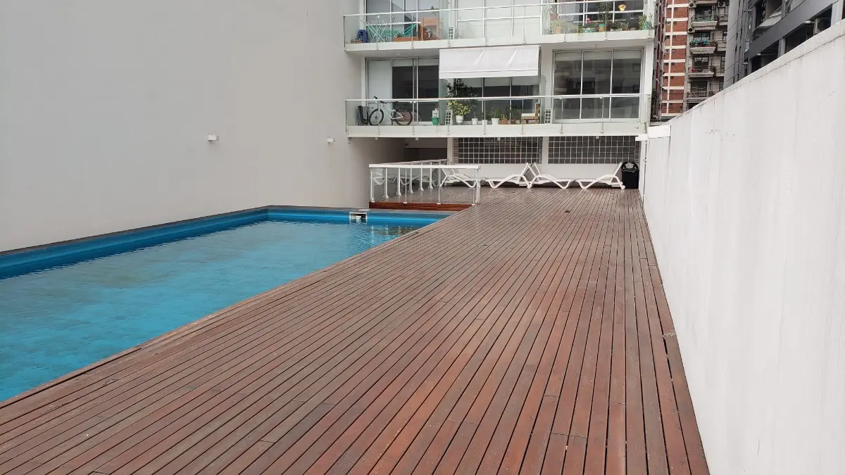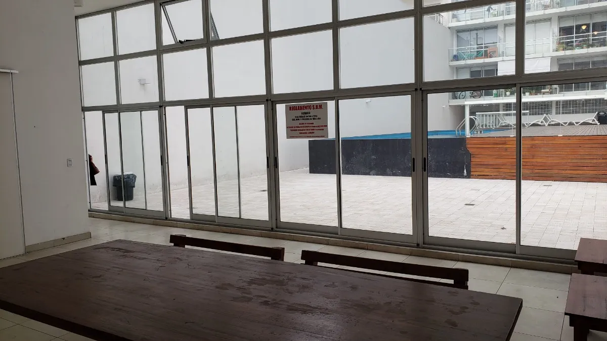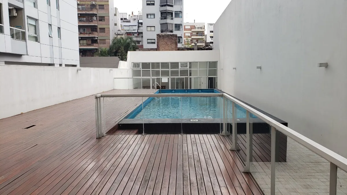 Departamento de 2 ambientes de 1 dormitorio en un 4to piso al frente, con balcón y orientación ENE. Cuenta con cocina concepto abierto con desayunador, baño completo, 2 aires acondicionado frío/calor y placares en dormitorio y hall de entrada. El edificio dispone de laundry, solárium de aprox. 10 m x 30 m, pileta de aprox. 6 m x 18 m, SUM y parrilla. Para alquiler, el valor publicado es u$s 700 mensuales; cochera u$s 100 mensuales; expensas y ABL incluidos, con actualización trimestral según IPC