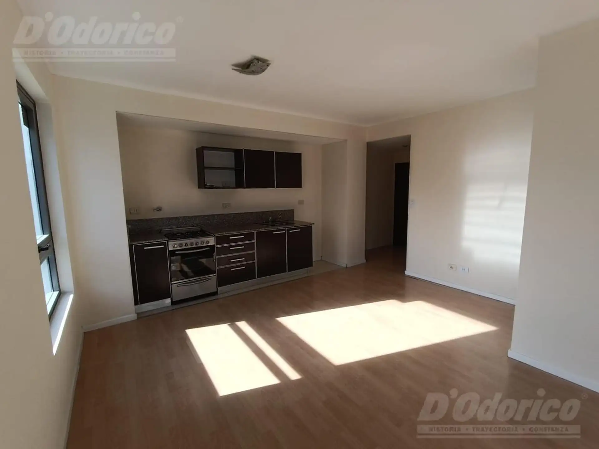 One-bedroom apartment for rent in Caballito, street-facing and north-facing, in Torres Caballito Nuevo (Torre 2). The unit has a living-dining area with access to a balcony, an integrated kitchen, a full bathroom, and a bedroom with a built-in wardrobe; floating floors. The complex offers 24-hour security and concierge services, a double-height lobby, high-speed elevators, an on-site garden, perimeter security, a communal room on the 34th floor, laundry, bike storage, a generator, solarium, pool