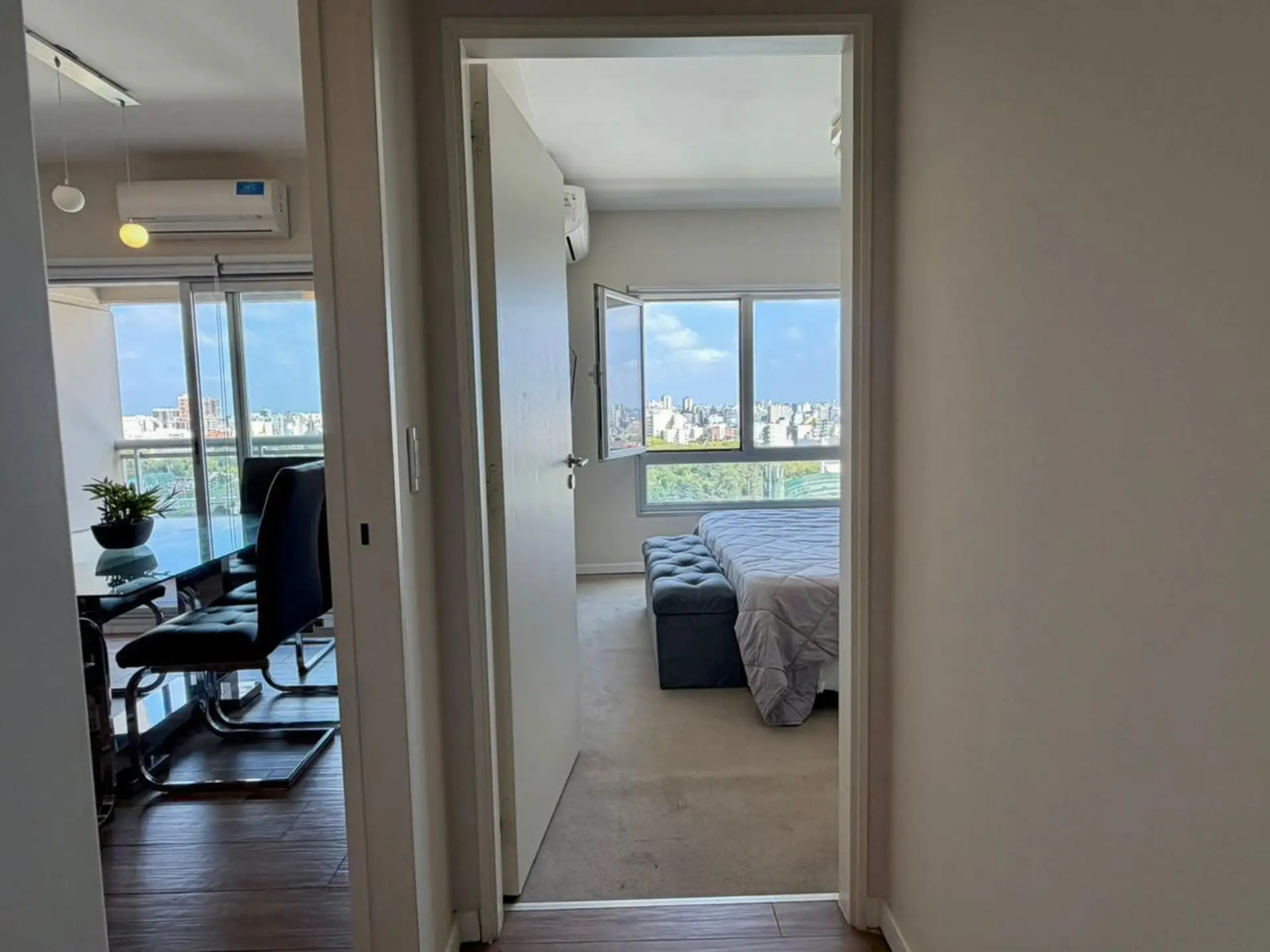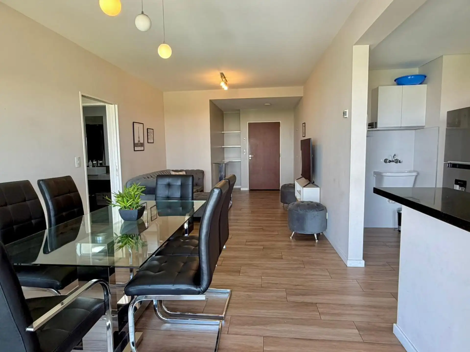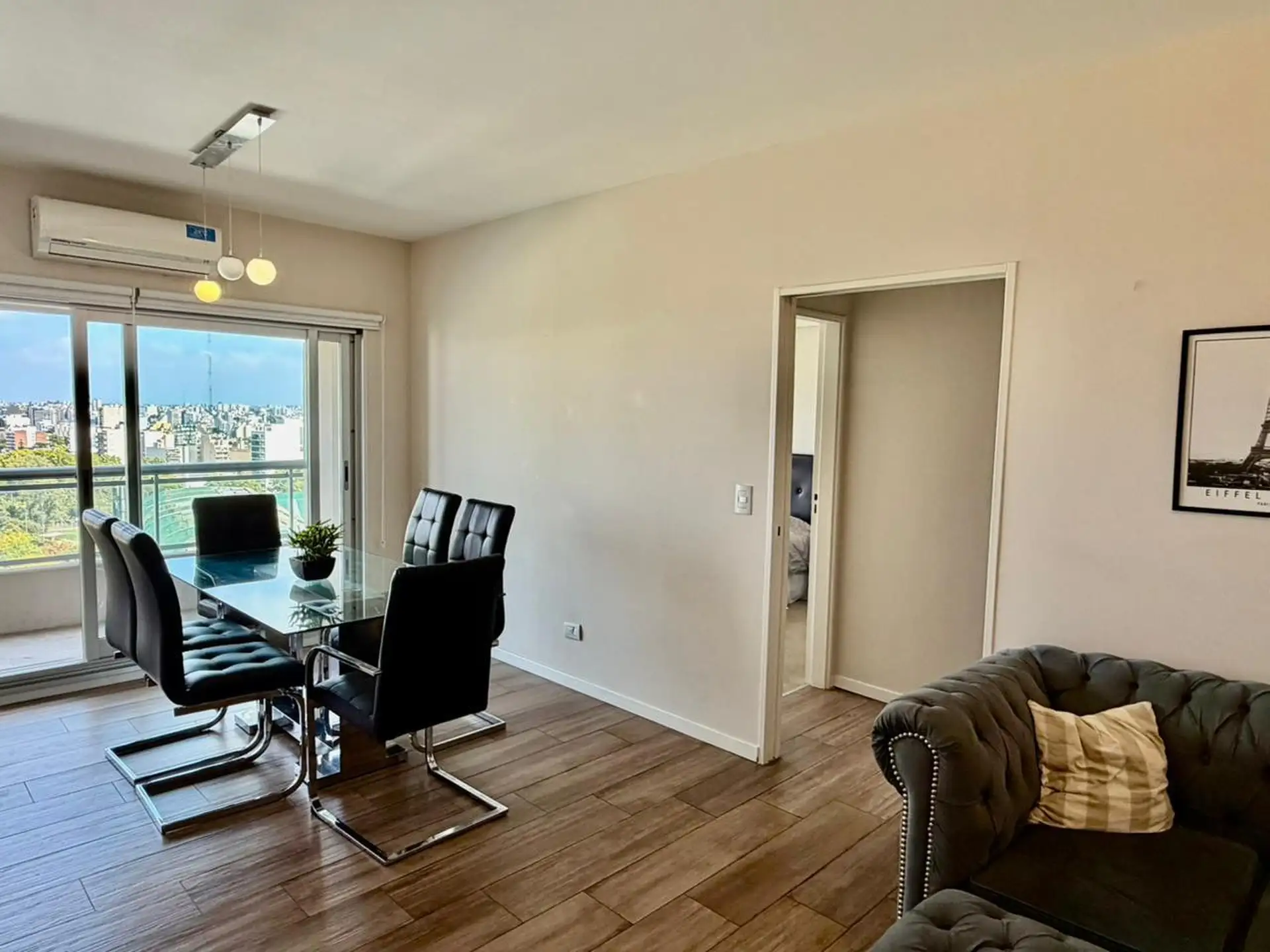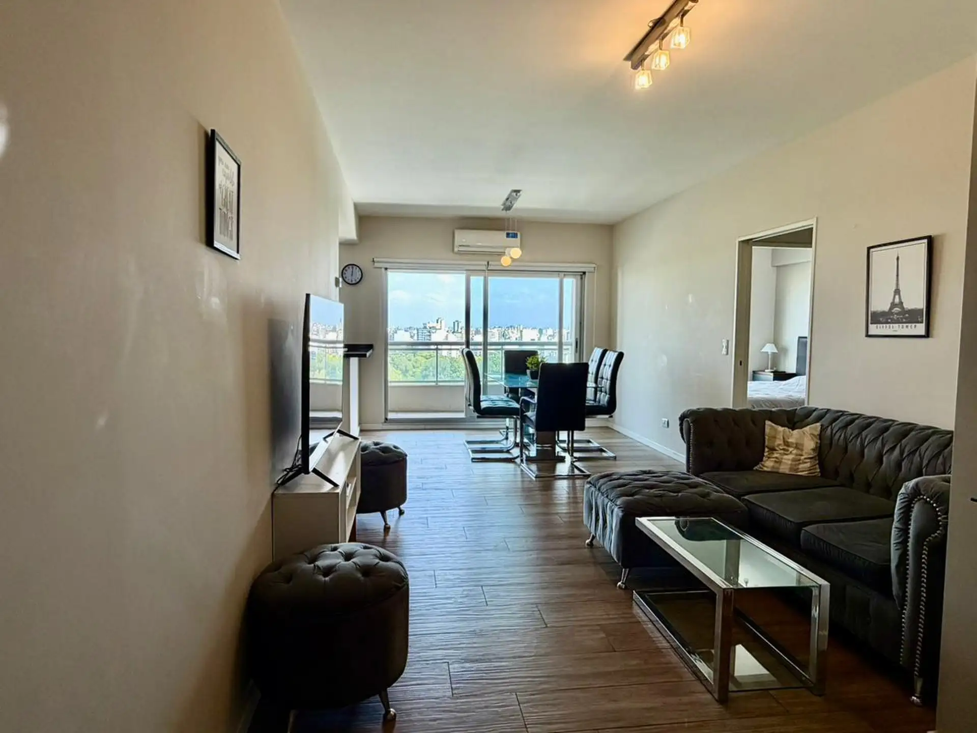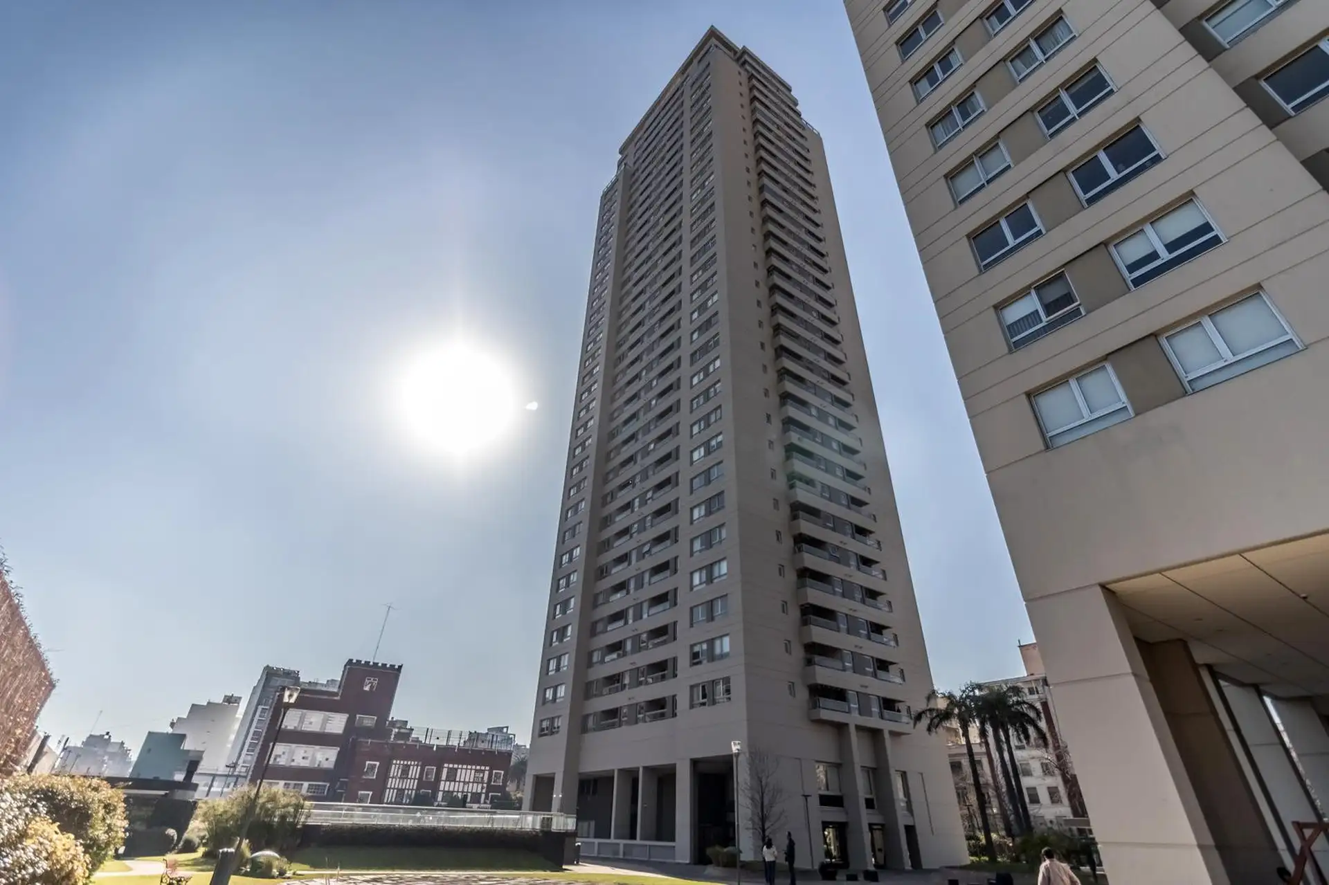 Departamento de 2 ambientes amoblado de 55 m² en el piso 14, con balcón y vista panorámica. Cuenta con living comedor con cocina integrada, barra desayunadora y lavadero incorporado, dormitorio con placard, y baño completo con bañera y mampara de blindex. Incluye piso flotante, caldera individual dual para agua caliente y calefacción por piso radiante, además de amplios ventanales. El edificio Dos Plaza tiene 10.500 m² de parque propio, quinchos individuales con parrilla, pileta para adultos y n