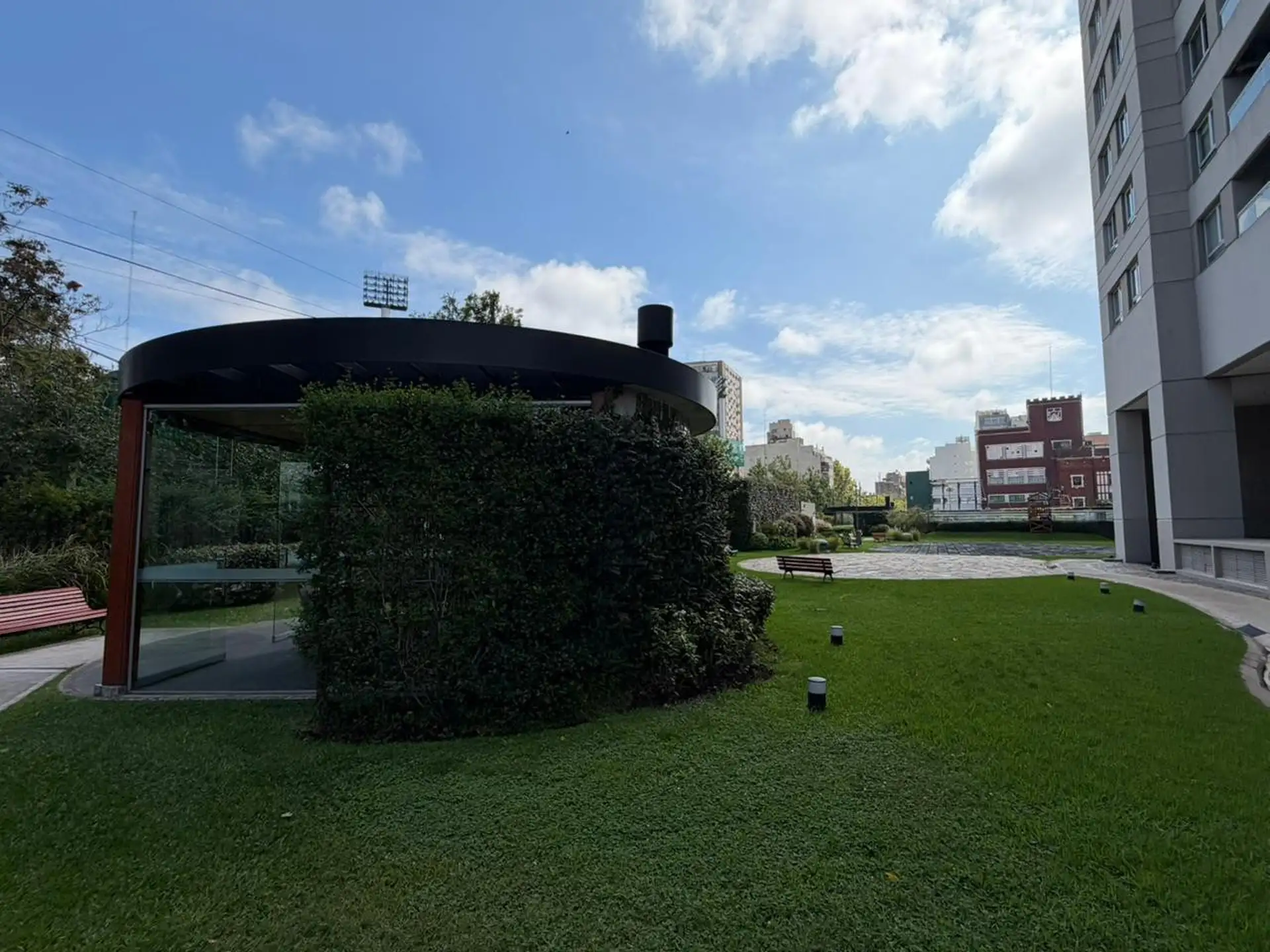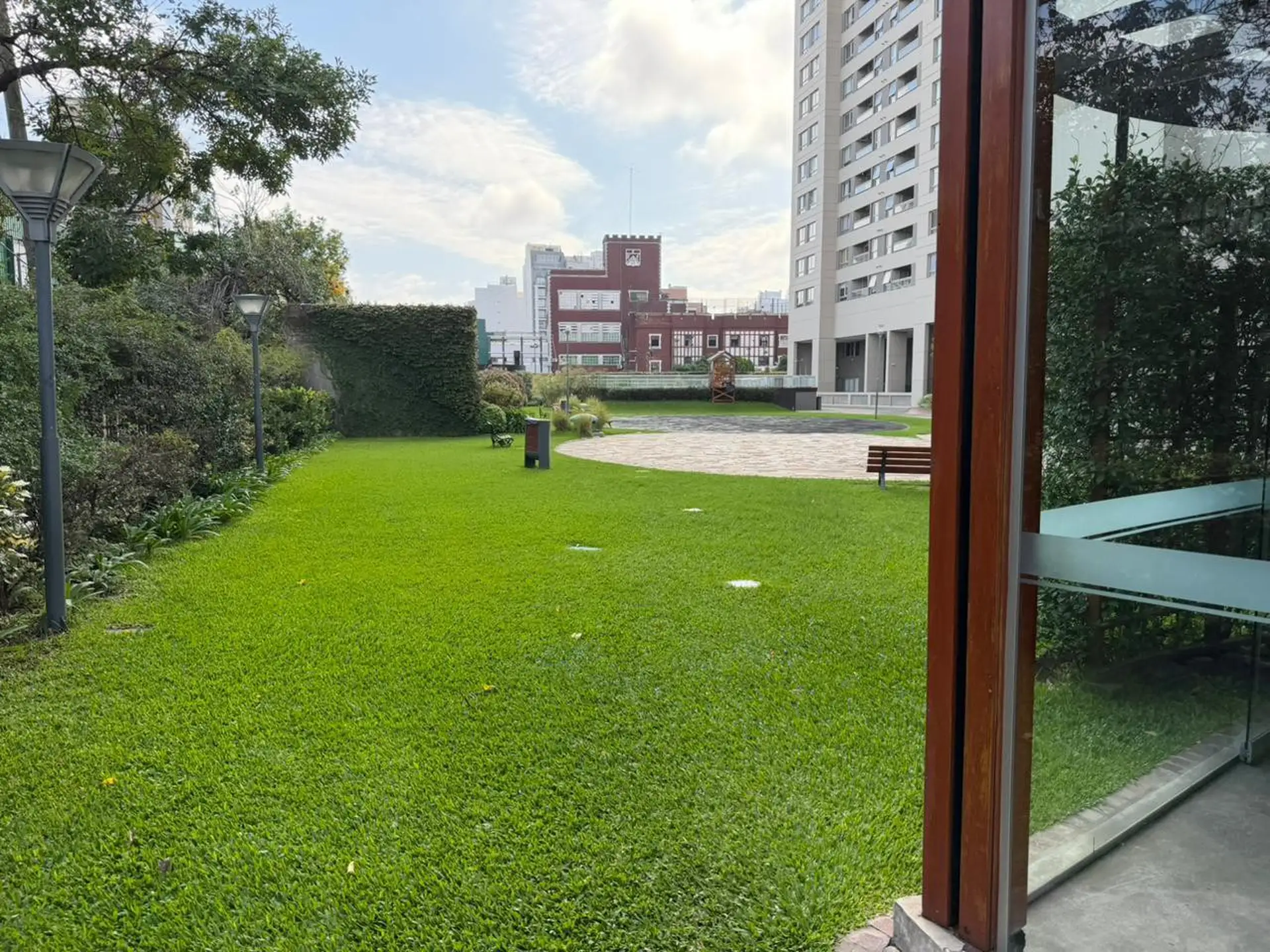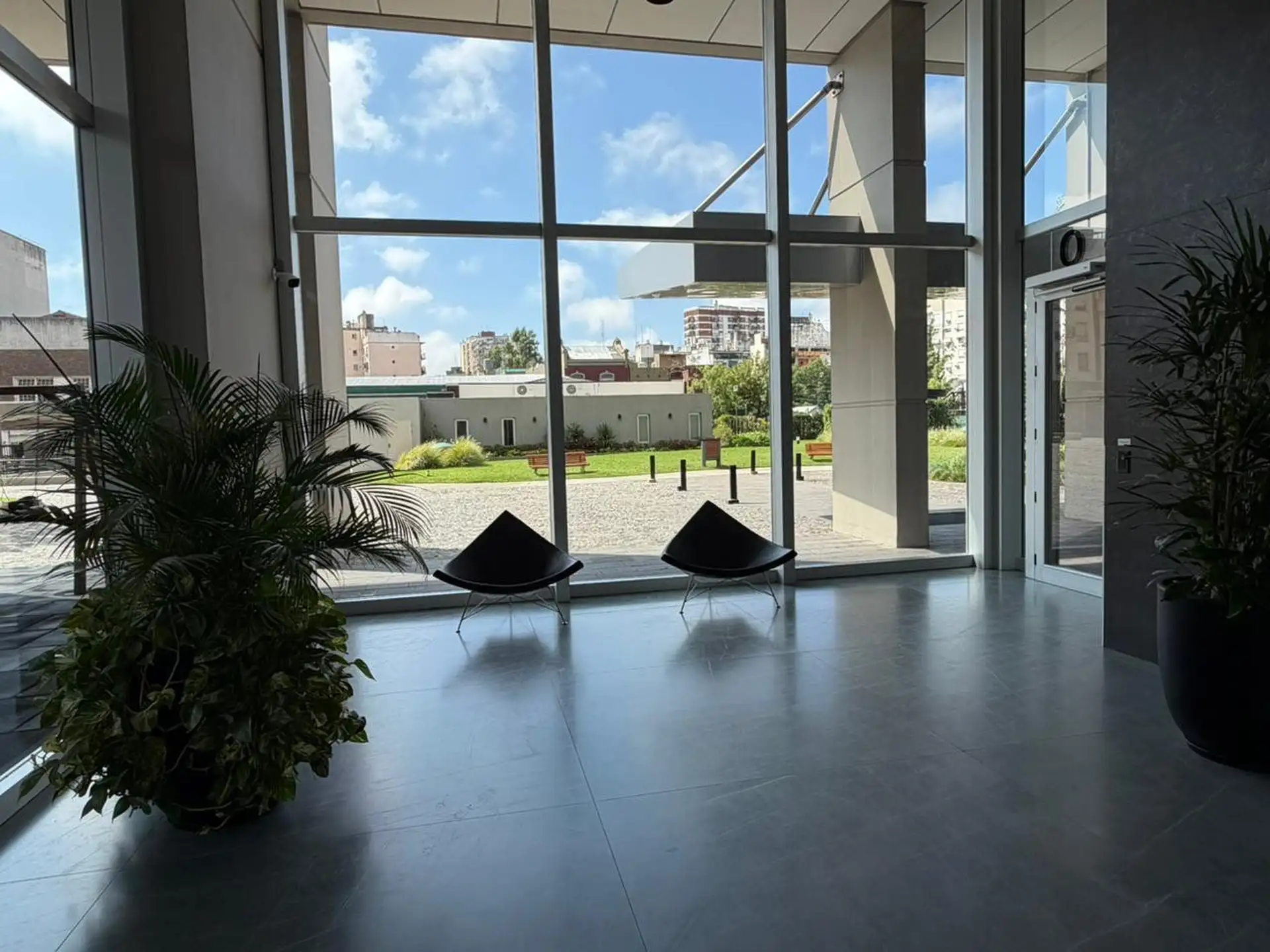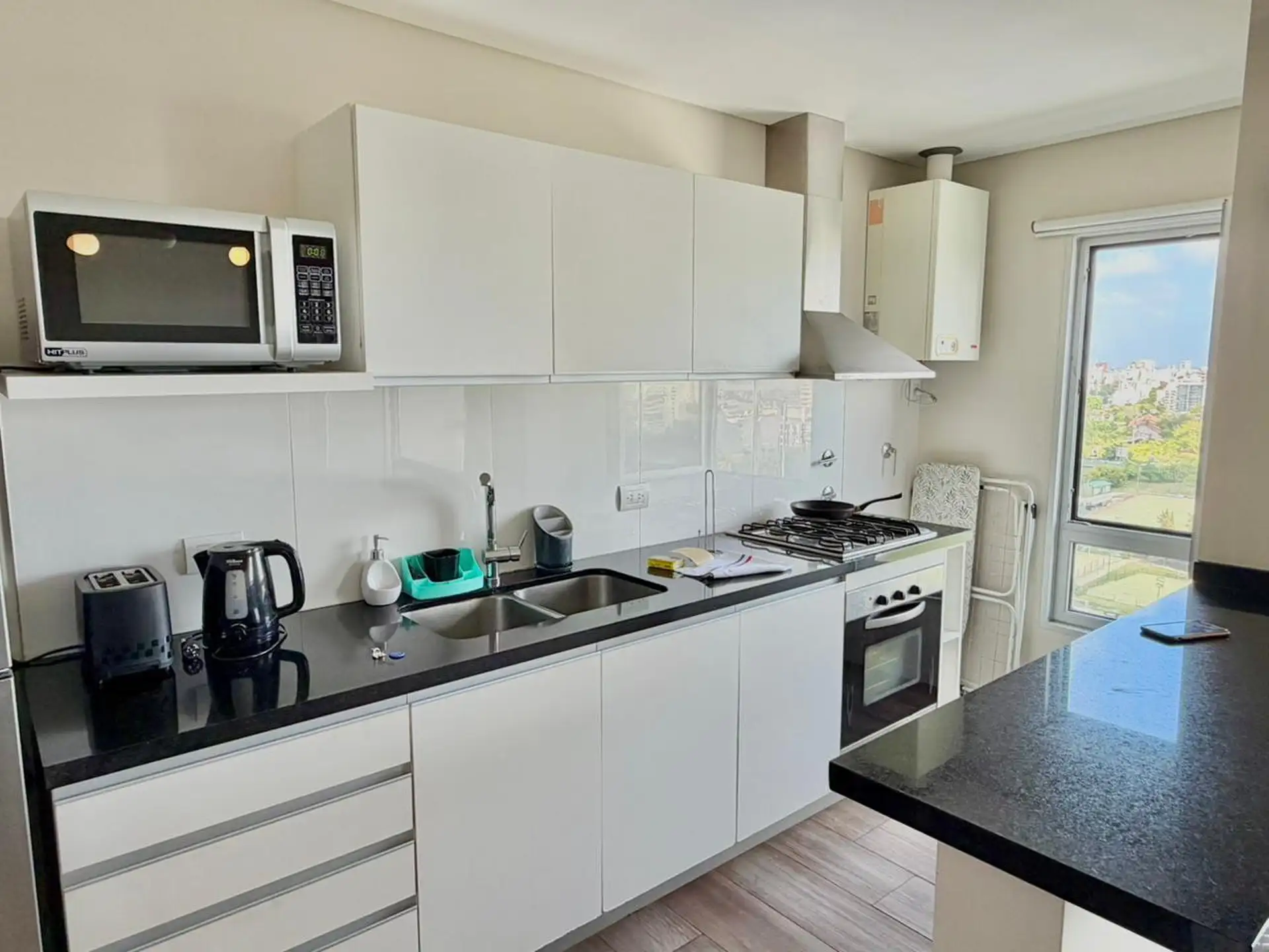 Departamento de 2 ambientes amoblado de 55 m² en el piso 14, con balcón y vista panorámica. Cuenta con living comedor con cocina integrada, barra desayunadora y lavadero incorporado, dormitorio con placard, y baño completo con bañera y mampara de blindex. Incluye piso flotante, caldera individual dual para agua caliente y calefacción por piso radiante, además de amplios ventanales. El edificio Dos Plaza tiene 10.500 m² de parque propio, quinchos individuales con parrilla, pileta para adultos y n