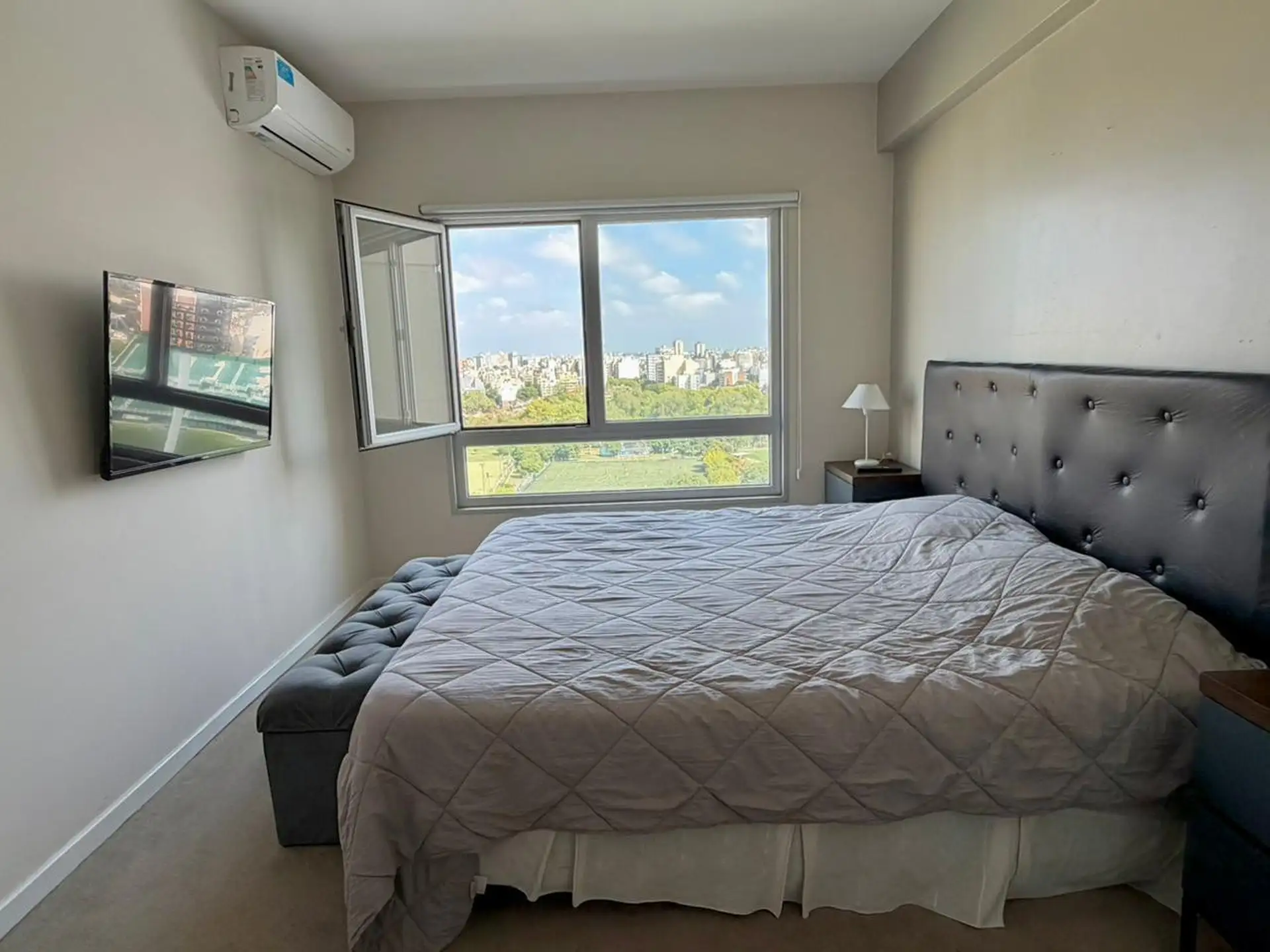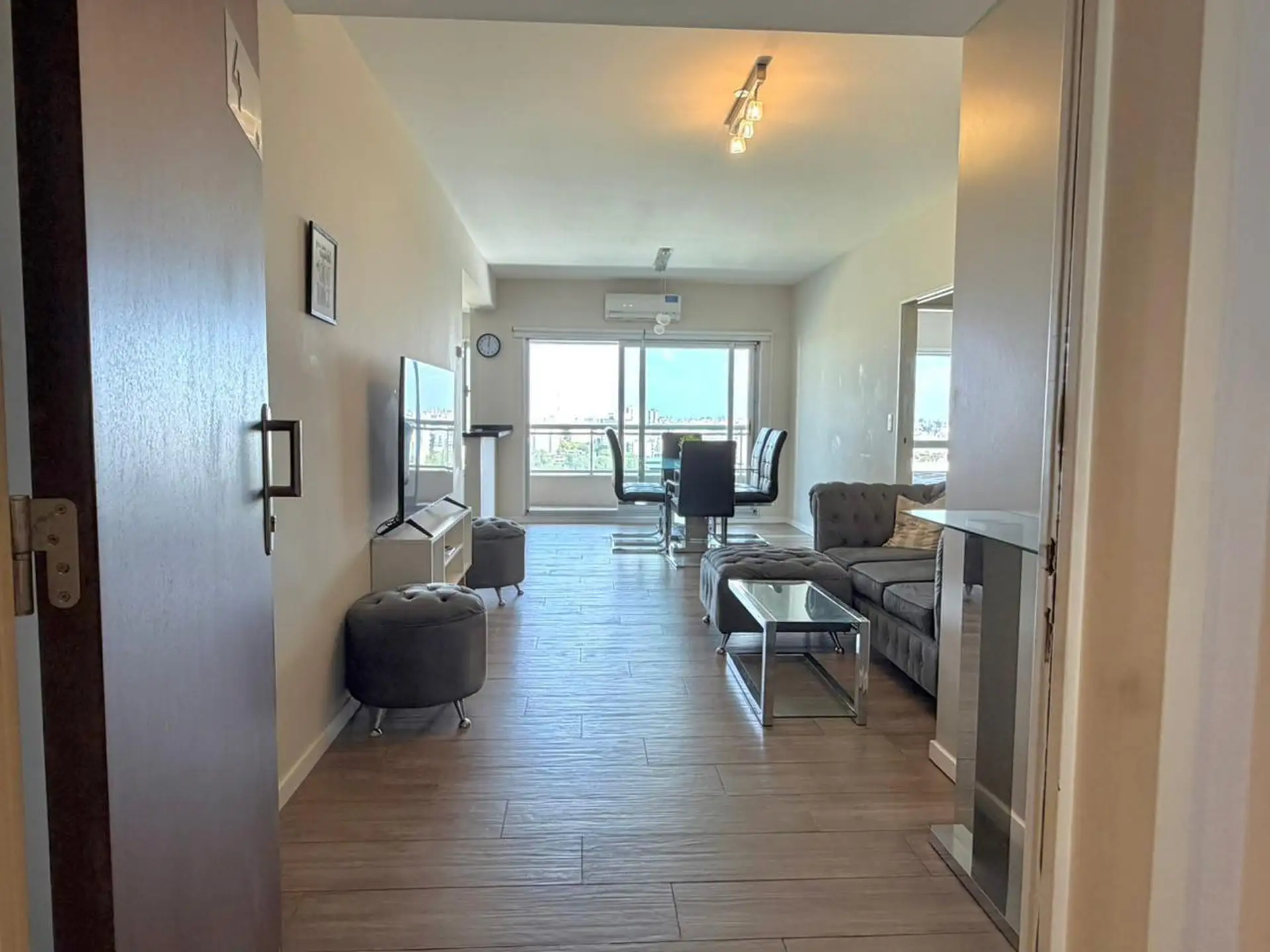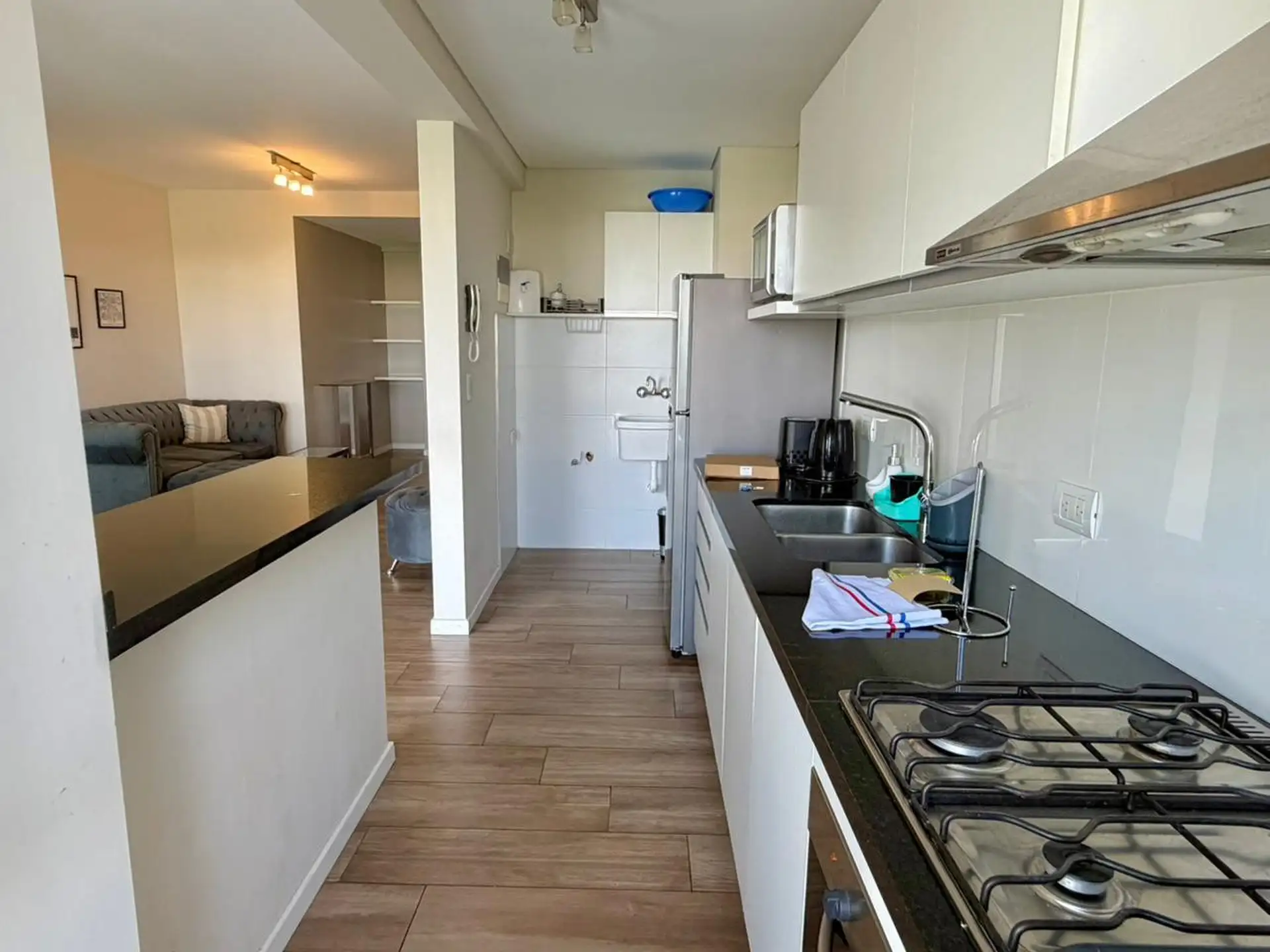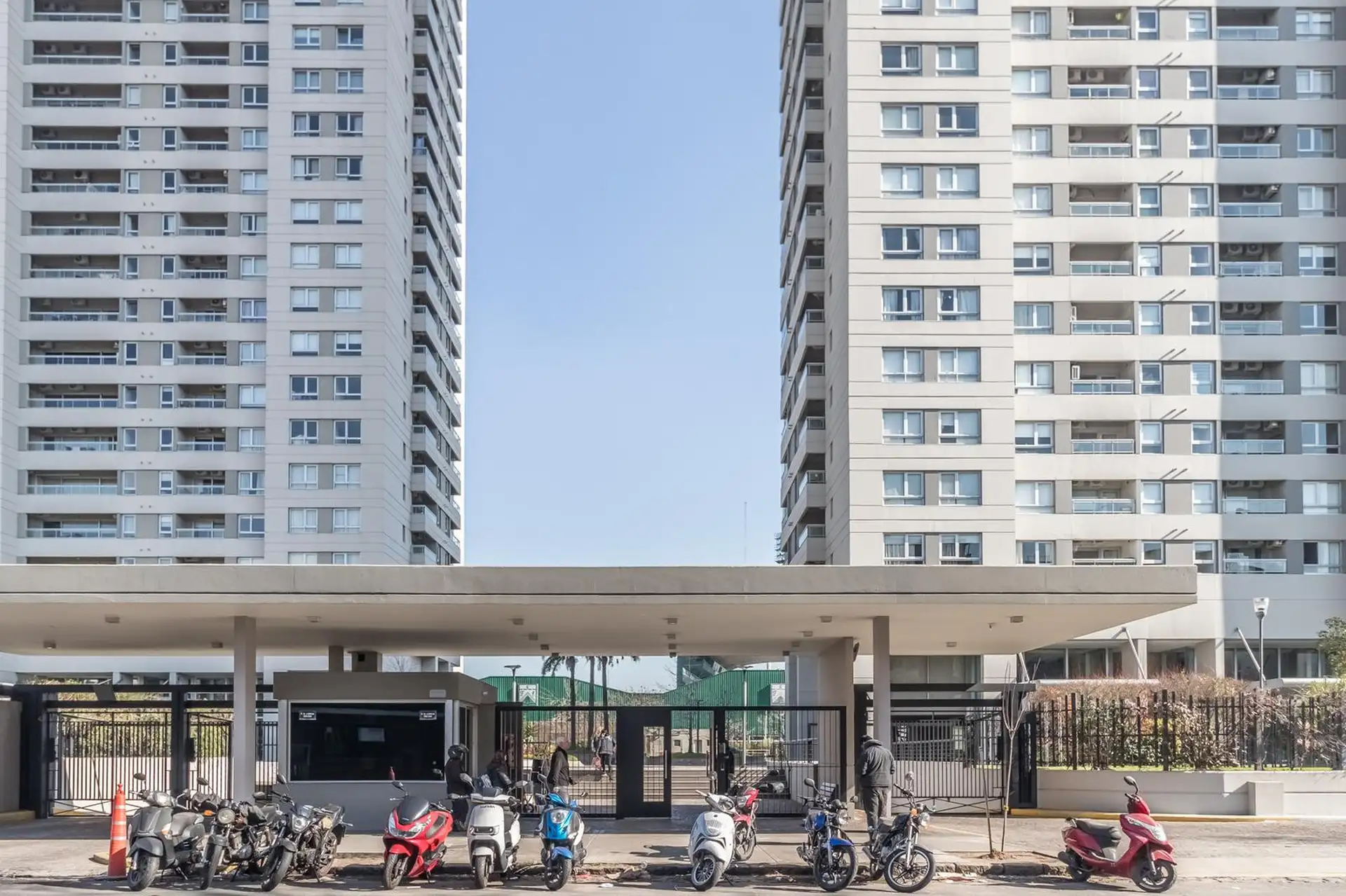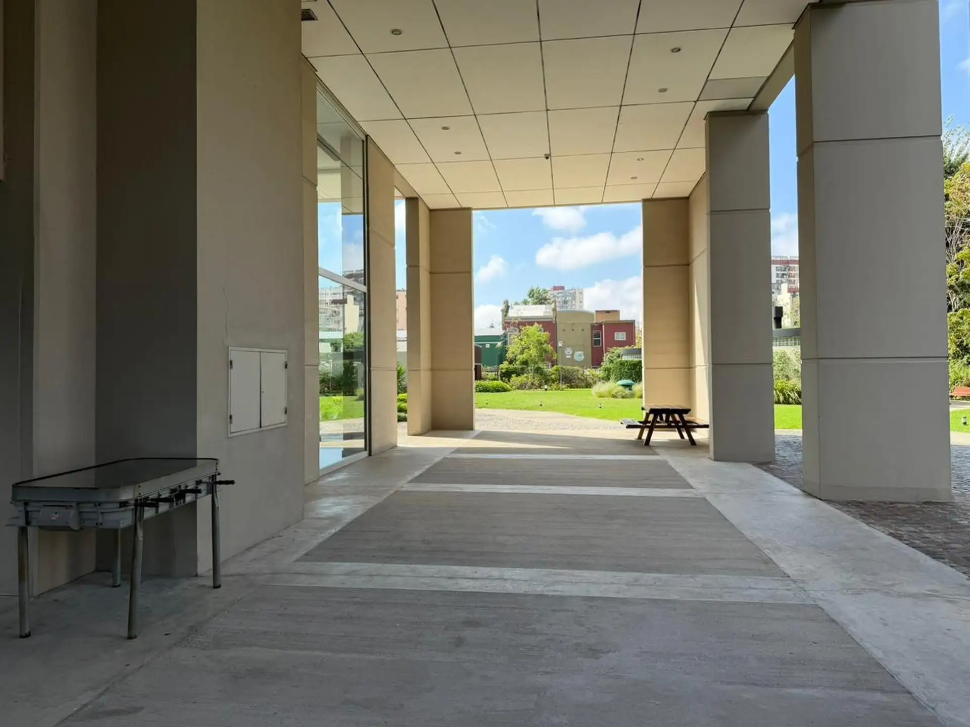 Departamento de 2 ambientes amoblado de 55 m² en el piso 14, con balcón y vista panorámica. Cuenta con living comedor con cocina integrada, barra desayunadora y lavadero incorporado, dormitorio con placard, y baño completo con bañera y mampara de blindex. Incluye piso flotante, caldera individual dual para agua caliente y calefacción por piso radiante, además de amplios ventanales. El edificio Dos Plaza tiene 10.500 m² de parque propio, quinchos individuales con parrilla, pileta para adultos y n