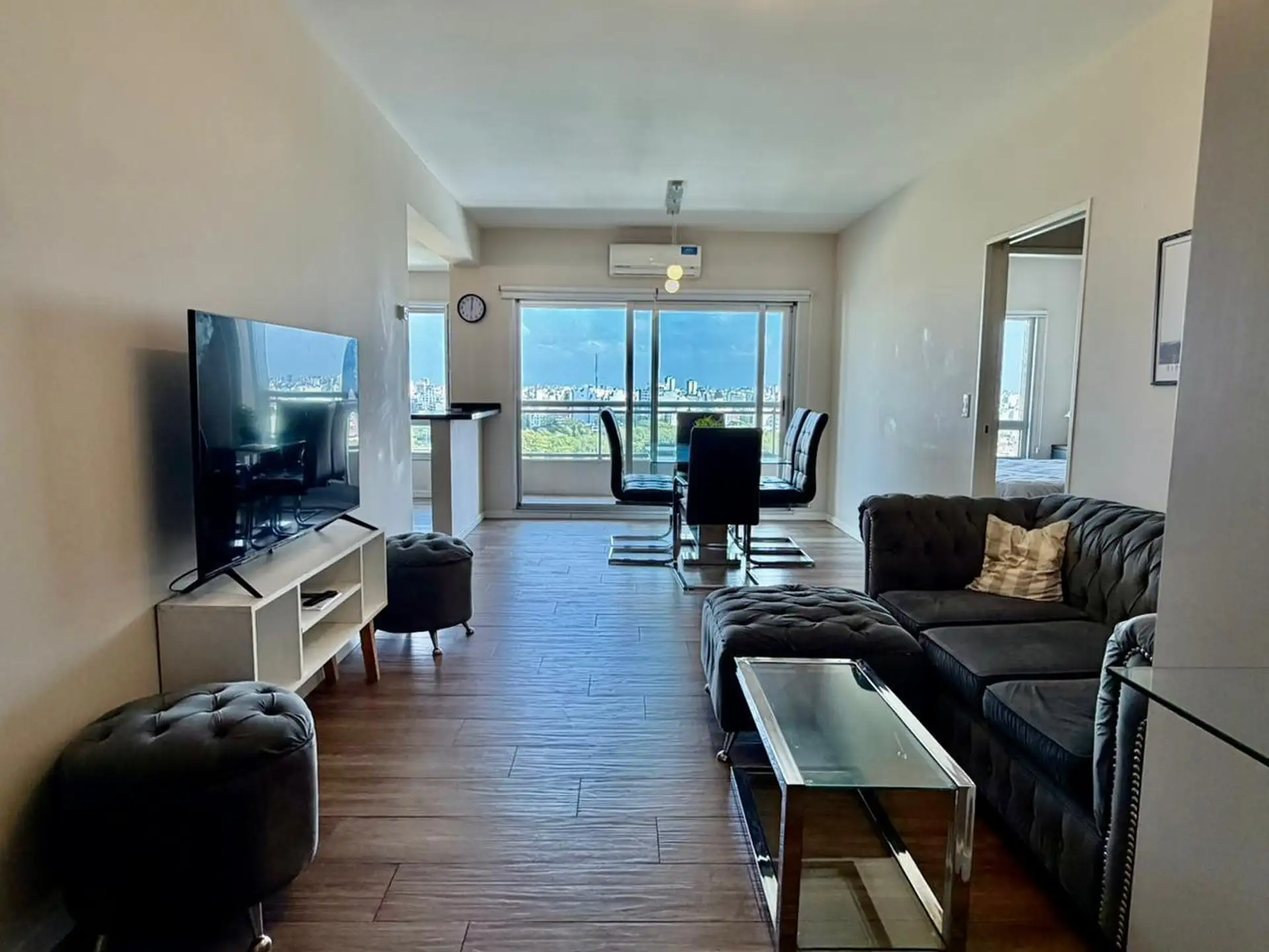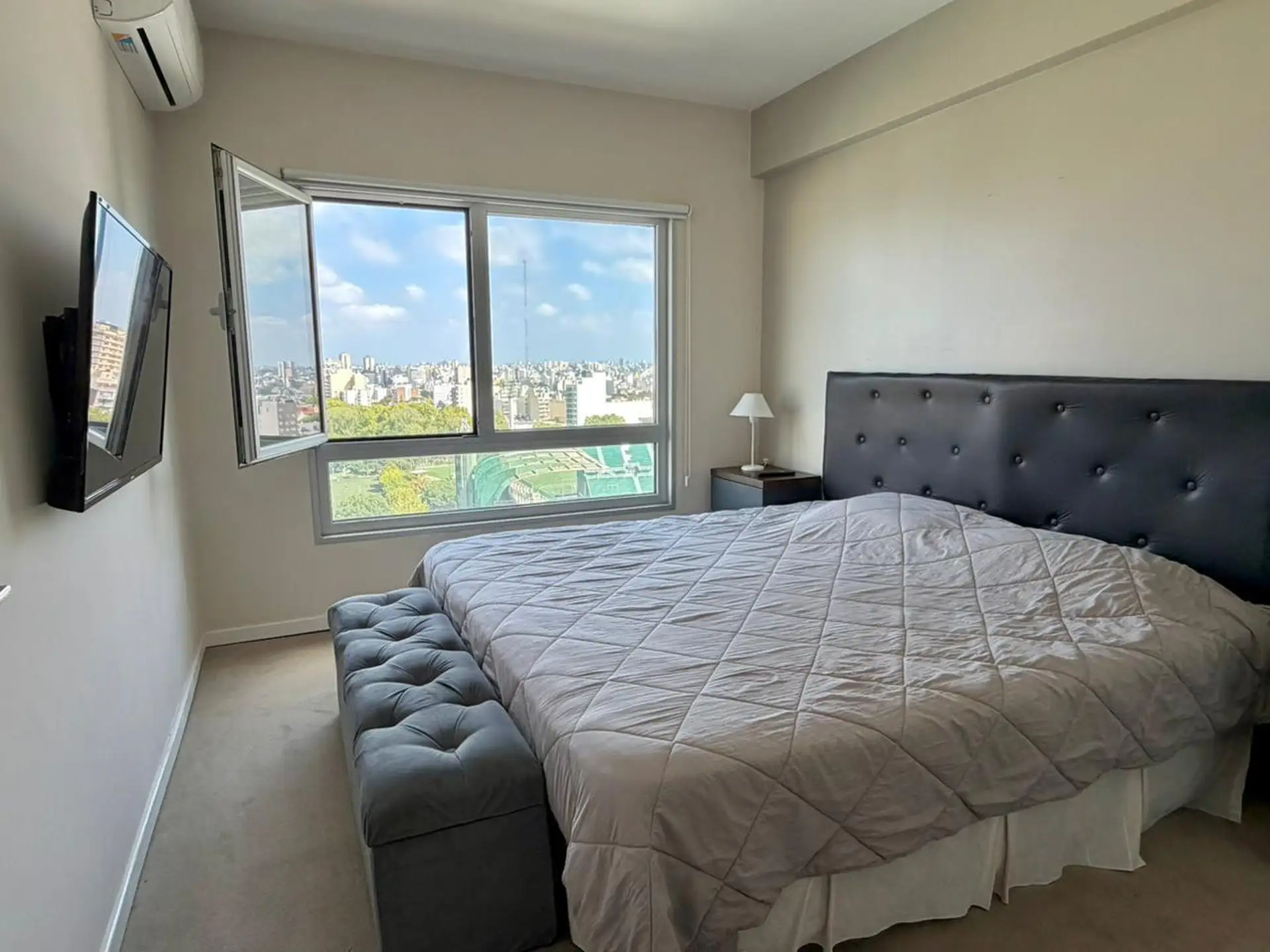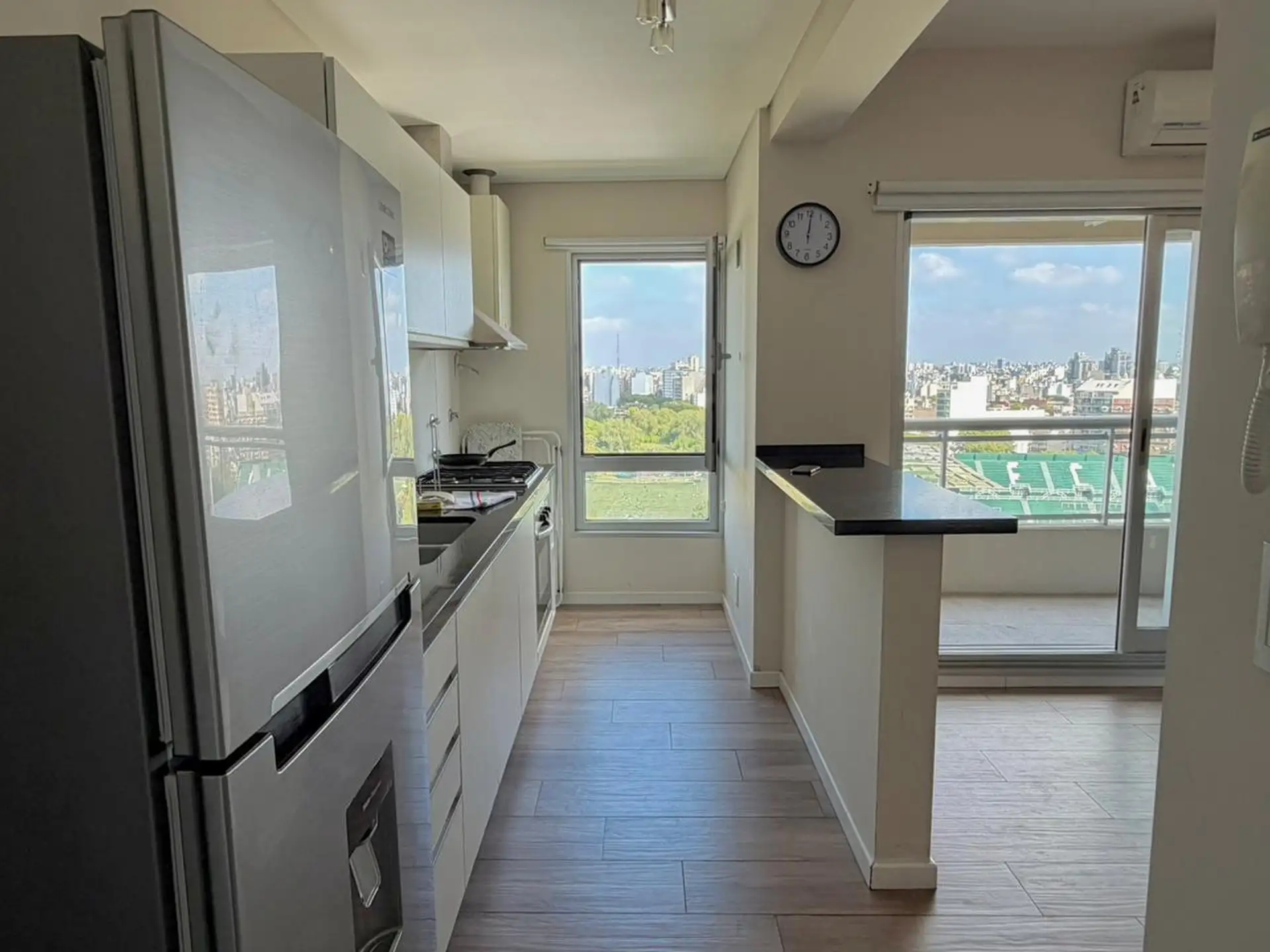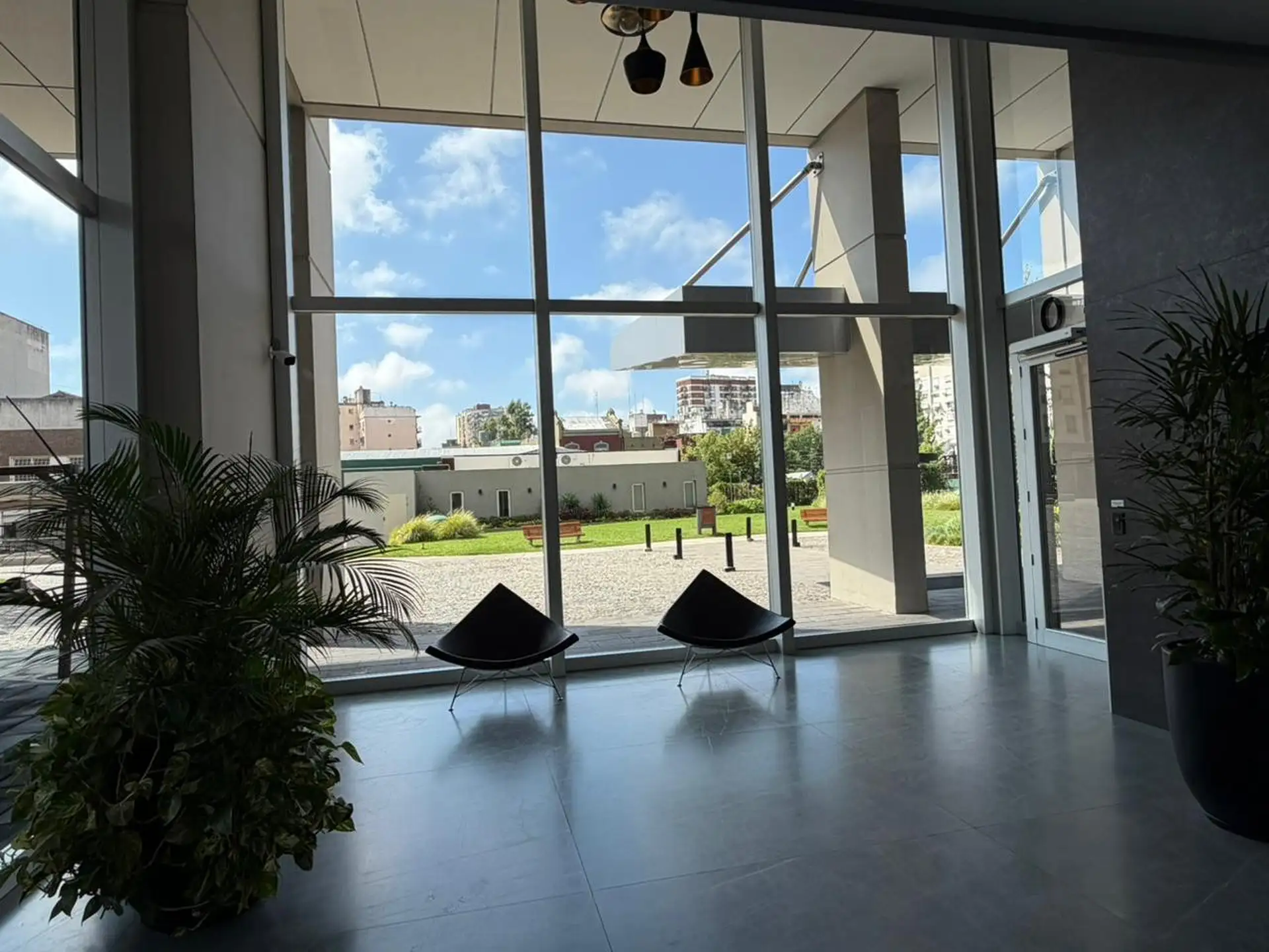 Departamento de 2 ambientes amoblado de 55 m² en el piso 14, con balcón y vista panorámica. Cuenta con living comedor con cocina integrada, barra desayunadora y lavadero incorporado, dormitorio con placard, y baño completo con bañera y mampara de blindex. Incluye piso flotante, caldera individual dual para agua caliente y calefacción por piso radiante, además de amplios ventanales. El edificio Dos Plaza tiene 10.500 m² de parque propio, quinchos individuales con parrilla, pileta para adultos y n
