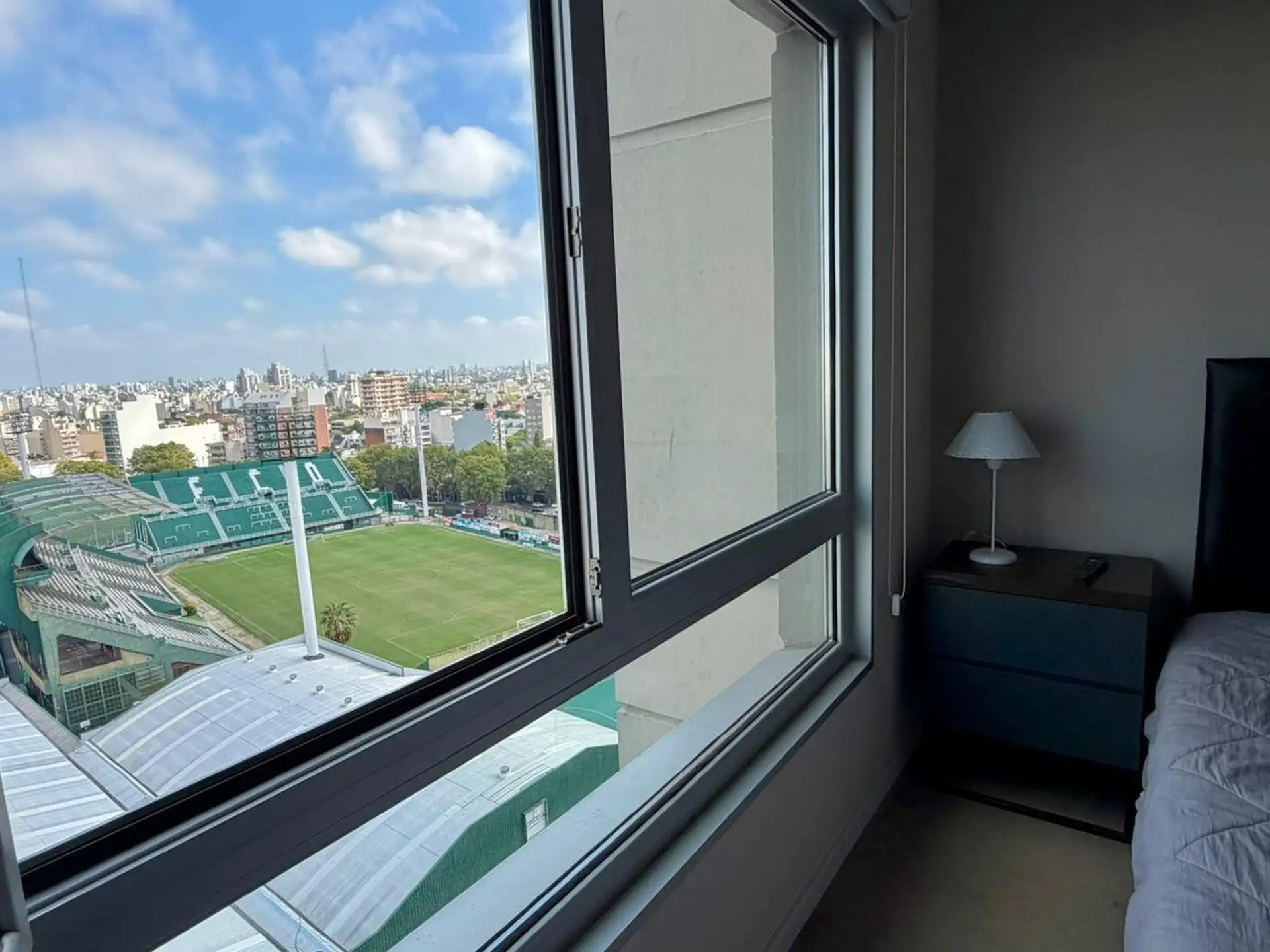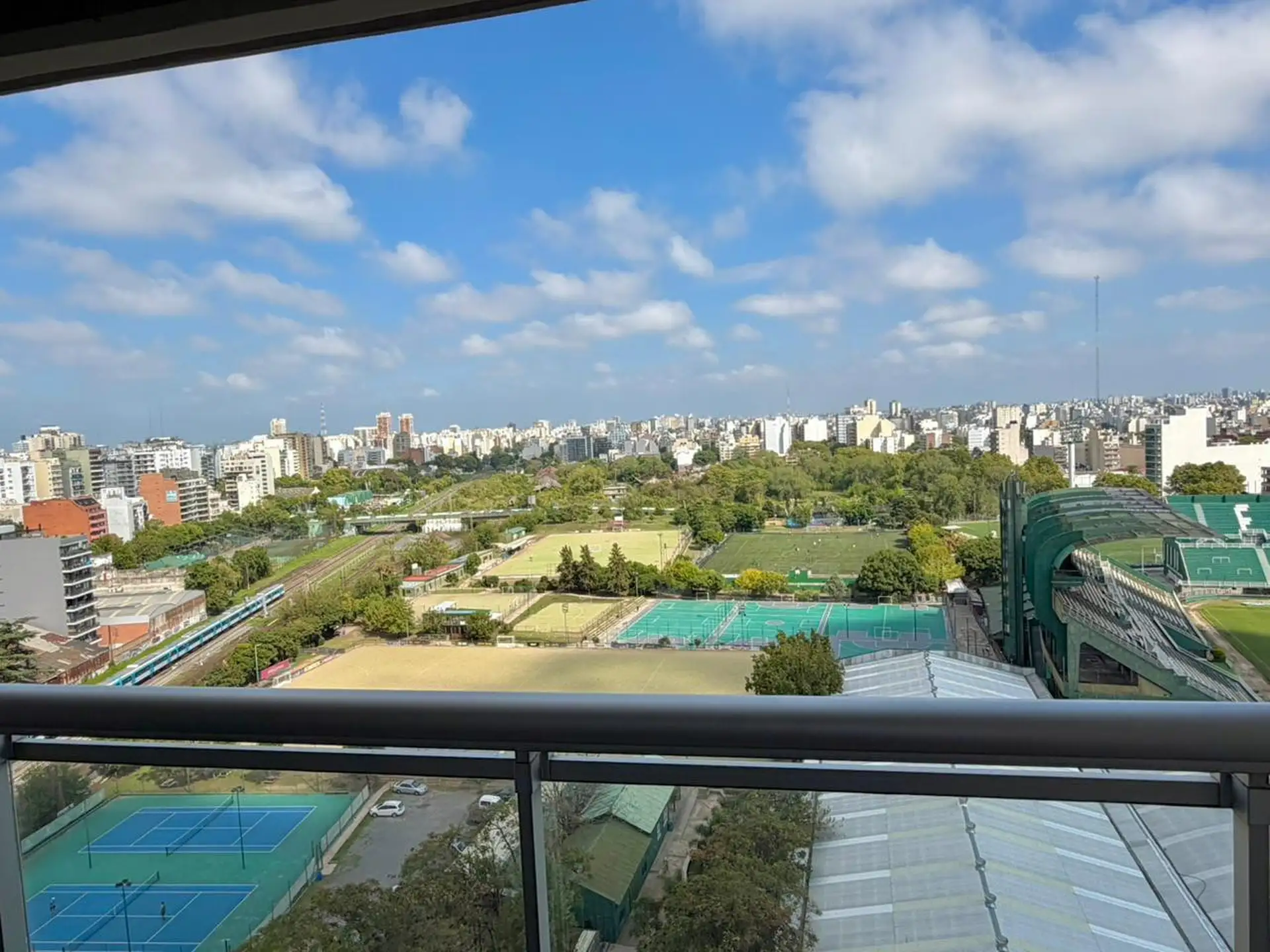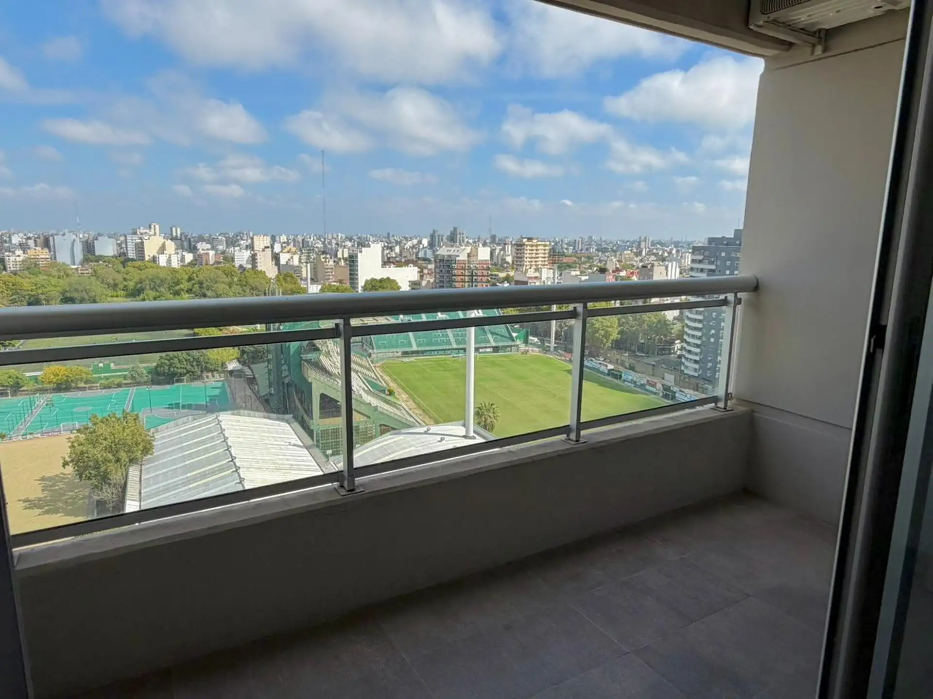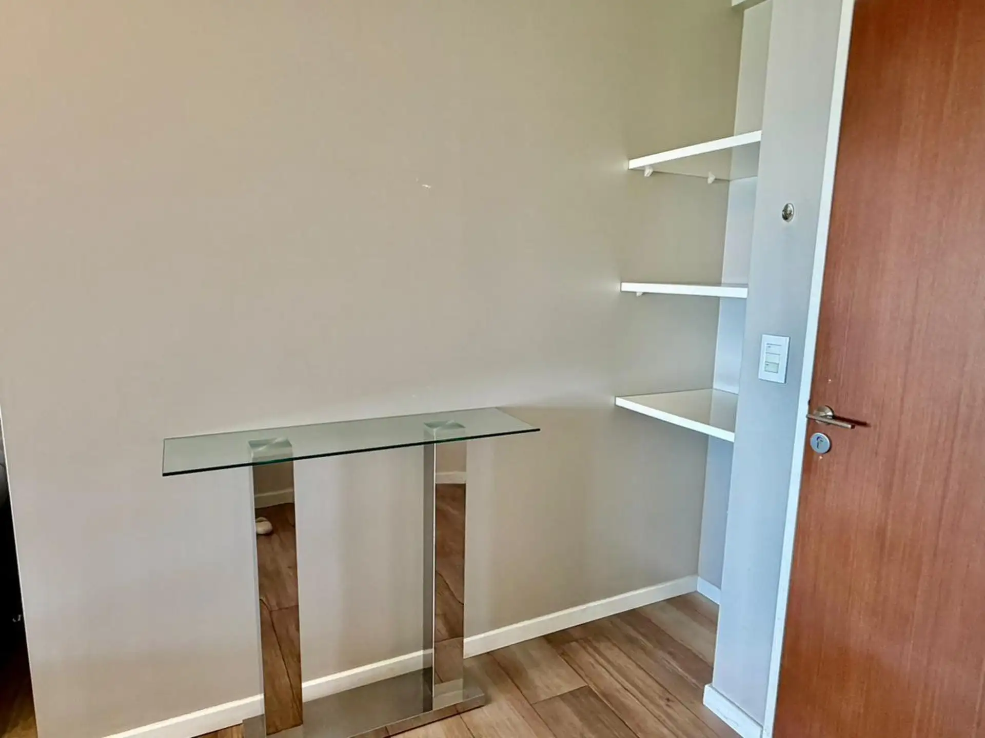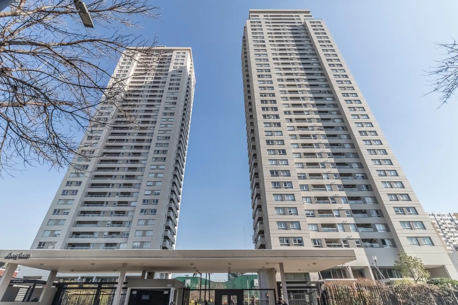 Departamento de 2 ambientes amoblado de 55 m² en el piso 14, con balcón y vista panorámica. Cuenta con living comedor con cocina integrada, barra desayunadora y lavadero incorporado, dormitorio con placard, y baño completo con bañera y mampara de blindex. Incluye piso flotante, caldera individual dual para agua caliente y calefacción por piso radiante, además de amplios ventanales. El edificio Dos Plaza tiene 10.500 m² de parque propio, quinchos individuales con parrilla, pileta para adultos y n