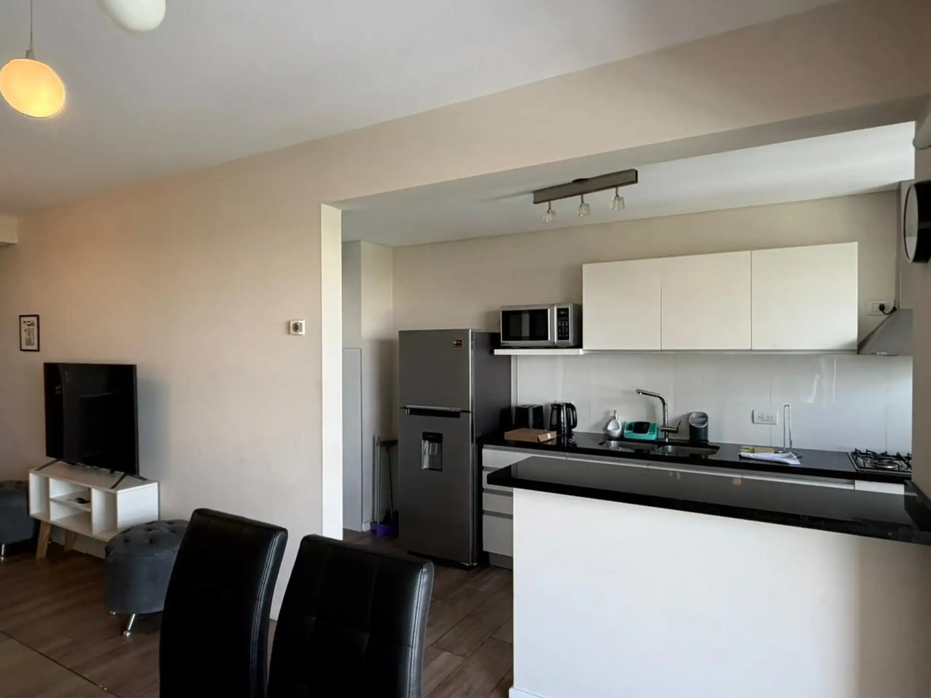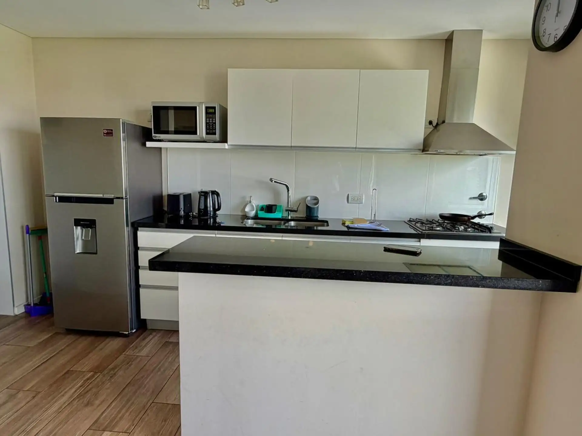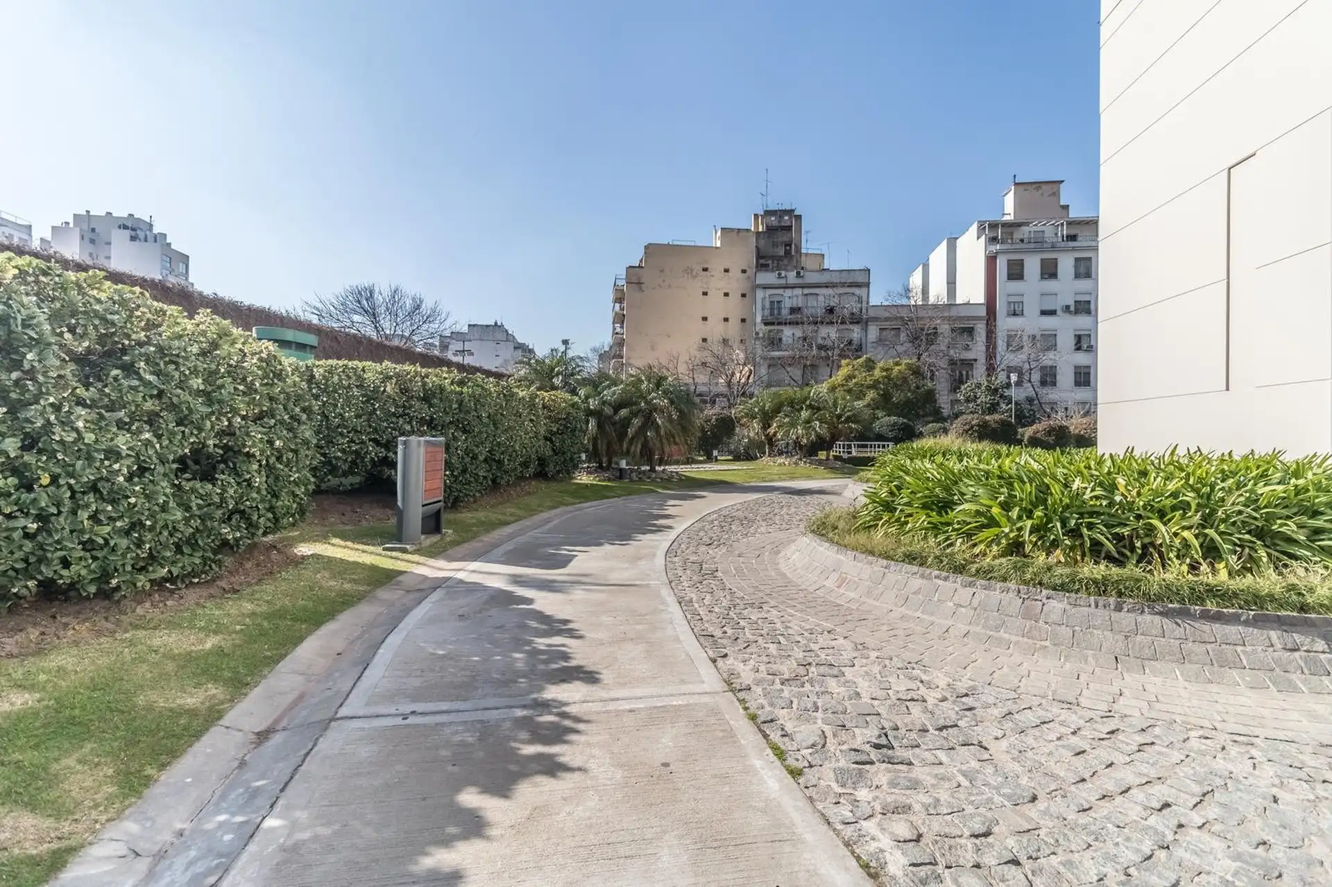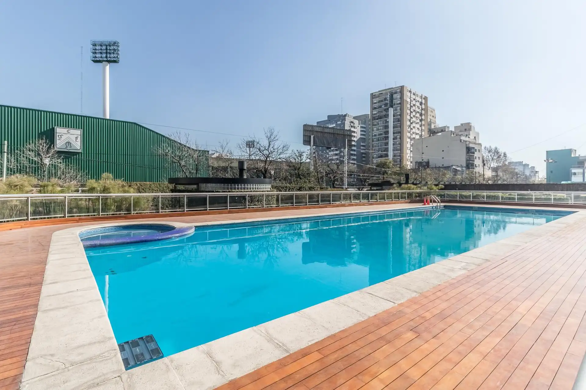 Departamento de 2 ambientes amoblado de 55 m² en el piso 14, con balcón y vista panorámica. Cuenta con living comedor con cocina integrada, barra desayunadora y lavadero incorporado, dormitorio con placard, y baño completo con bañera y mampara de blindex. Incluye piso flotante, caldera individual dual para agua caliente y calefacción por piso radiante, además de amplios ventanales. El edificio Dos Plaza tiene 10.500 m² de parque propio, quinchos individuales con parrilla, pileta para adultos y n