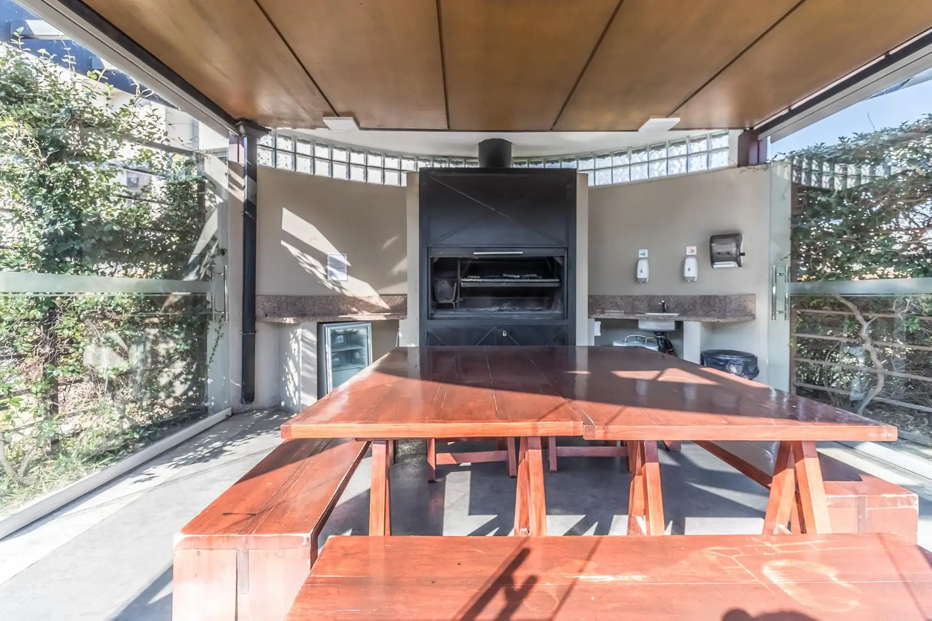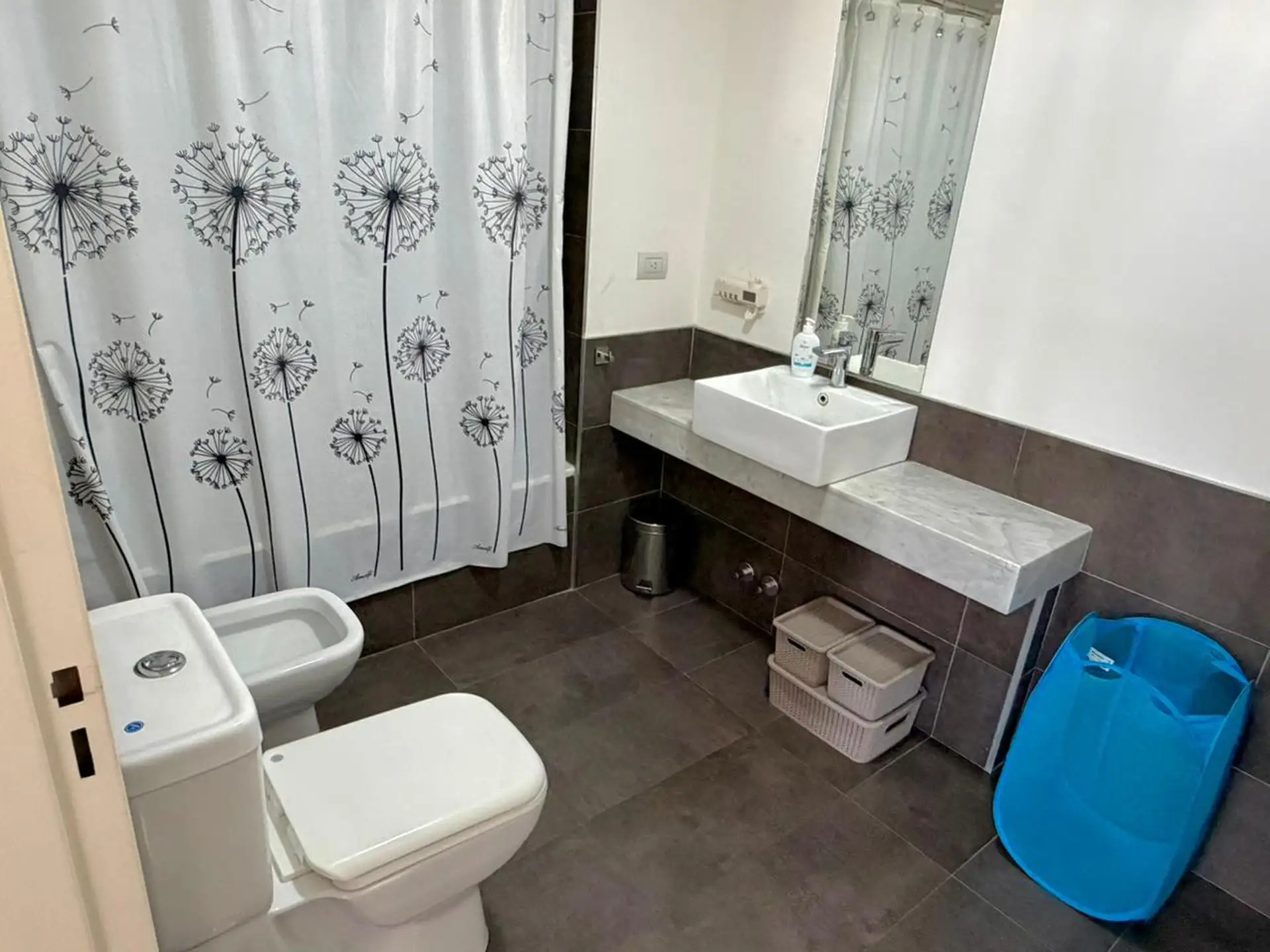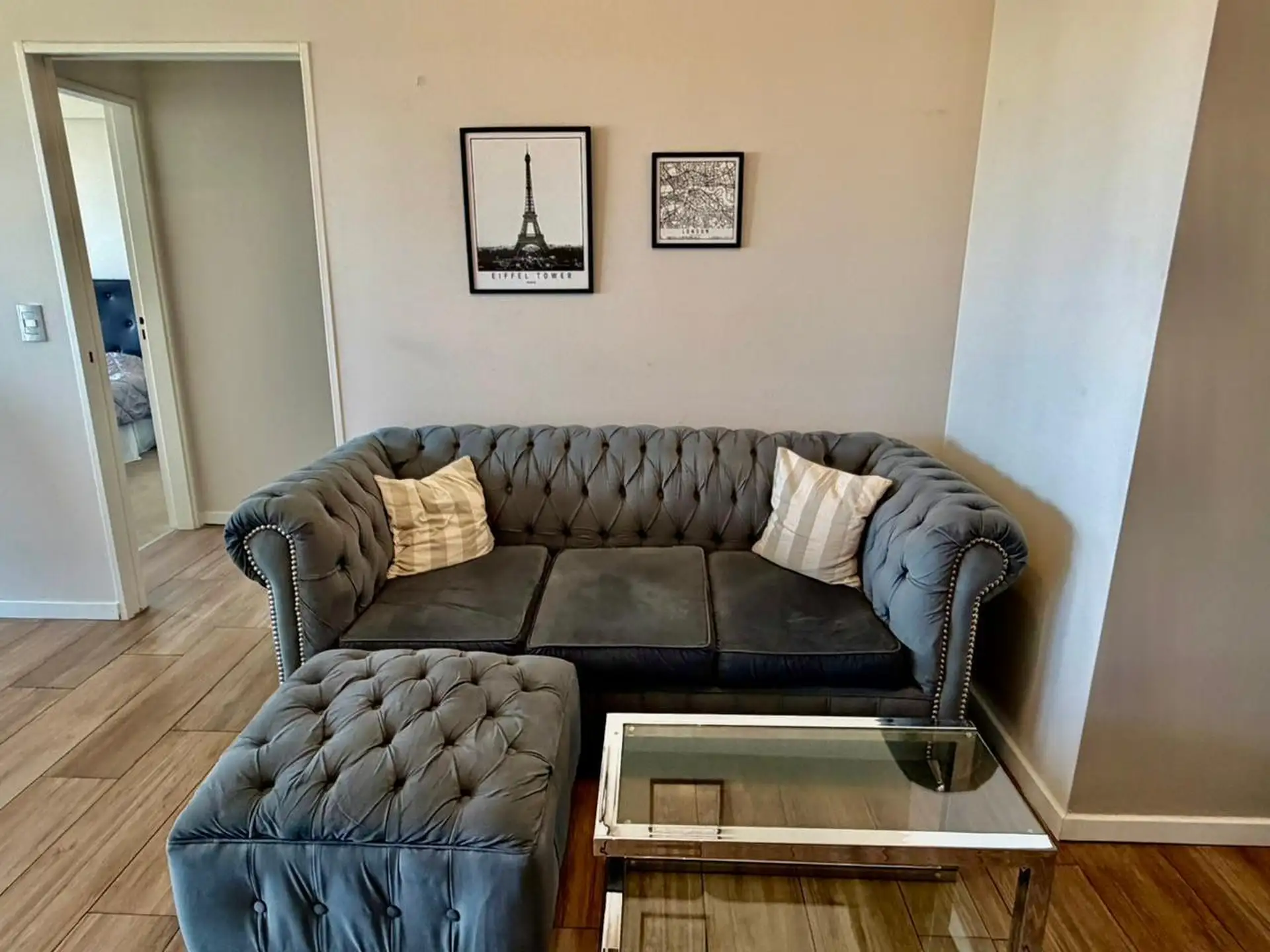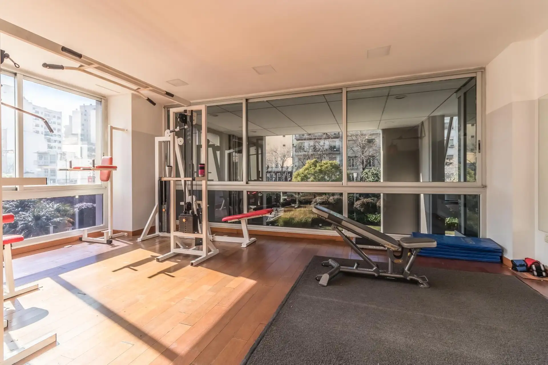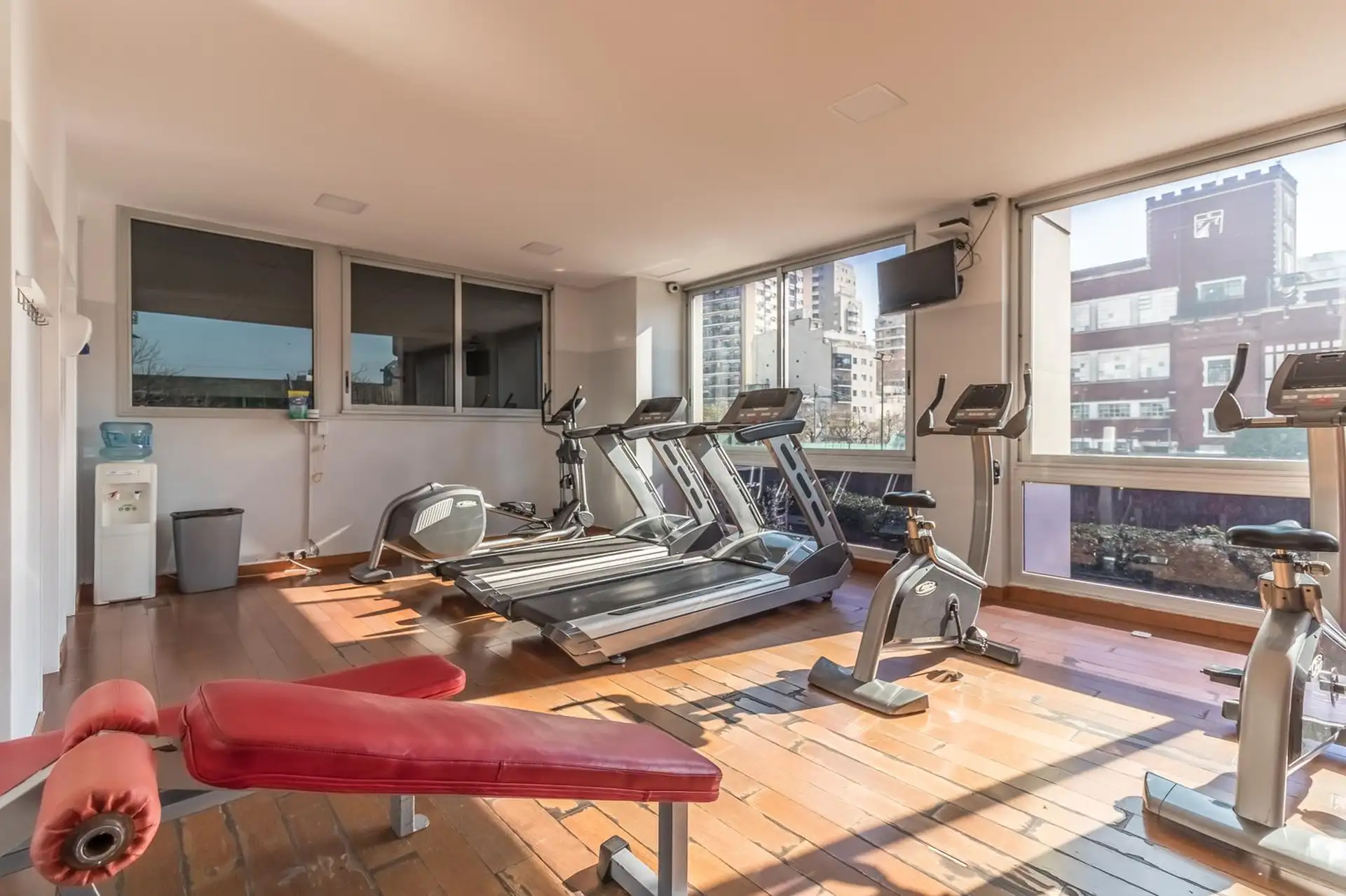 Departamento de 2 ambientes amoblado de 55 m² en el piso 14, con balcón y vista panorámica. Cuenta con living comedor con cocina integrada, barra desayunadora y lavadero incorporado, dormitorio con placard, y baño completo con bañera y mampara de blindex. Incluye piso flotante, caldera individual dual para agua caliente y calefacción por piso radiante, además de amplios ventanales. El edificio Dos Plaza tiene 10.500 m² de parque propio, quinchos individuales con parrilla, pileta para adultos y n