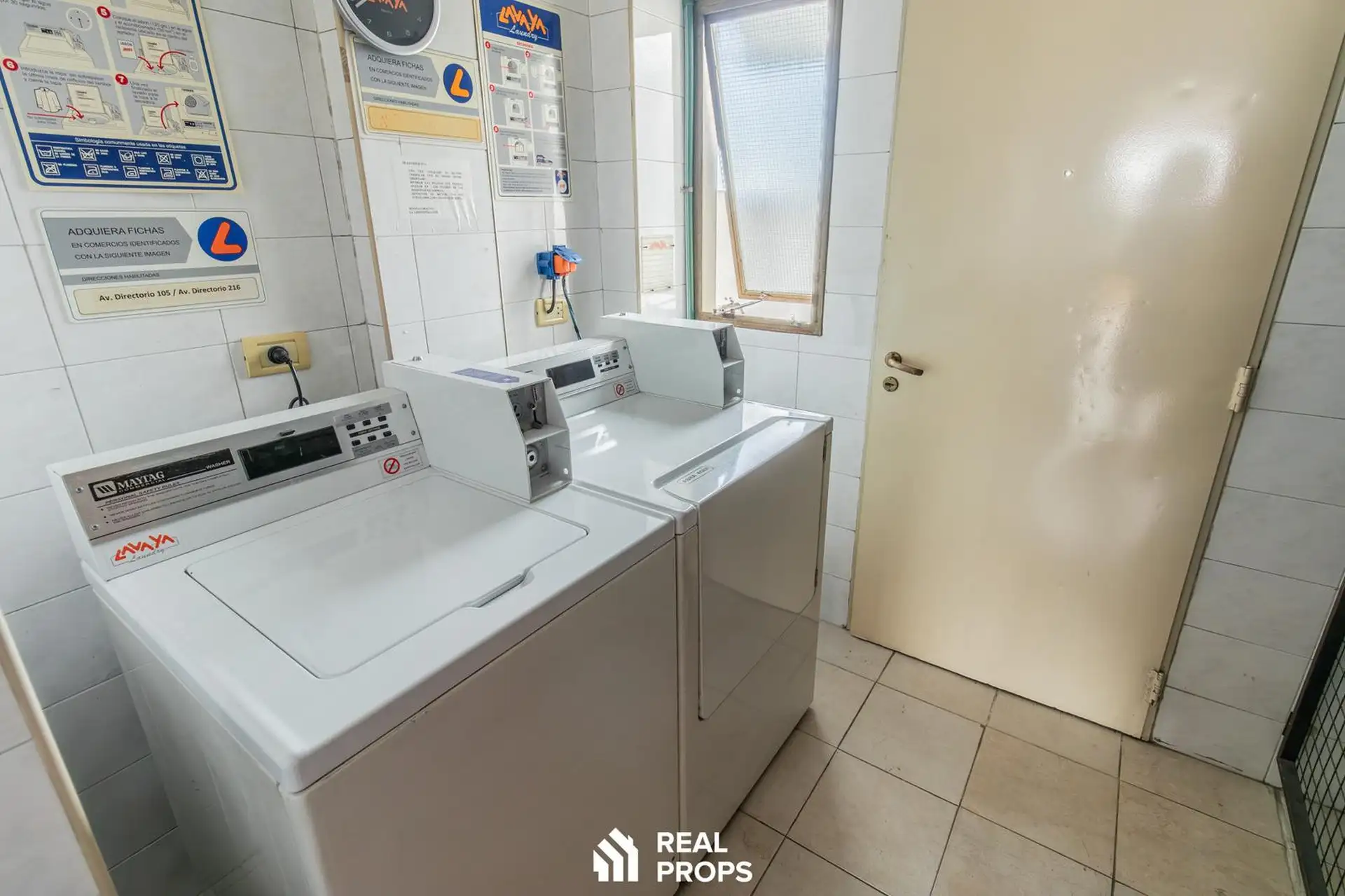 Semipiso de 2 ambientes de 50,62 m² en el 8° piso, al frente, con balcón y vista abierta. Cuenta con living comedor de 2,70 m x 6,70 m con cocina integrada equipada con muebles sobre y bajo mesada y cocina a gas; dormitorio de 2,87 m x 3,40 m con placar y baño completo. Tiene pisos de parquet, aire acondicionado frío/calor y agua caliente central. El edificio dispone de laundry, SUM, espacio de colgado y baño en el piso 10, terraza de uso común y encargado. En planta baja se encuentra la cochera