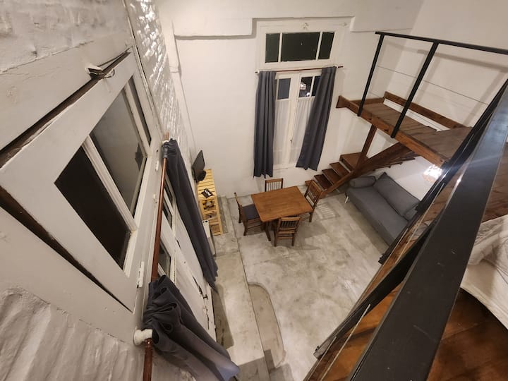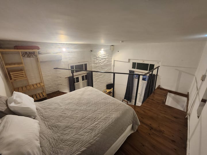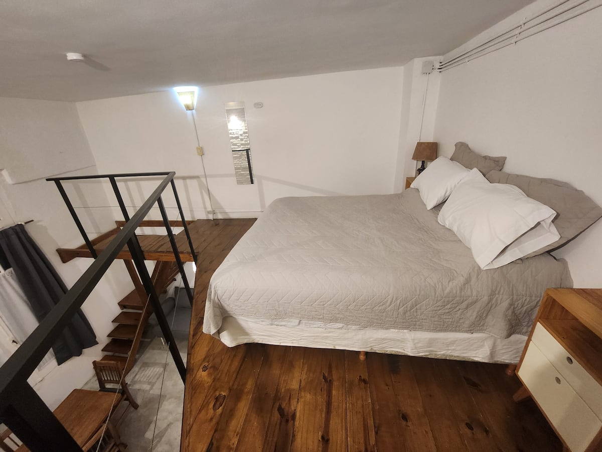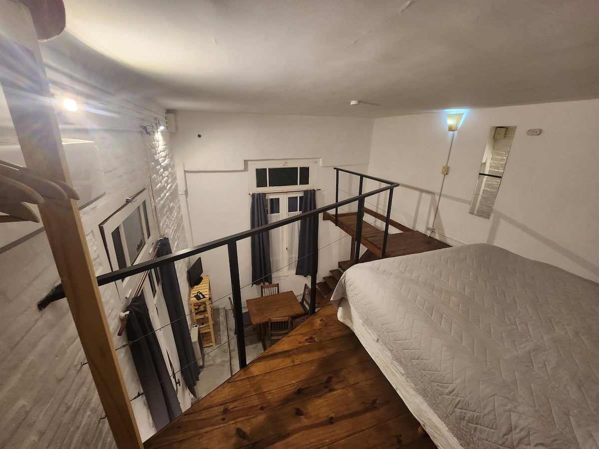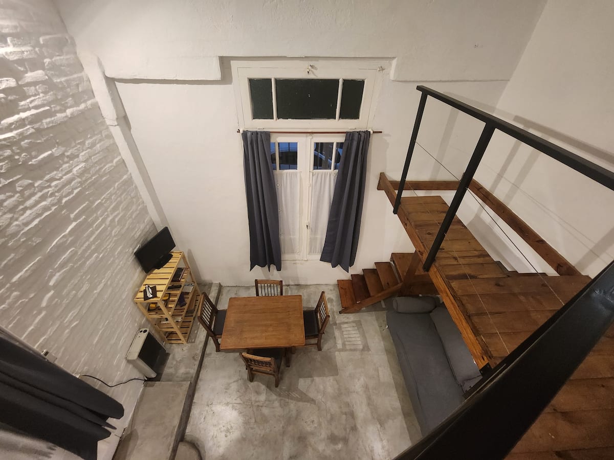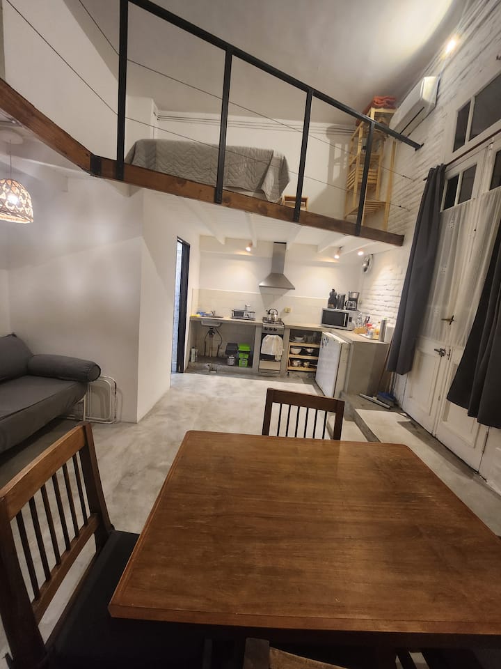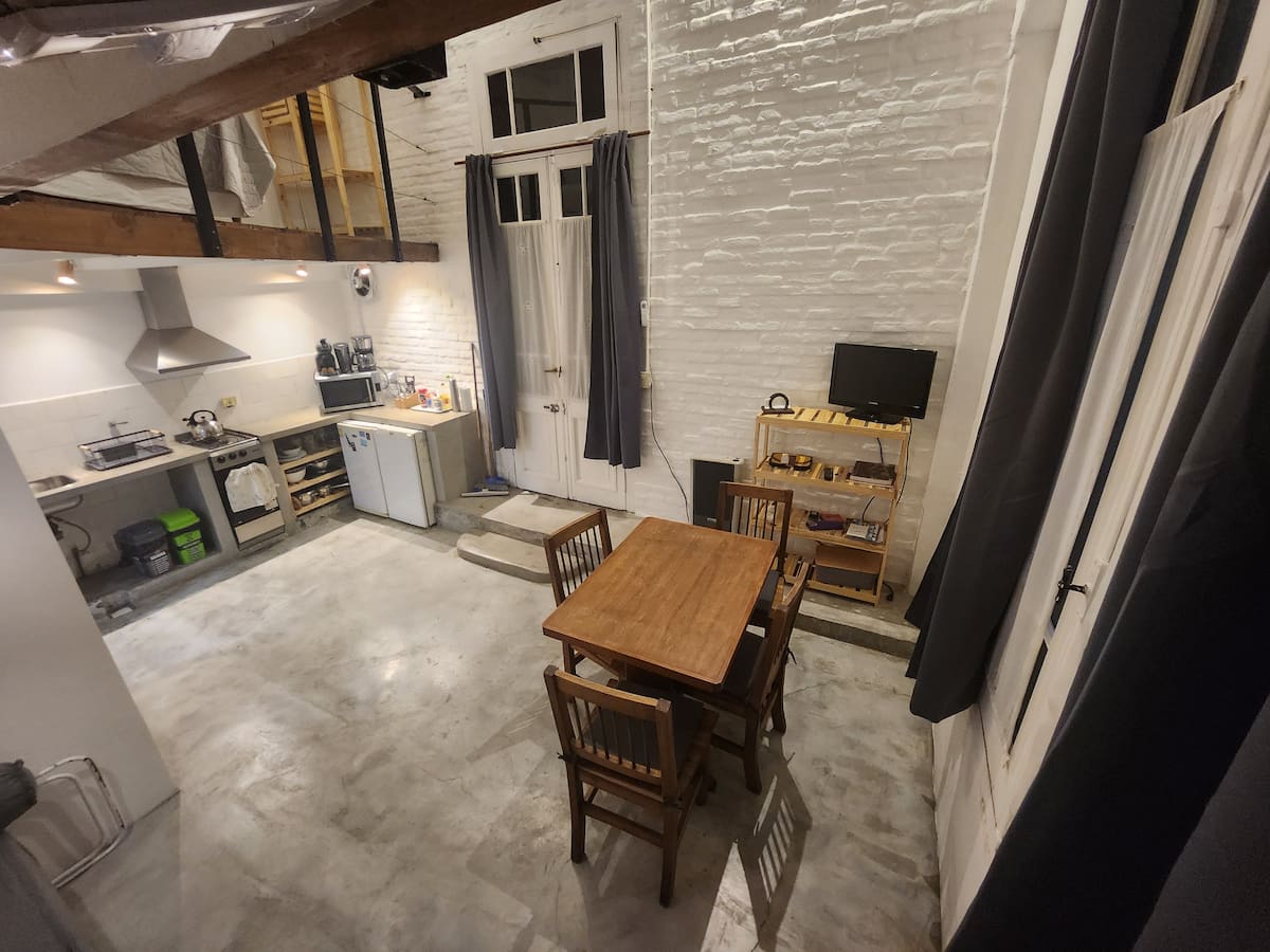 Departamento tipo loft en Chacarita, con dormitorio para 1 cama queen o 2 camas individuales. El área de estar incluye sofá y el sector de comedor cuenta con mesa para 4 personas. El acceso es mediante un portón compartido con los propietarios y, luego, una puerta interior hacia el loft. A pocos minutos de Palermo Hollywood, con oferta de restaurantes, cafés, bares y locales de diseño.