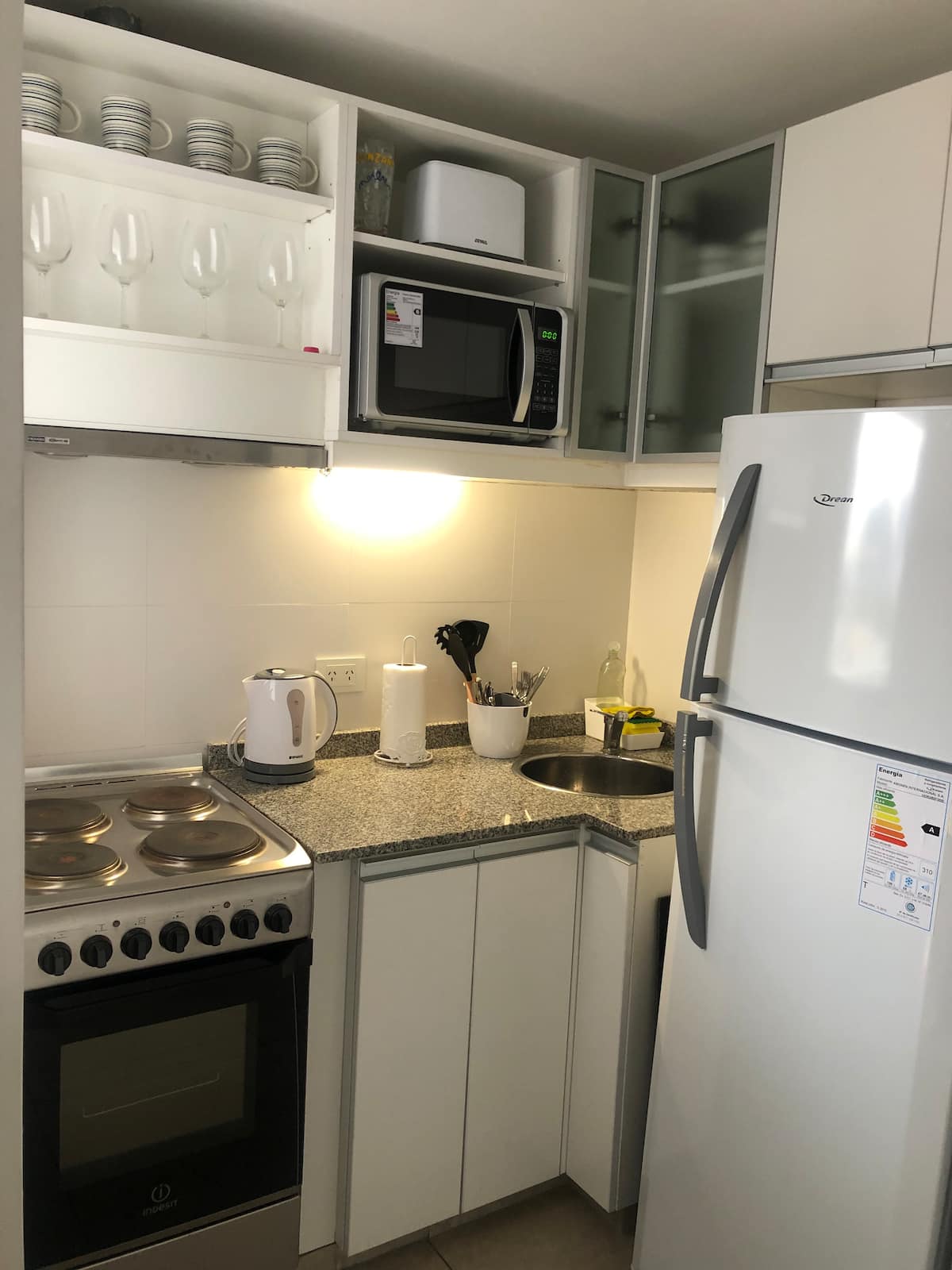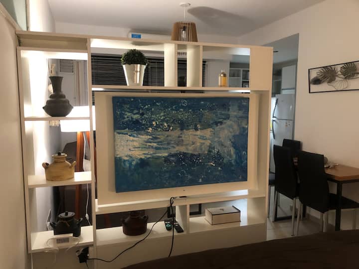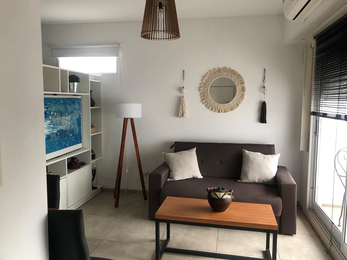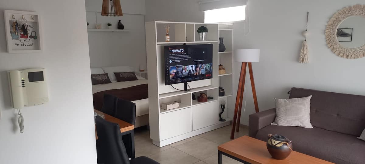 Departamento tipo estudio amoblado con 1 cama de 1,60 m x 2 m con resortes ensacados. Incluye aire acondicionado, calefacción, cocina con hornalla y horno eléctrico, heladera con freezer, microondas, tostadora y pava eléctrica, además de vajilla y juego de cocina. El espacio cuenta con sillón, divisorio giratorio y TV inteligente de 43 pulgadas con servicio por cable y acceso a Netflix, Prime Video, HBO y Star Plus. Wi-Fi por fibra óptica de 320 Mbs. Se informa un costo de limpieza de US$25 y qu