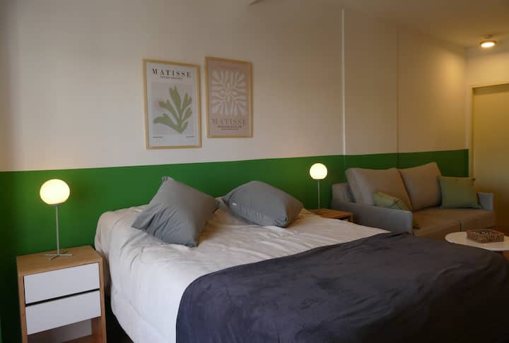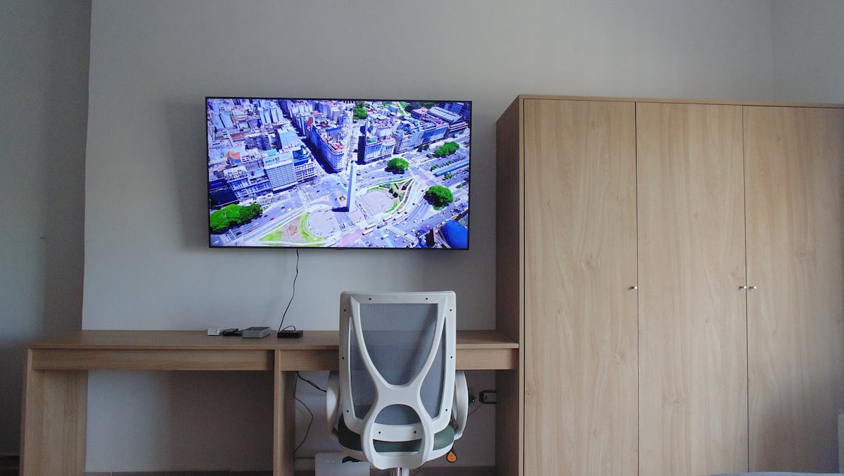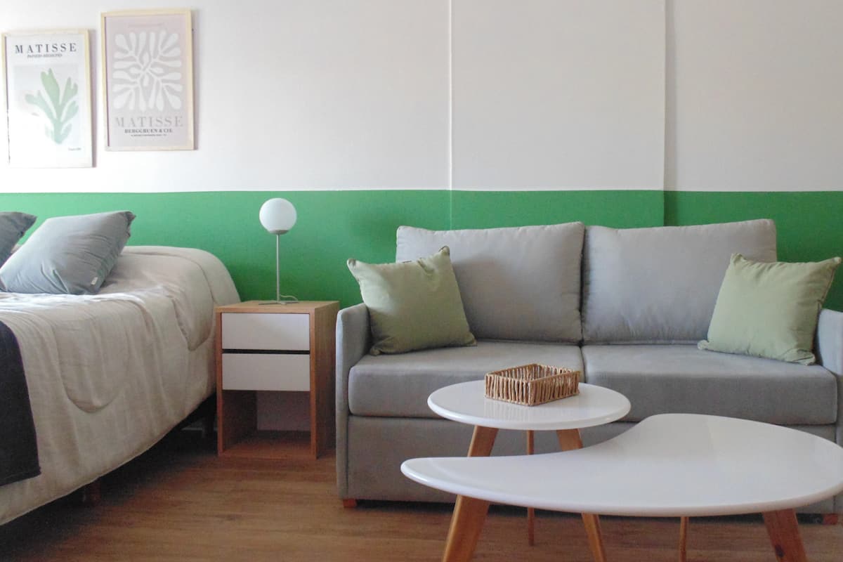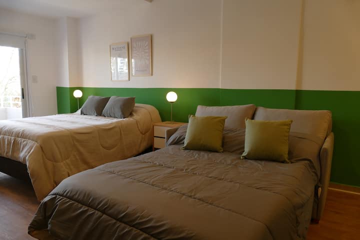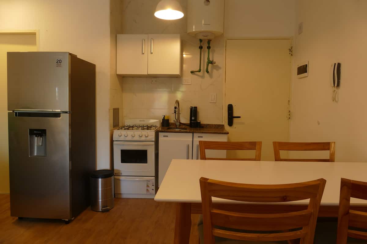 Monoambiente en Palermo Hollywood, a estrenar, con equipamiento y mobiliario. Acomoda hasta 4 personas: cama doble y sofá cama doble. Incluye electrodomésticos Samsung, TV de 55', aire acondicionado frío/calor y heladera con freezer. Cocina equipada con filtro PSA, pava eléctrica, tostadora, cafetera Dolce Gusto y minipimer, además de vajilla completa y utensilios. Suma mesa de trabajo con silla y conexiones con tira de energía (USB-C, USB y toma universal).