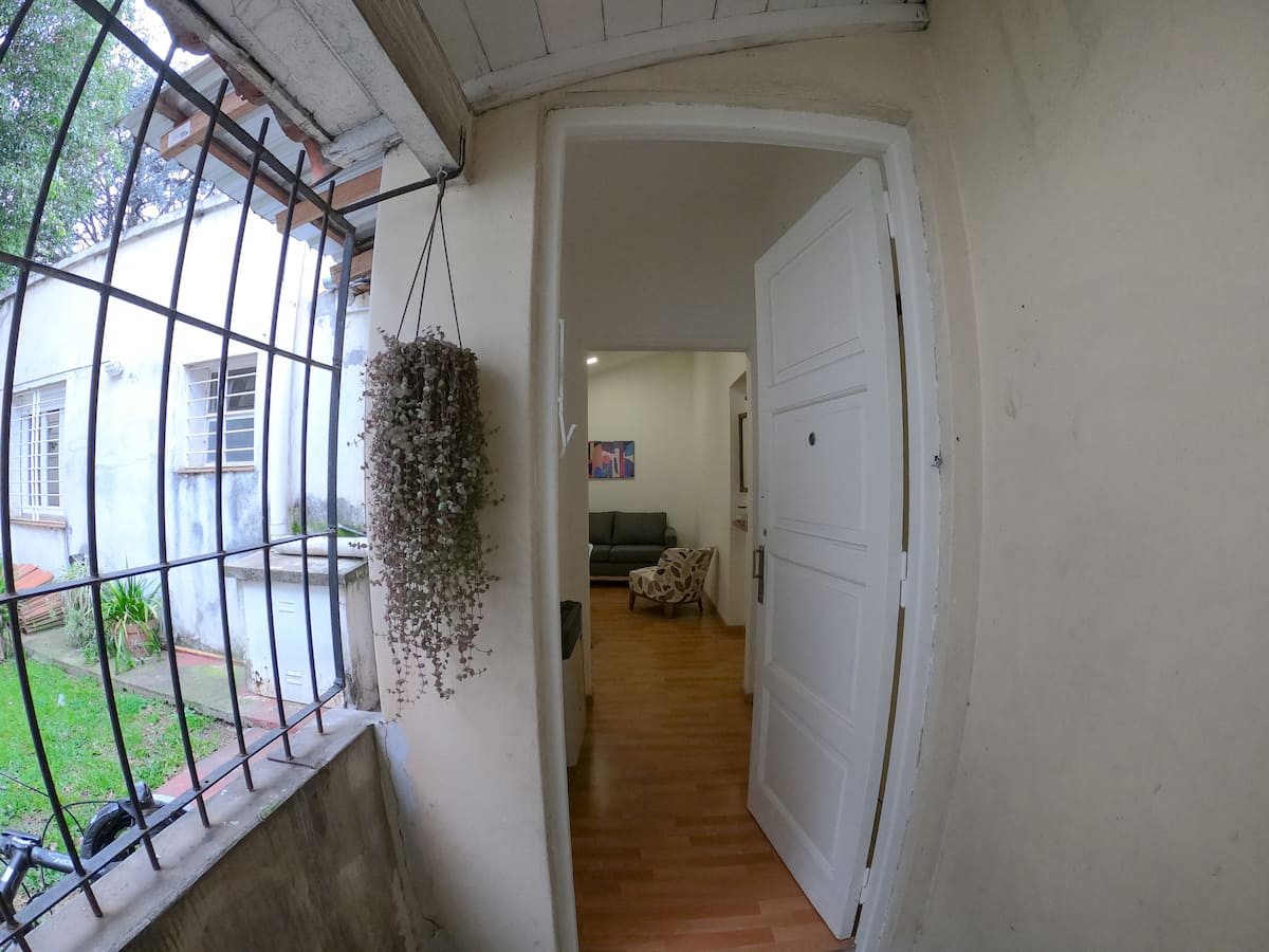 Departamento en planta baja, en un edificio de 2 pisos, con vista a un jardín interno. Cuenta con 45 m², 1 dormitorio de gran tamaño, living independiente y 1 baño. Cocina con heladera, termotanque nuevo y horno a gas reemplazado por horno eléctrico de 32 litros con cocina eléctrica de 2 hornallas.