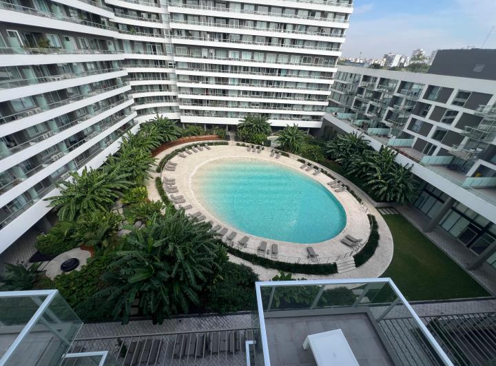 Departamento de 2 ambientes amoblado y a estrenar en un edificio en Colegiales, con toilette y suite con vestidor. Incluye cochera fija, baulera y box para encomiendas. El edificio tiene piscinas, gimnasio, pista de running, salas de yoga y pilates, spa, microcine, cine al aire libre, salón de eventos para 100 personas, co-working, salas para niños y adolescentes, restaurant, peluquería y seguridad 24 horas, además de estacionamiento residencial y servicio de paquetería. También cuenta con un pa