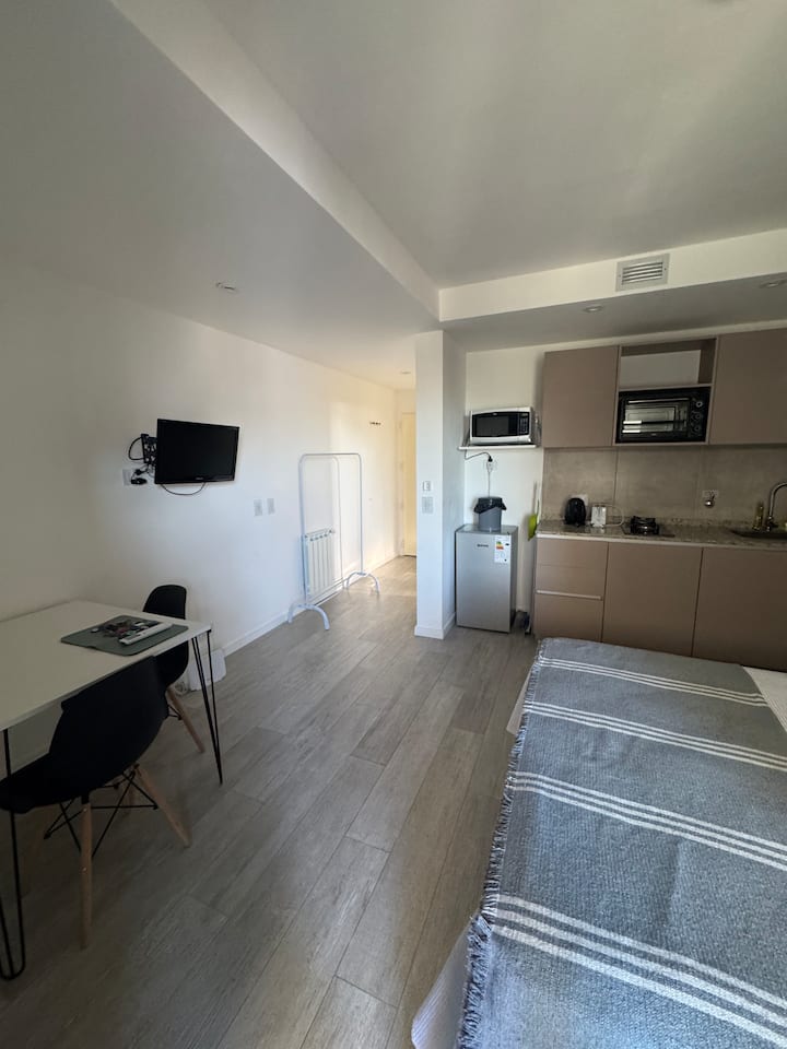 Departamento monoambiente en Chacarita. Cuenta con baño privado con ducha y cocina con anafe a gas y horno eléctrico. Incluye heladera, microondas, TV, Wi-Fi, aire acondicionado y calefacción.