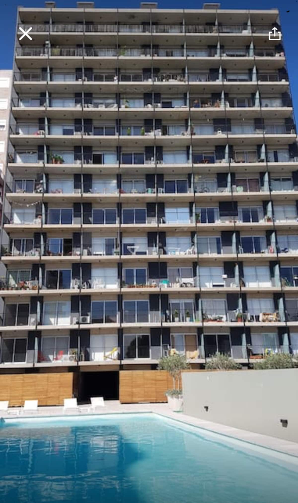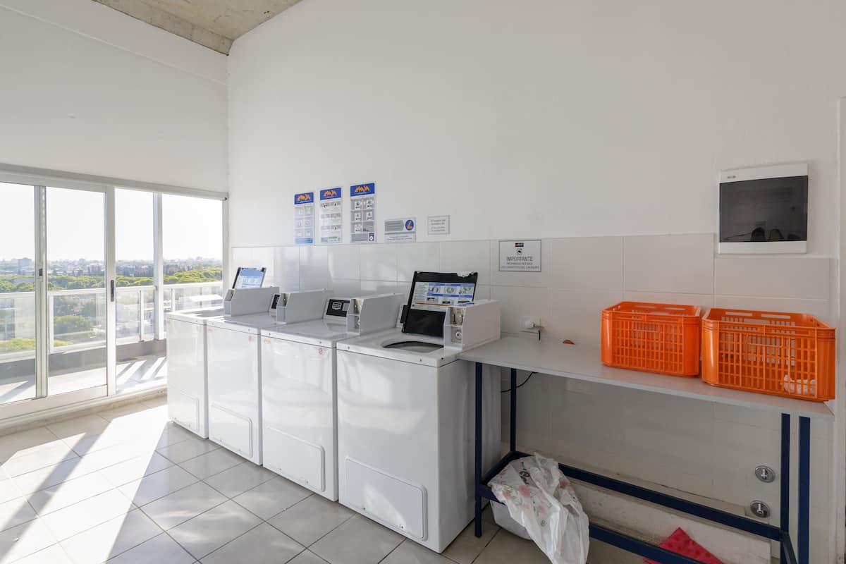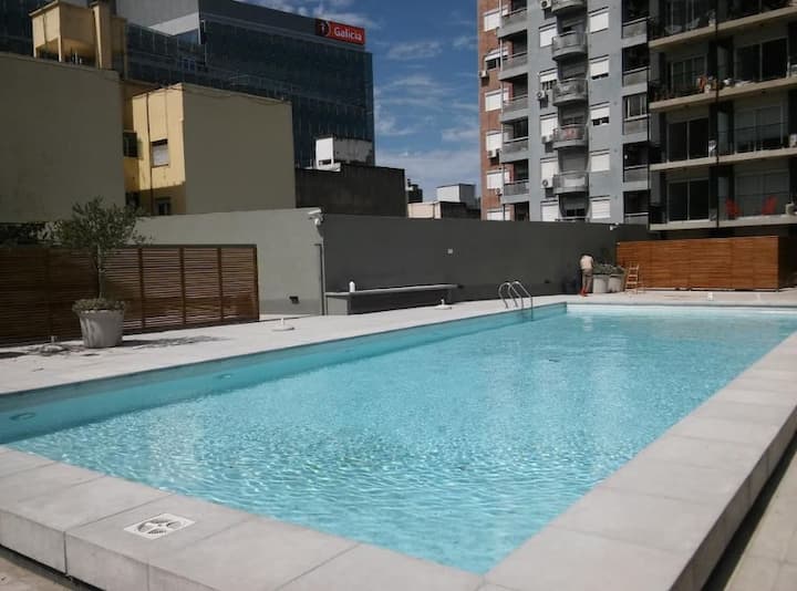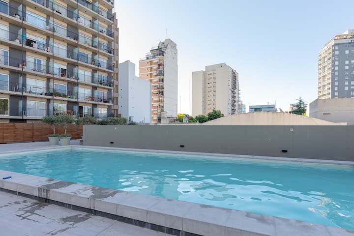 Departamento de 1 dormitorio en Chacarita, en un edificio de 8vo piso sobre Av. Corrientes. El living con cocina está integrado y el departamento se entrega amoblado y equipado, con heladera con freezer, vajilla, TV y Wi-Fi. El edificio cuenta con pileta, solárium, gimnasio, lavandería y un salón para eventos y reuniones, además de seguridad 24 horas. El acceso a la pileta es de 15 de noviembre a 31 de marzo, con condiciones de uso indicadas por el reglamento.
