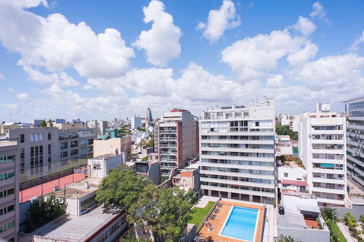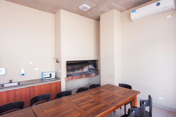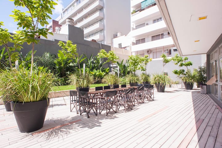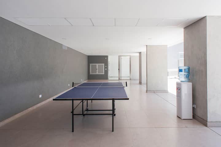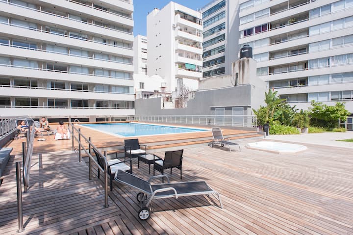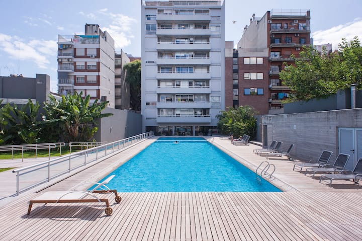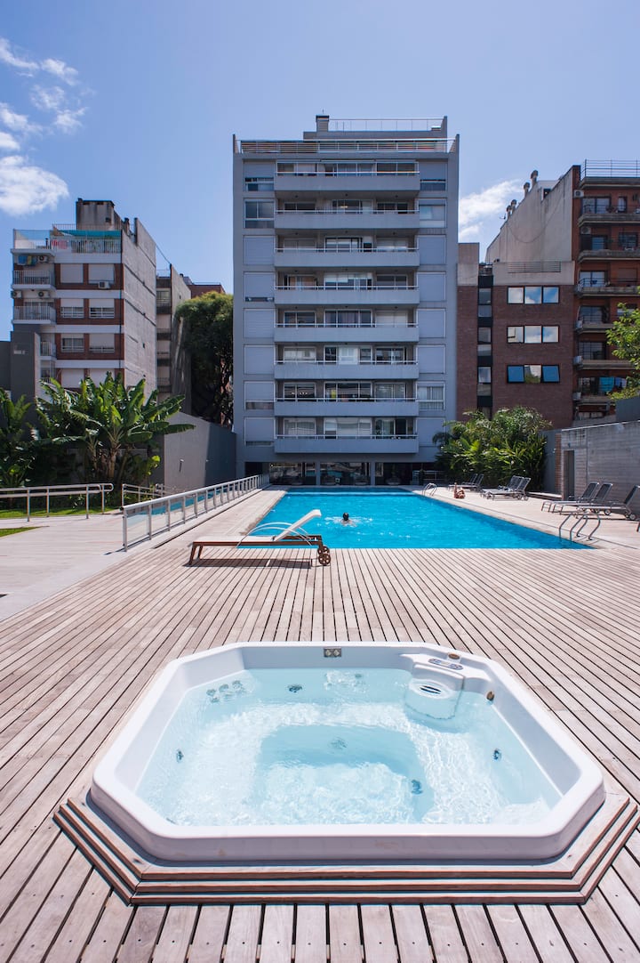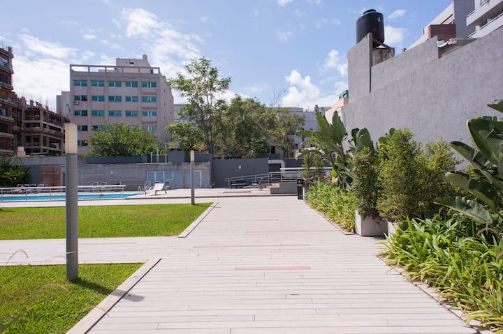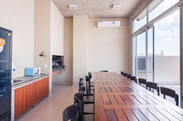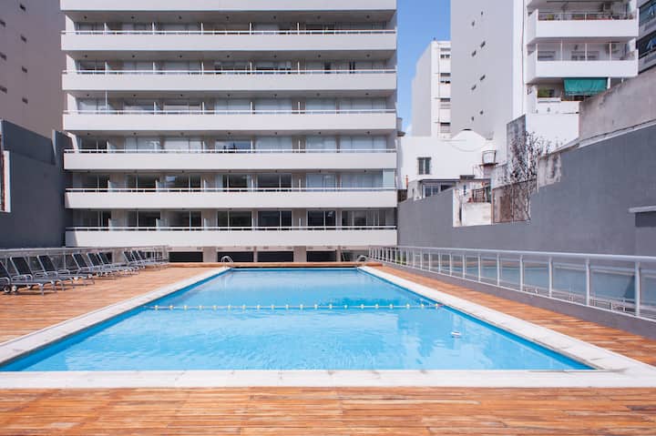 Departamento en el último piso del complejo LA MUSA STARS, con 1 dormitorio. Está amoblado y recientemente pintado. Incluye lavarropas, secarropas, heladera, tostadora, licuadora y calefón, y conexión WiFi de 25 Mbps. El complejo cuenta con gimnasio, jacuzzy y pileta olímpica, además de 2 piletas y área de jardín con zona de relax, parrillas y mesa de ping pong. También hay cocheras disponibles bajo modalidad por hora o por día, y el acceso al uso de laundry.