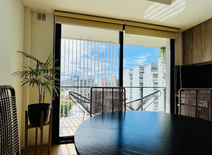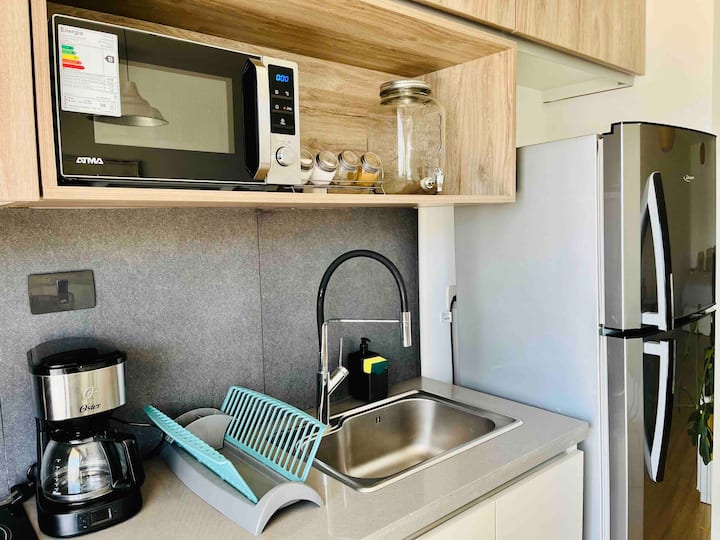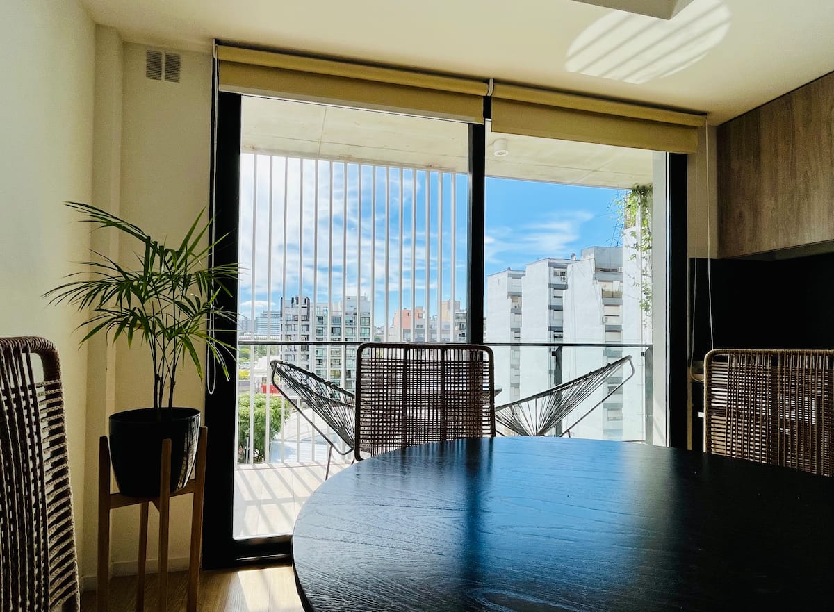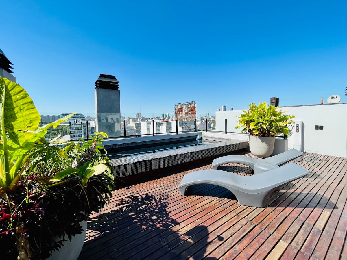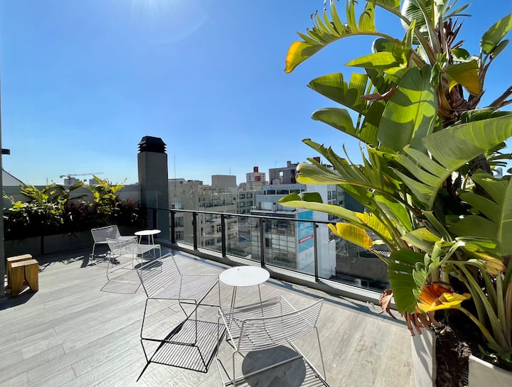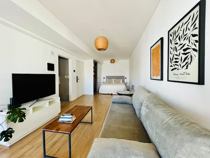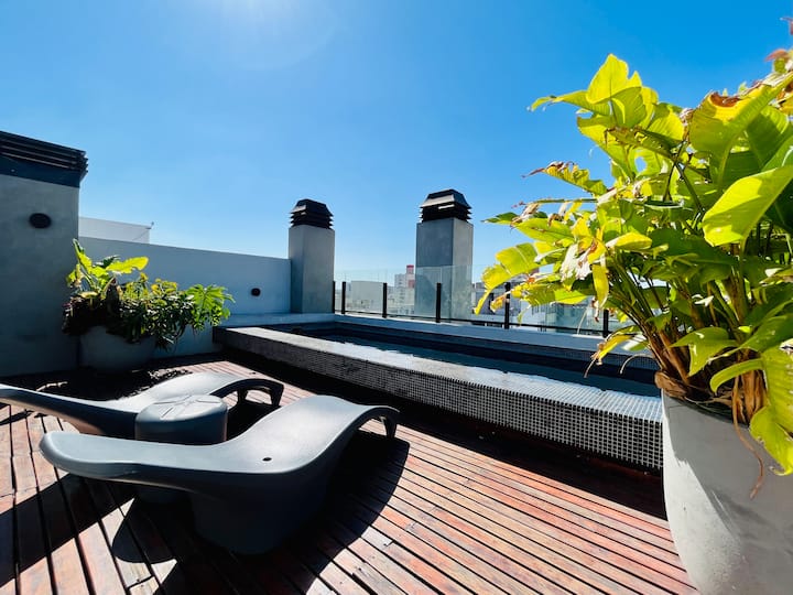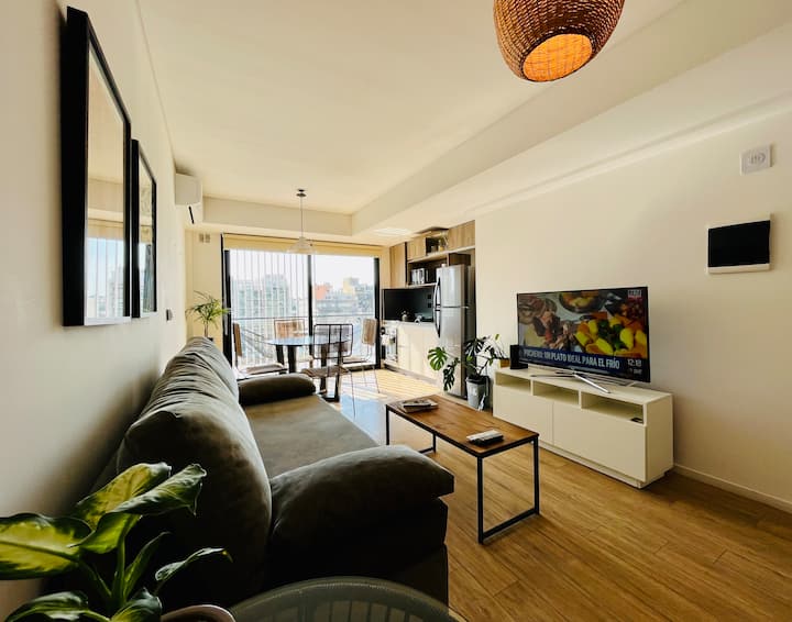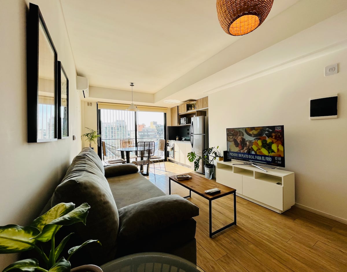 Departamento estudio de 1 ambiente en el 7° piso, al frente, con balcón. Cocina totalmente equipada, baño completo con bañadera, cama extra queen La Cardeuse, TV por cable y WiFi, y sofá cama con cama carrito (capacidad hasta 4 personas). El edificio ofrece solarium y pileta en la terraza, SUM con parrilla y gimnasio con reserva de turno, además de laundry con lavarropas y secarropas; el ingreso está monitoreado 24 hs.