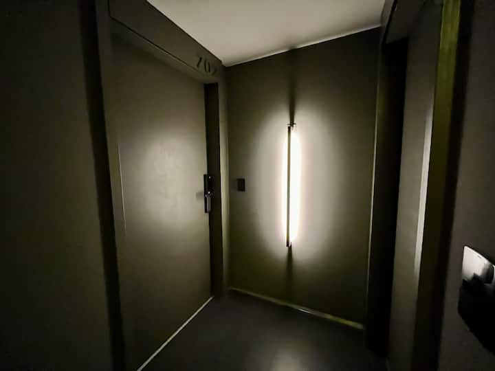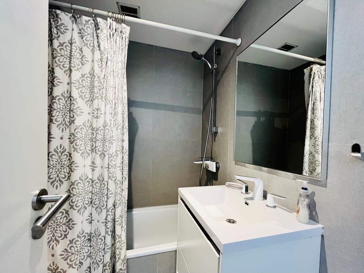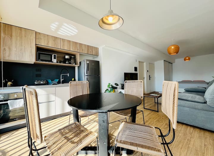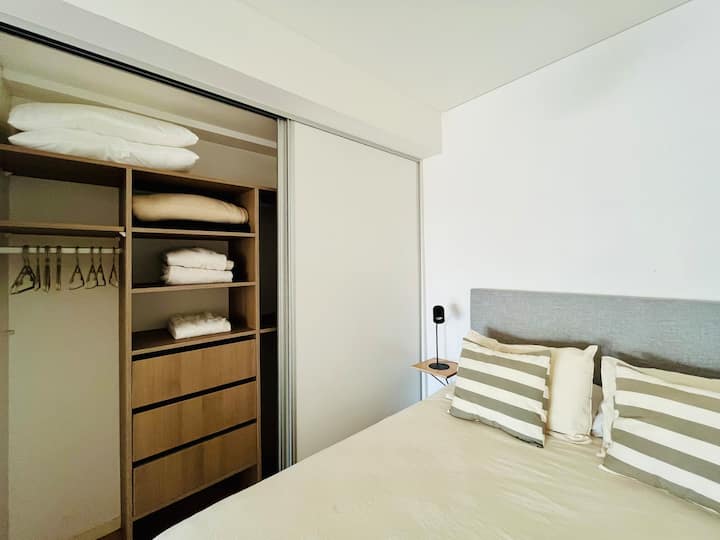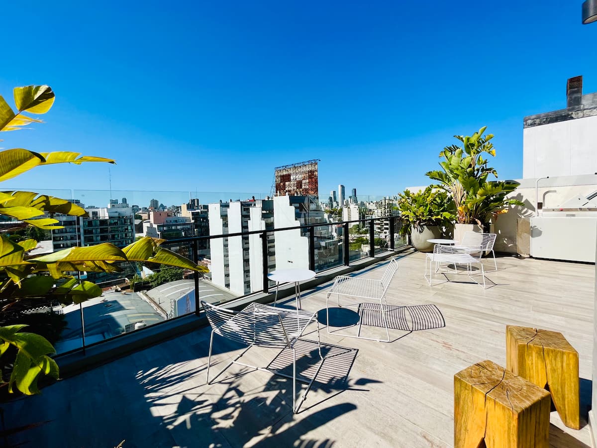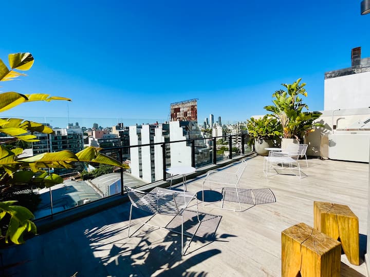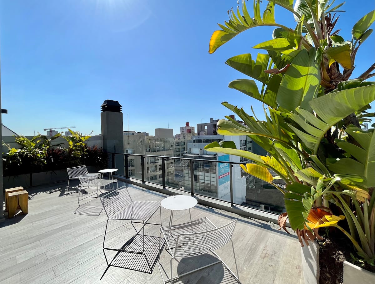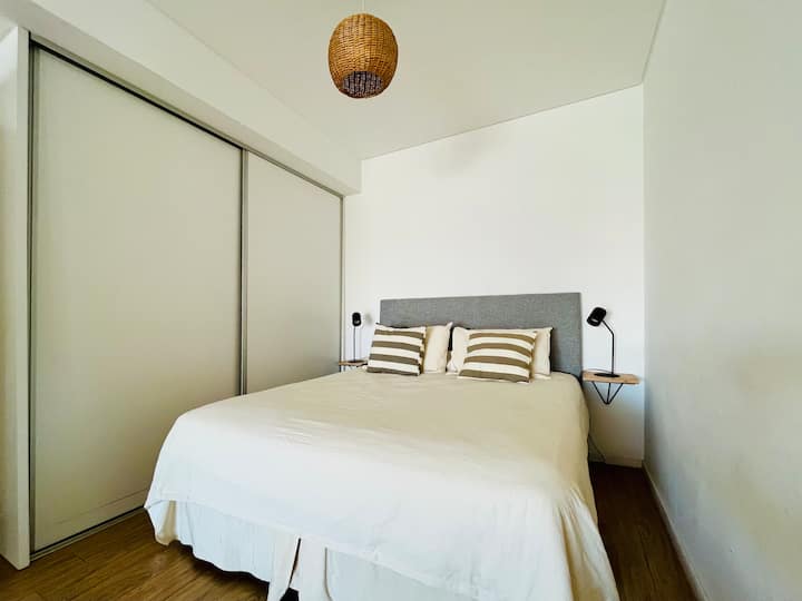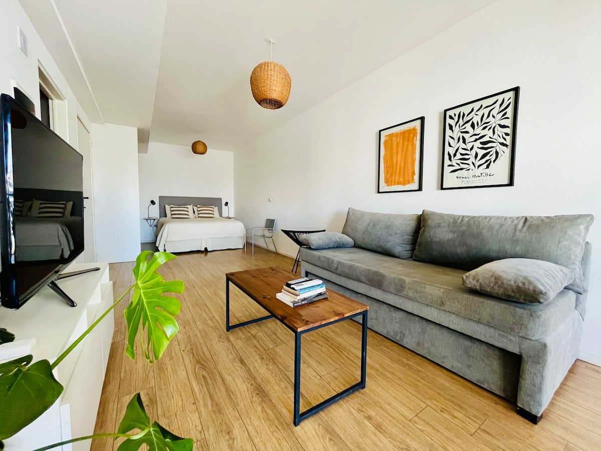 Departamento estudio de 1 ambiente en el 7° piso, al frente, con balcón. Cocina totalmente equipada, baño completo con bañadera, cama extra queen La Cardeuse, TV por cable y WiFi, y sofá cama con cama carrito (capacidad hasta 4 personas). El edificio ofrece solarium y pileta en la terraza, SUM con parrilla y gimnasio con reserva de turno, además de laundry con lavarropas y secarropas; el ingreso está monitoreado 24 hs.