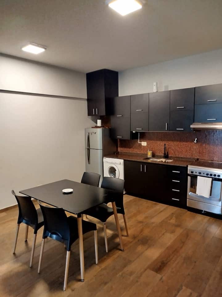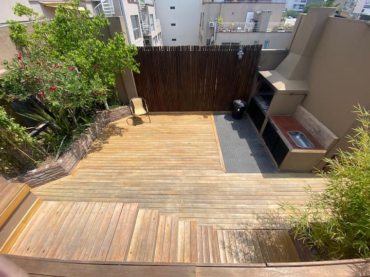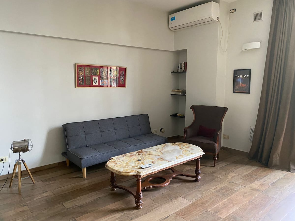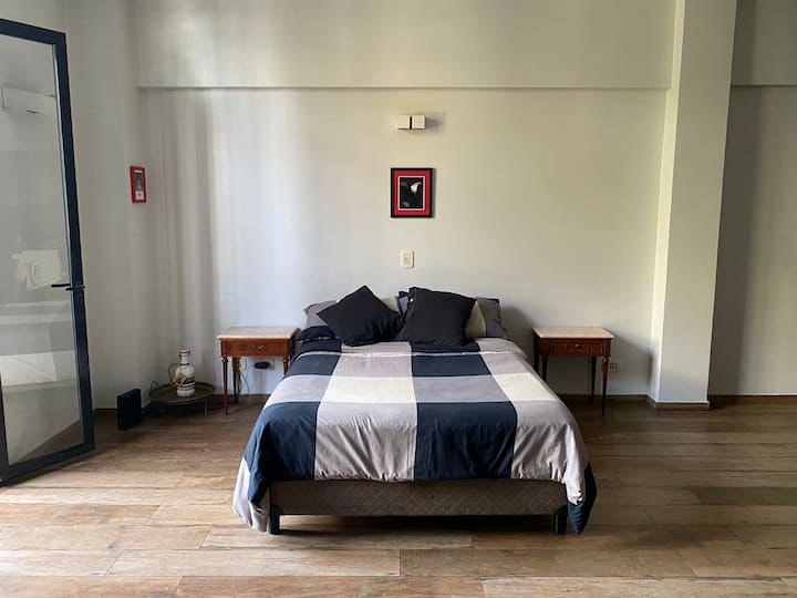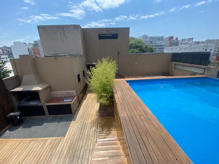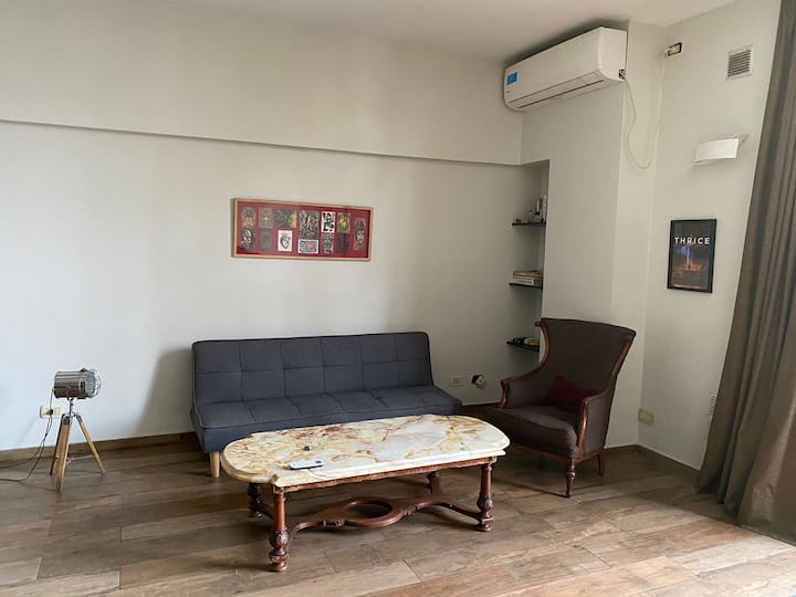 Monoambiente de 60 m² en Chacarita. Cuenta con cocina y comedor, cama doble y un área con 2 sillones, con aire acondicionado frío/calor. El baño es completo y hay balcón; el edificio dispone de terraza compartida con pileta. El edificio no cuenta con medidas para recibir personas con movilidad reducida.