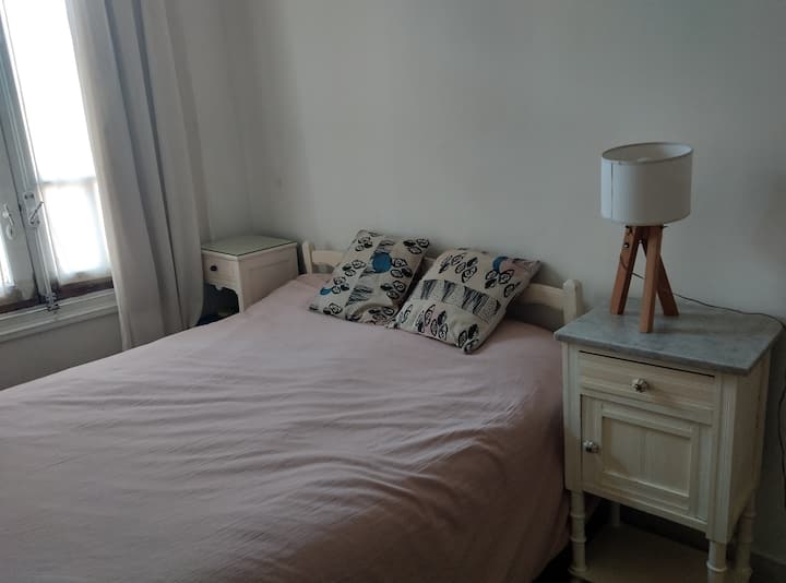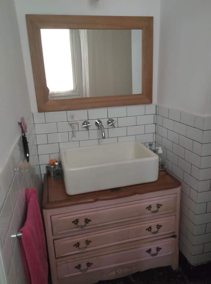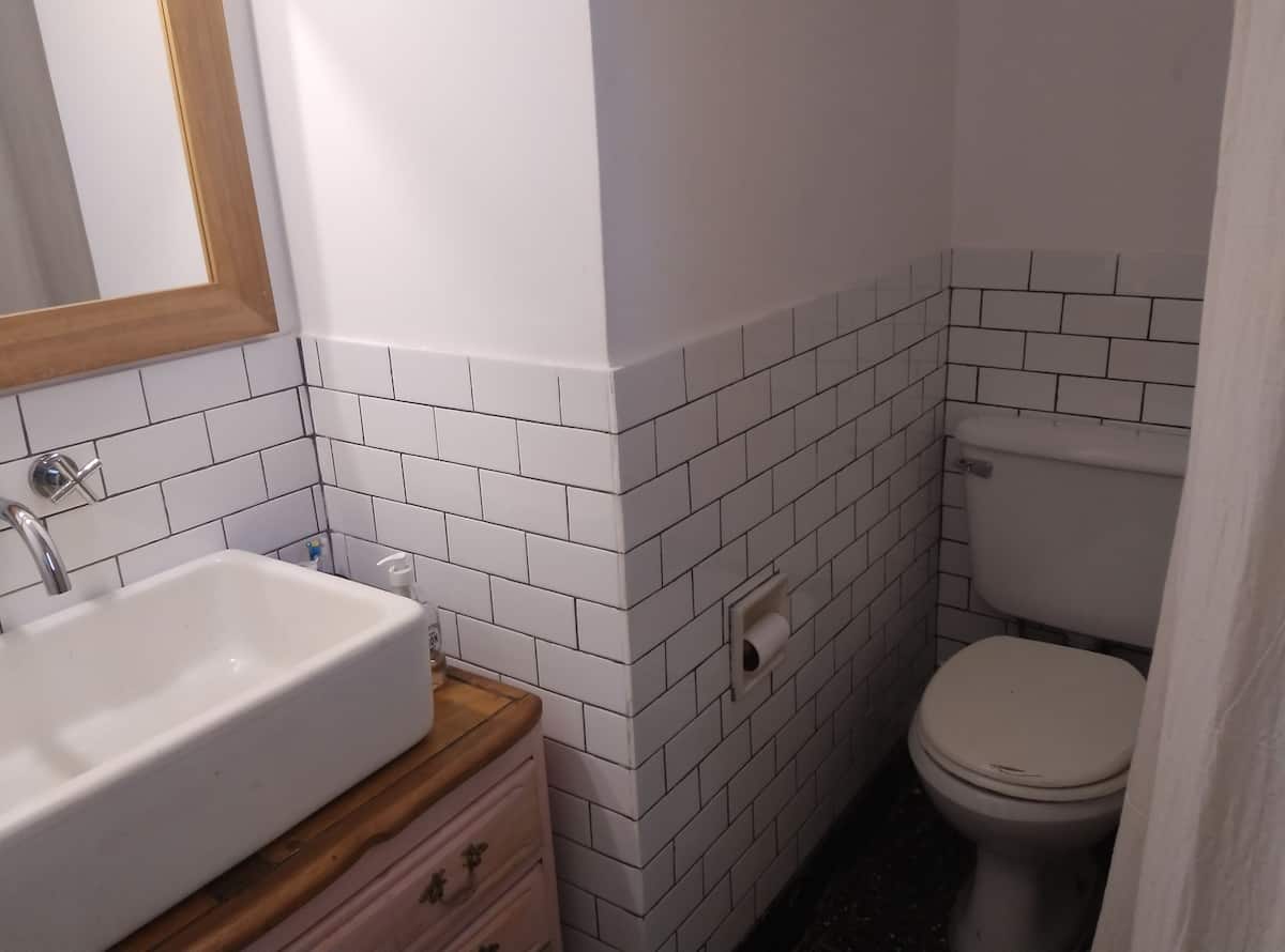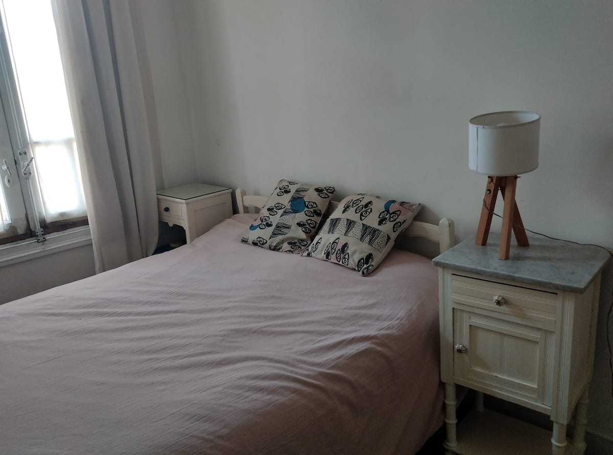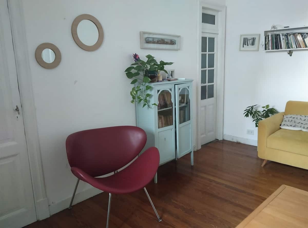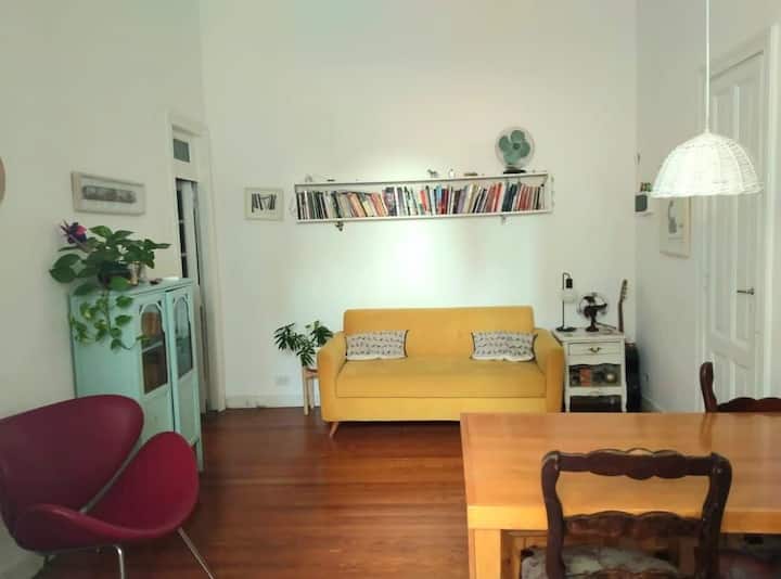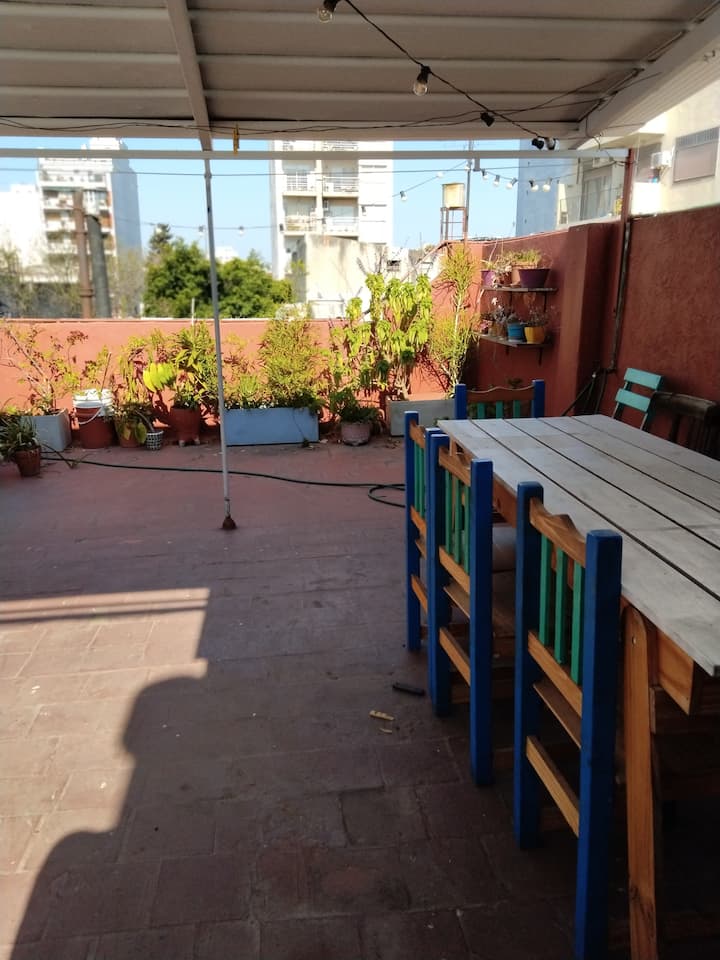 PH tipo casa en primer piso, por escalera, en la zona de Chacarita/Colegiales. Es una unidad completa sin convivencia con otras personas. Dispone de comedor con piso de madera y un dormitorio con cama doble.