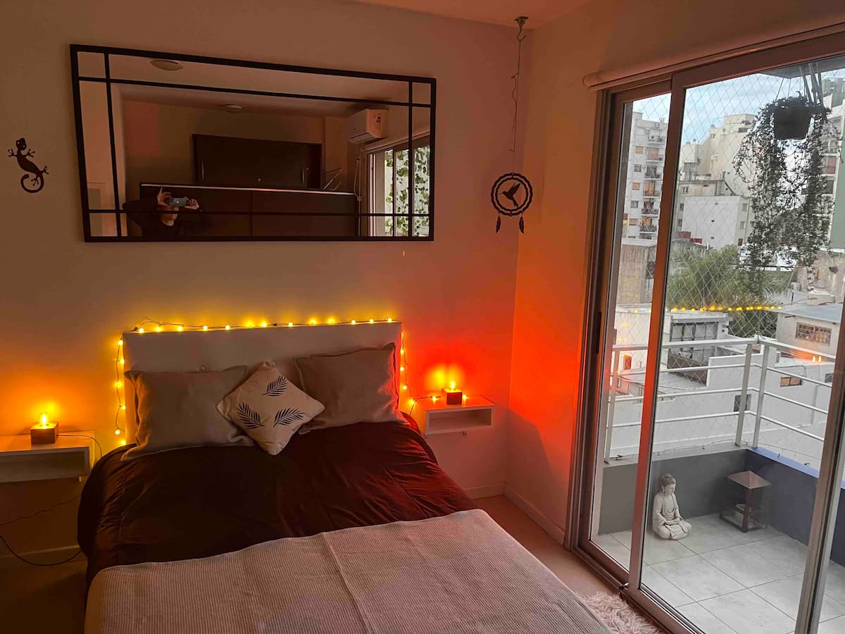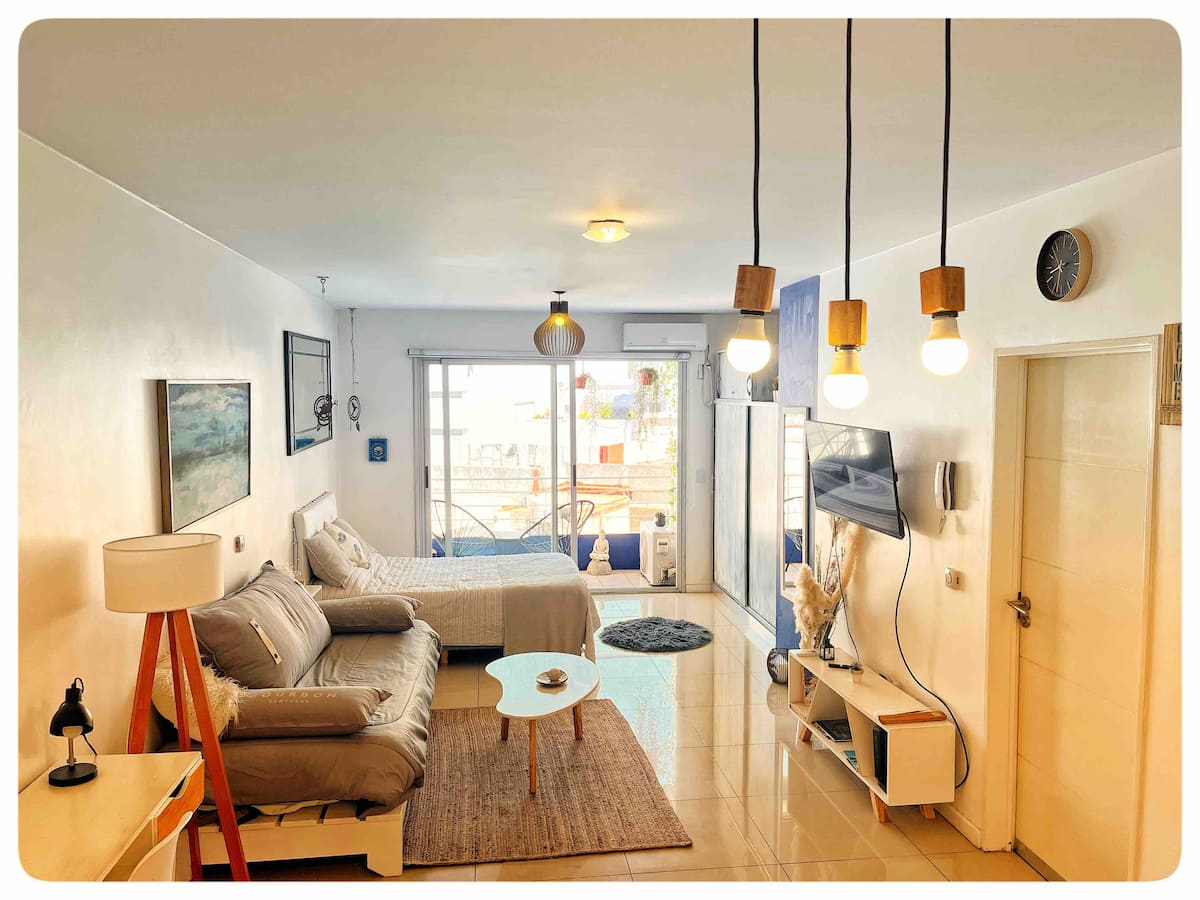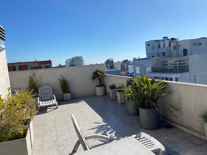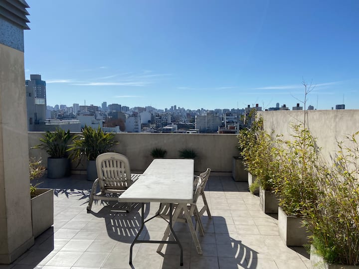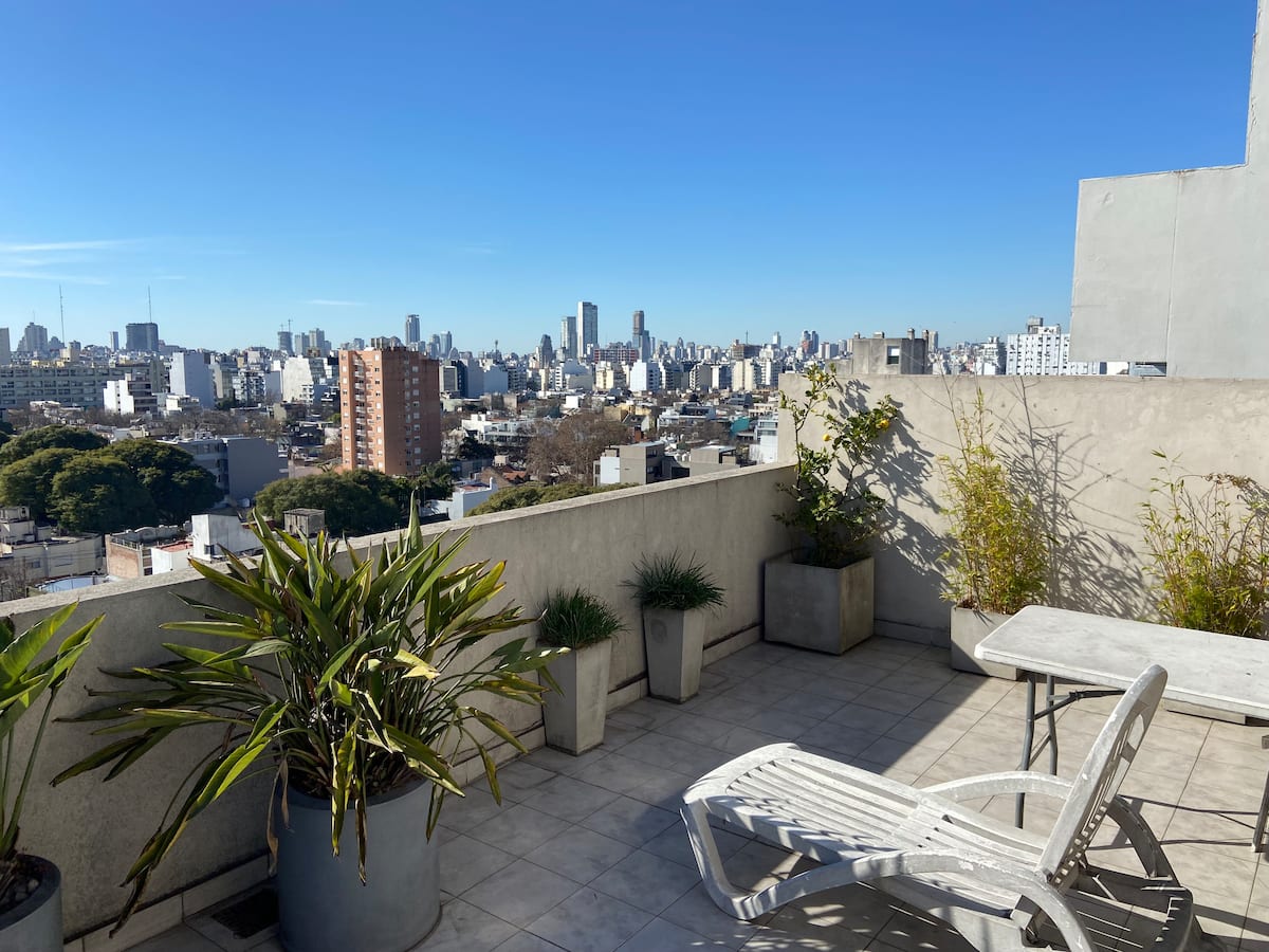 Monoambiente de 40 m² en el 11° piso de un edificio en Chacarita, con balcón al contrafrente y vista abierta. Cuenta con escritorio para home office, WiFi y Smart TV con Netflix y Youtube. Cocina con cocina eléctrica y horno, baño completo con vanitory y bañera, placard con cajonera y espacio de guardado. El edificio tiene terraza con solárium y parrilla, además de lavadero con 2 lavarropas y secarropa; en el acceso se compra el uso mediante fichas. El departamento funciona con electricidad y no
