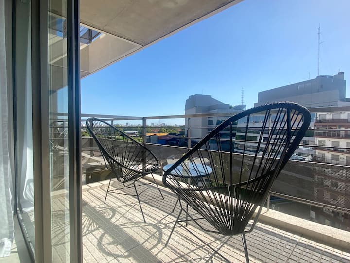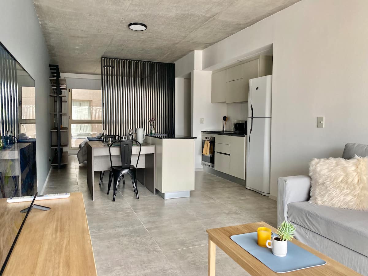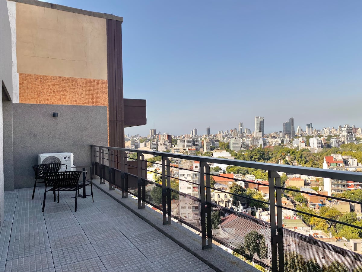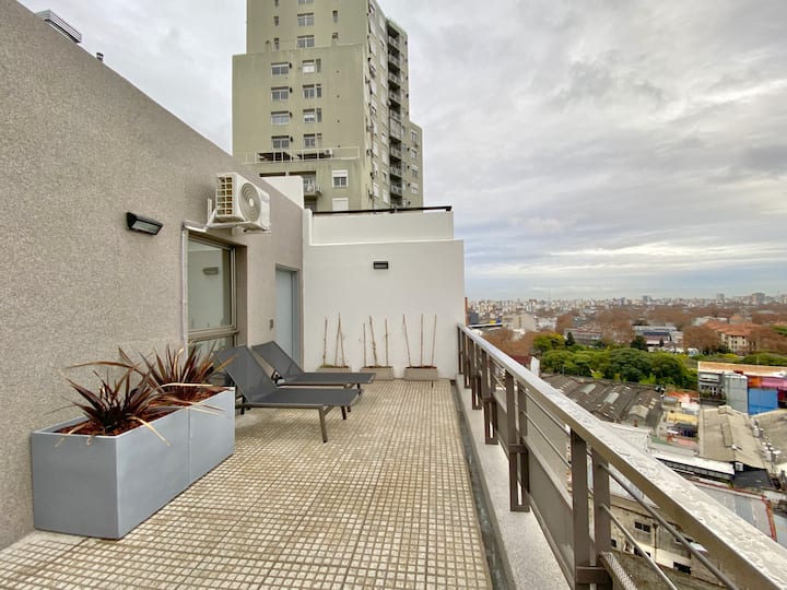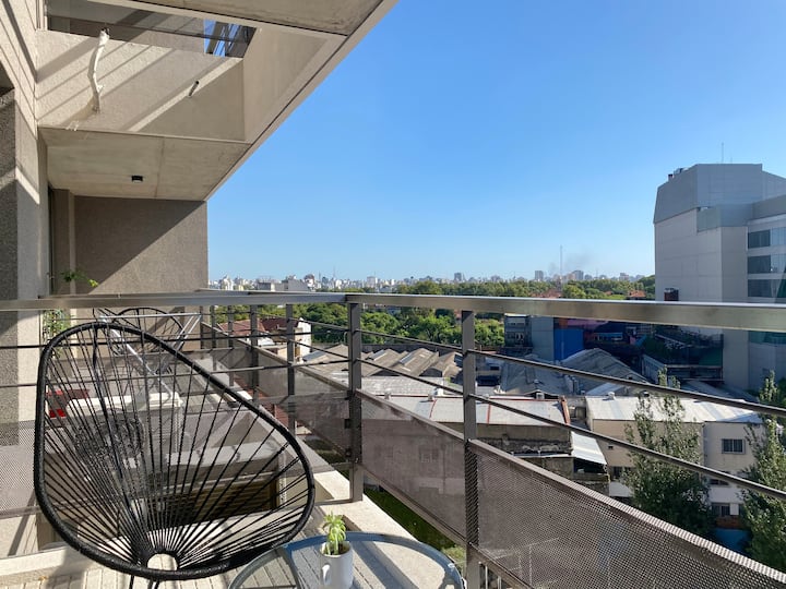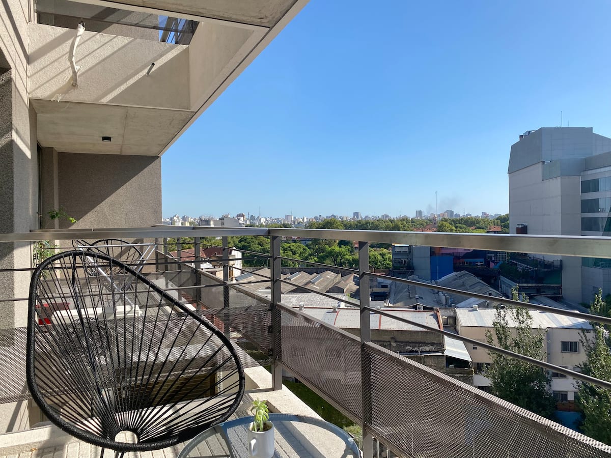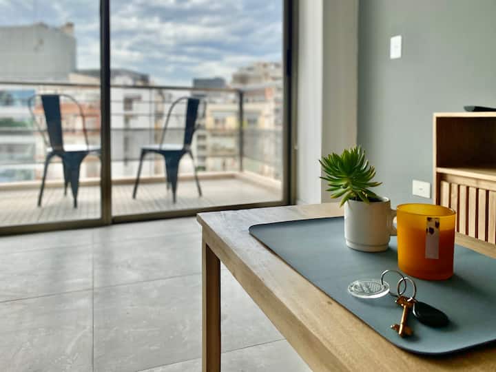 Departamento tipo estudio en Chacarita. Cuenta con espacios integrados y balcón exterior. Incluye coworking en el edificio y acceso a gimnasio y terraza con vista panorámica. Está a 3 cuadras de Movistar Arena y a 1 cuadra de una estación de subte.