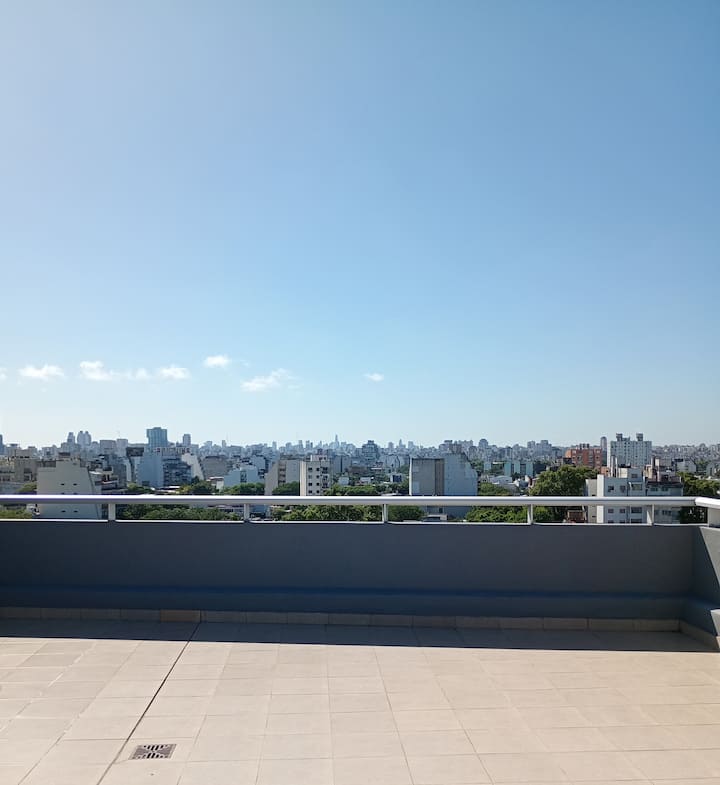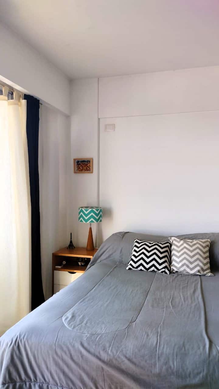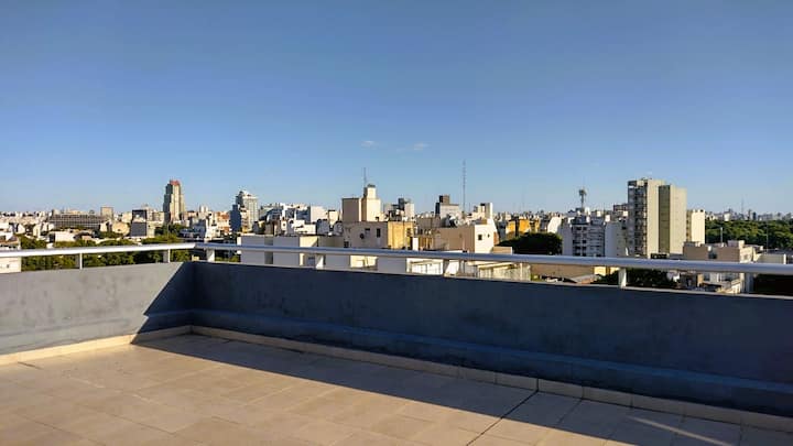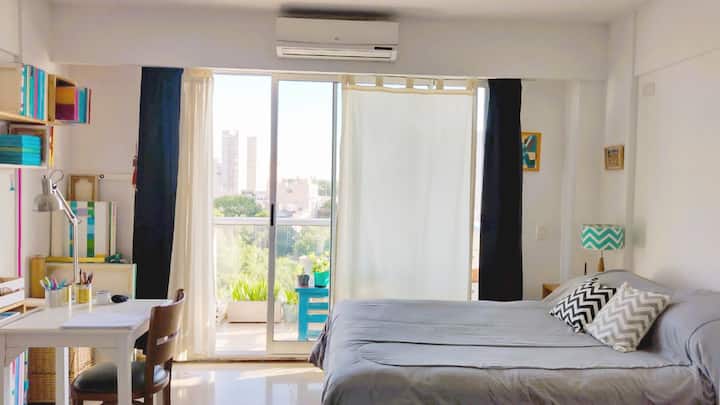 Departamento de 2 ambientes en Chacarita, con 1 dormitorio. Incluye cocina completa, baño completo con ducha manual y bañera, y un ambiente con balcón con vista panorámica. Cuenta con espacio de trabajo con escritorio, silla Thonet y lámpara, placard y estanterías, sector de lavadero con secarropas industrial y opción de uso de parrilla en terraza. Se requiere aviso con 2 días de anticipación y el precio puede variar según la duración de la estadía (1, 2 o 3 meses), con wifi incluido.