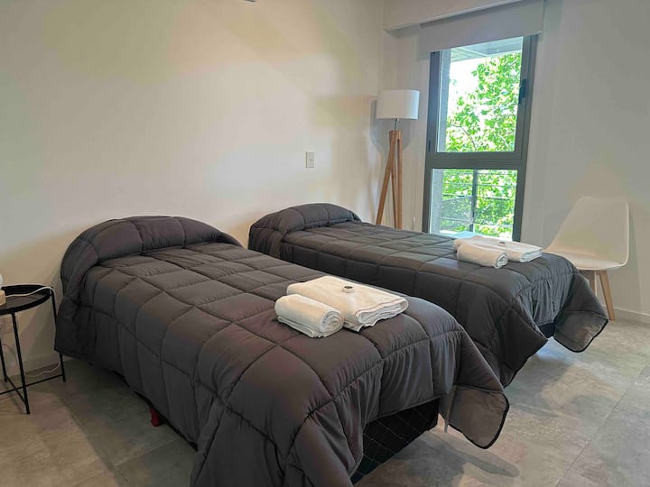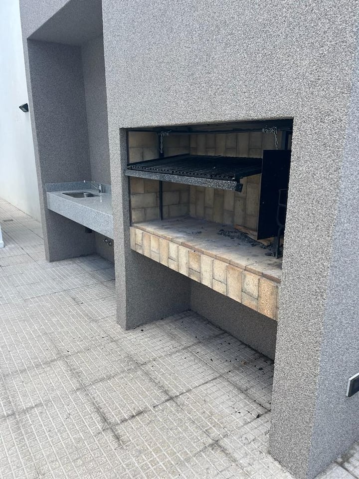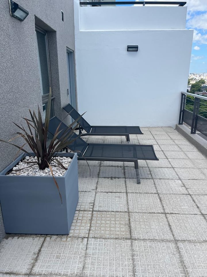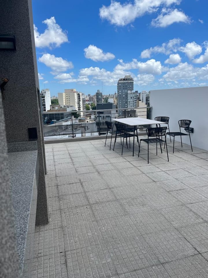 New studio apartment with a bedroom area suitable for a queen bed or two twin beds. It has a combined kitchen-dining area, a balcony, and terrace access on the top floor with panoramic views. The building includes a communal SUM and a grill area, which can be used by booking and paying the fee set by the owners' association. The listing states it is 100 metres from Subte Line B and about three blocks from Movistar Arena.