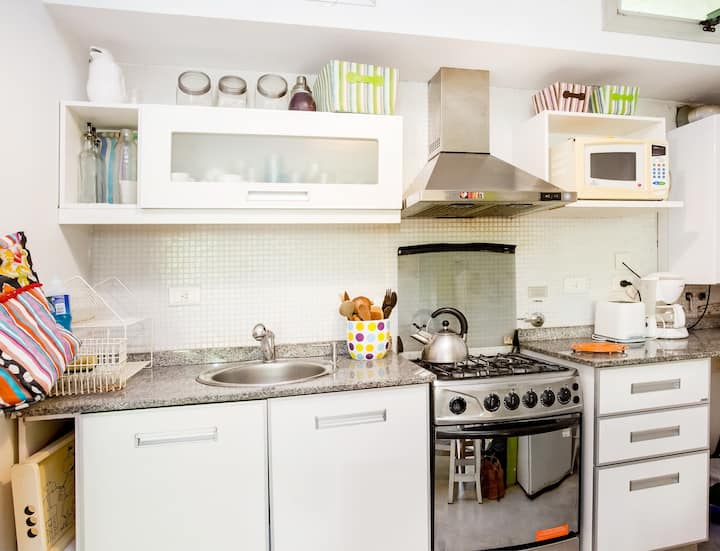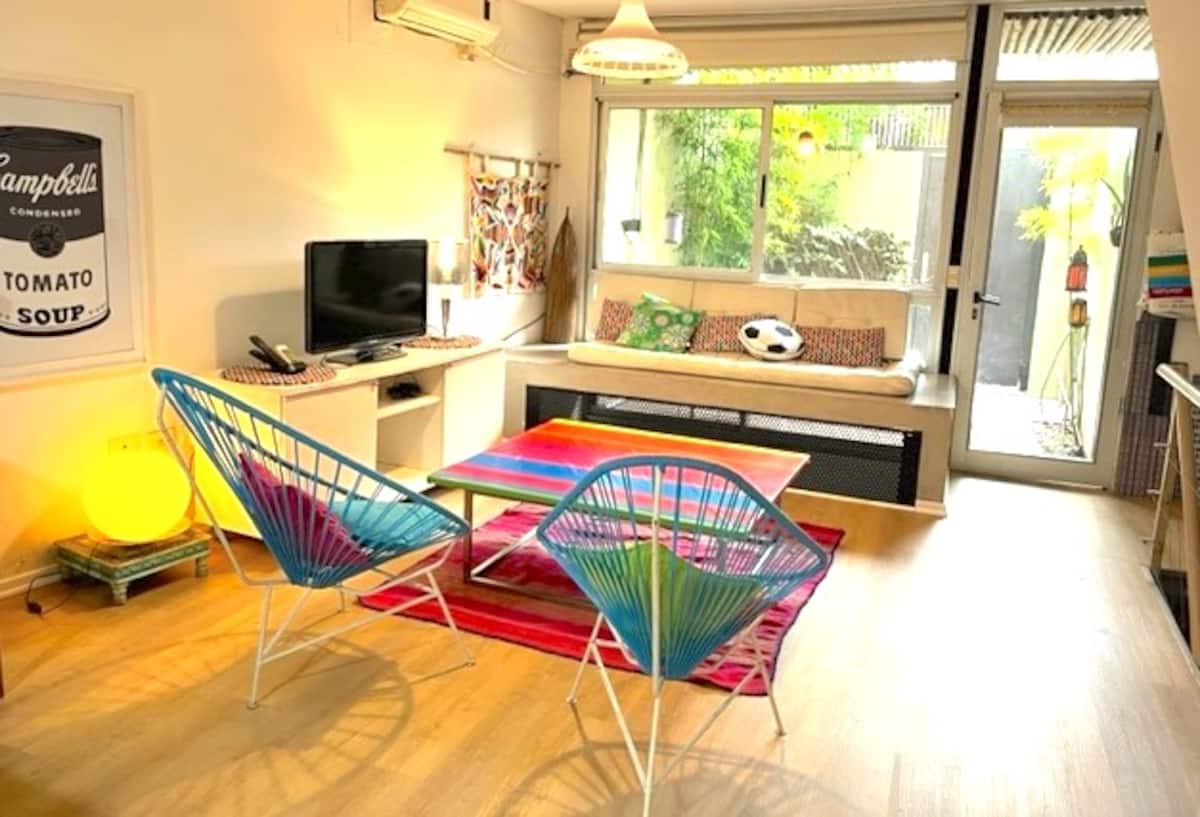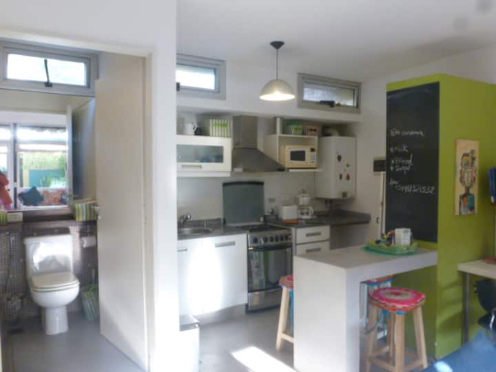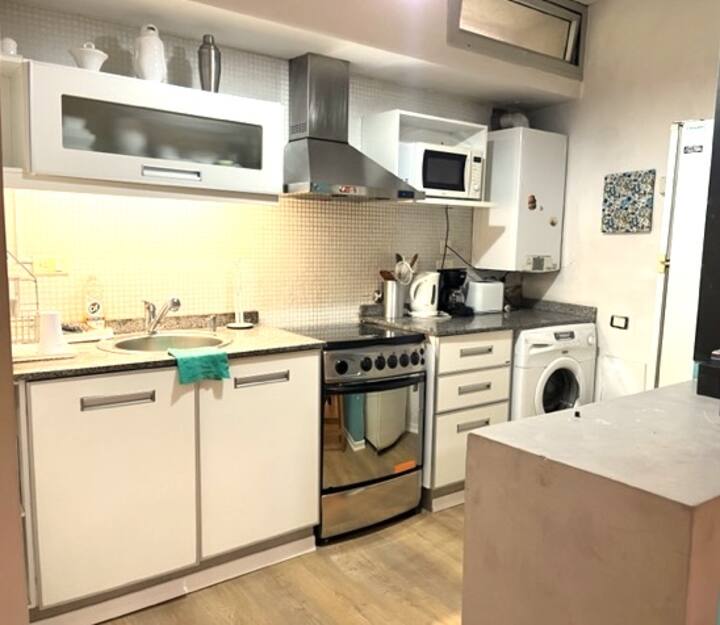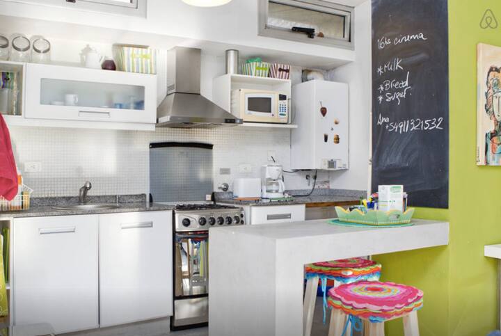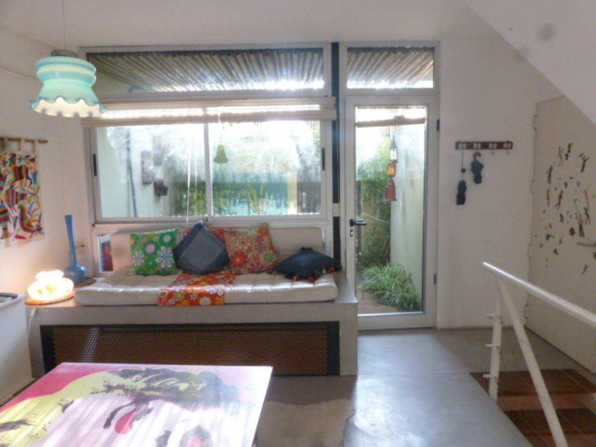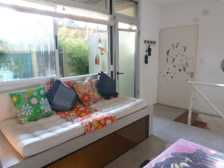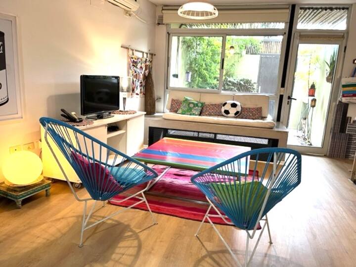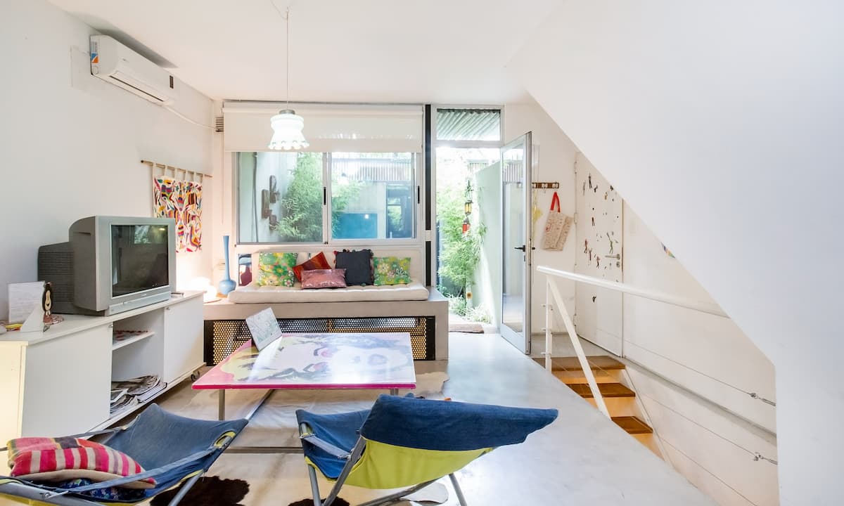 Departamento dúplex en dos niveles en Palermo Hollywood, en el límite con el barrio de Colegiales. En la planta baja tiene patio con mesa de comedor y parrilla, living, cocina americana equipada con barra y sector de escritorio, y 1 baño completo. En el nivel inferior se encuentra 1 dormitorio con cama doble. Incluye Wi-Fi, TV por cable, calefacción central, aire acondicionado en el living (frío/calor), heladera con freezer, microondas, caja de seguridad, cortinas black-out, secador de pelo, pla