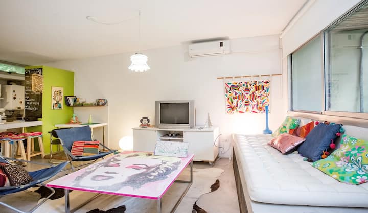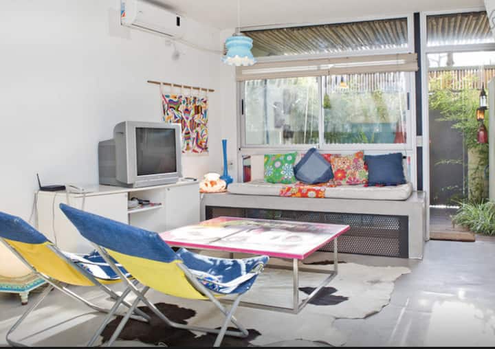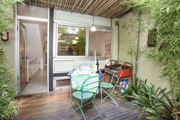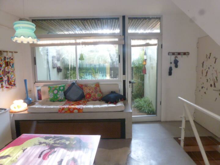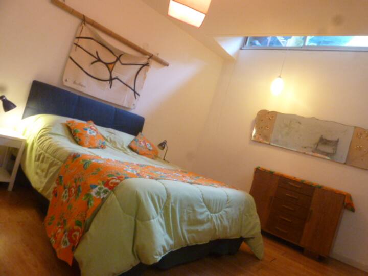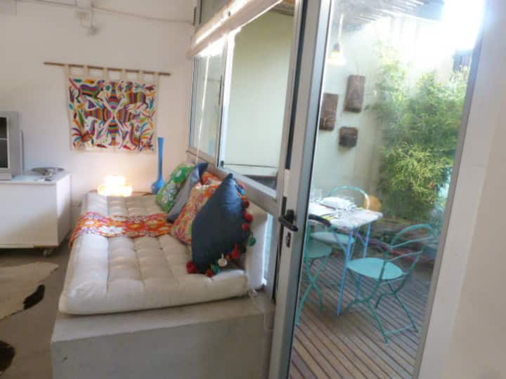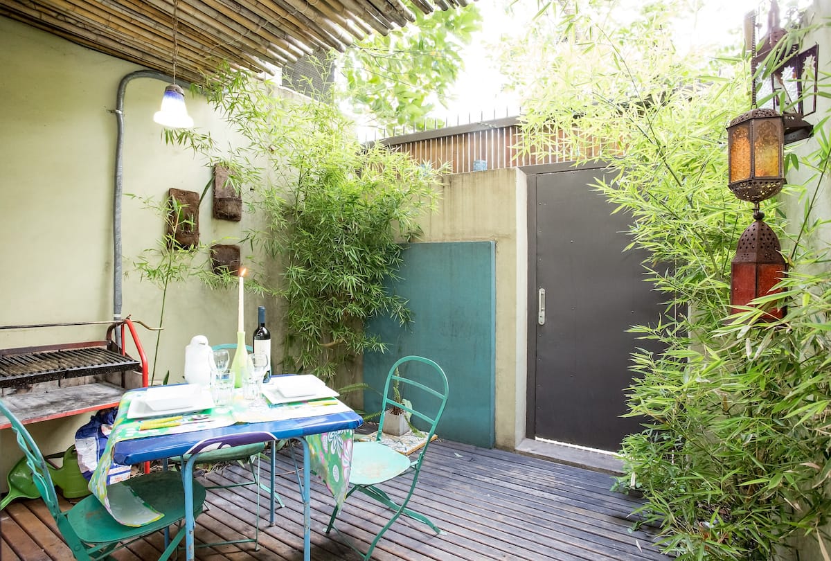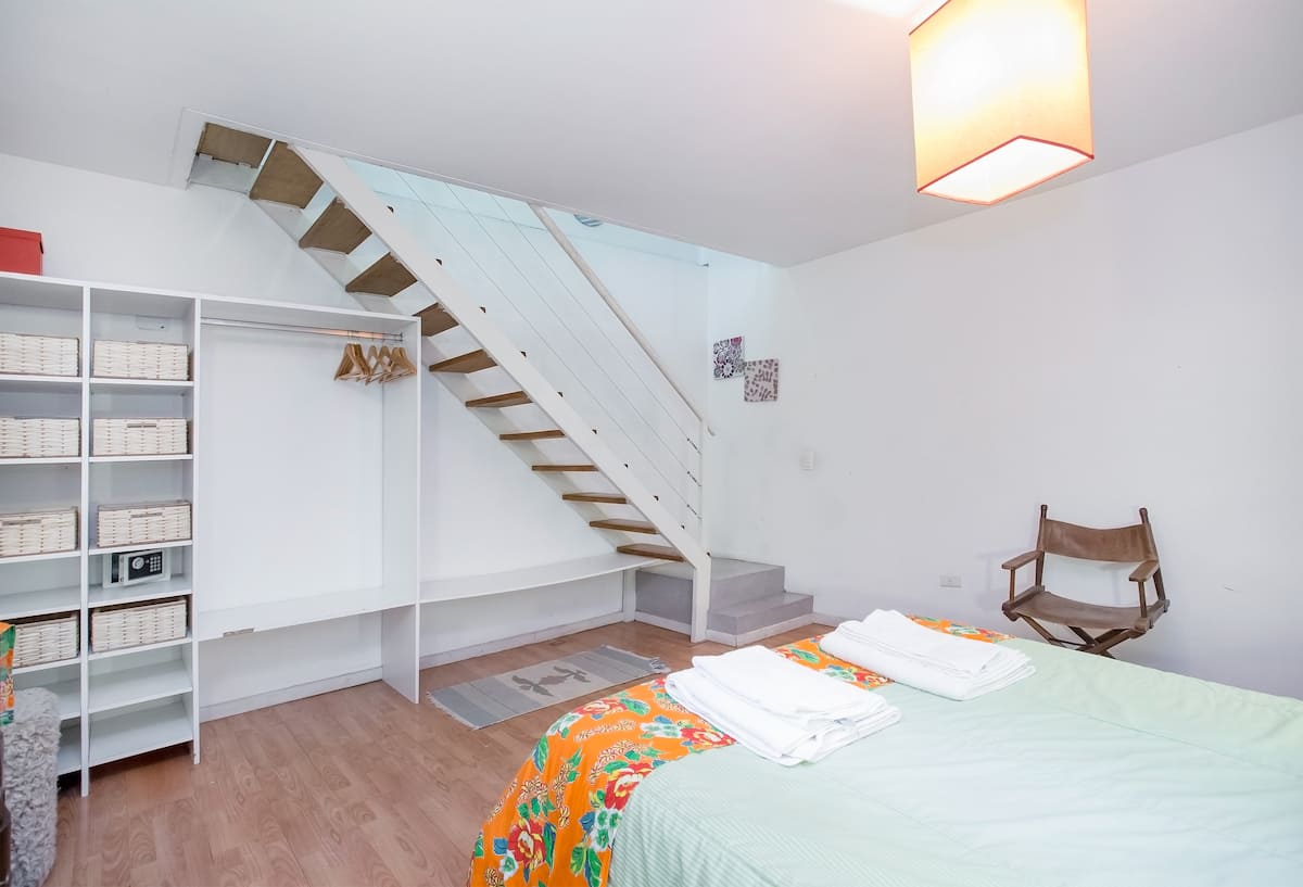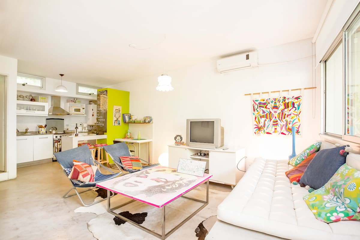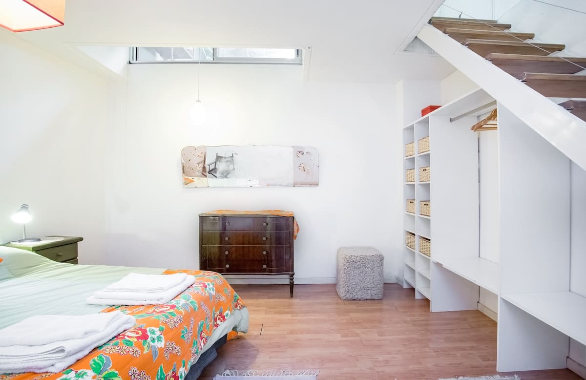 Departamento dúplex en dos niveles en Palermo Hollywood, en el límite con el barrio de Colegiales. En la planta baja tiene patio con mesa de comedor y parrilla, living, cocina americana equipada con barra y sector de escritorio, y 1 baño completo. En el nivel inferior se encuentra 1 dormitorio con cama doble. Incluye Wi-Fi, TV por cable, calefacción central, aire acondicionado en el living (frío/calor), heladera con freezer, microondas, caja de seguridad, cortinas black-out, secador de pelo, pla
