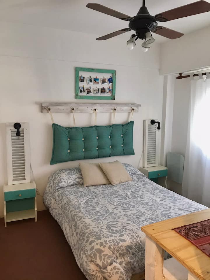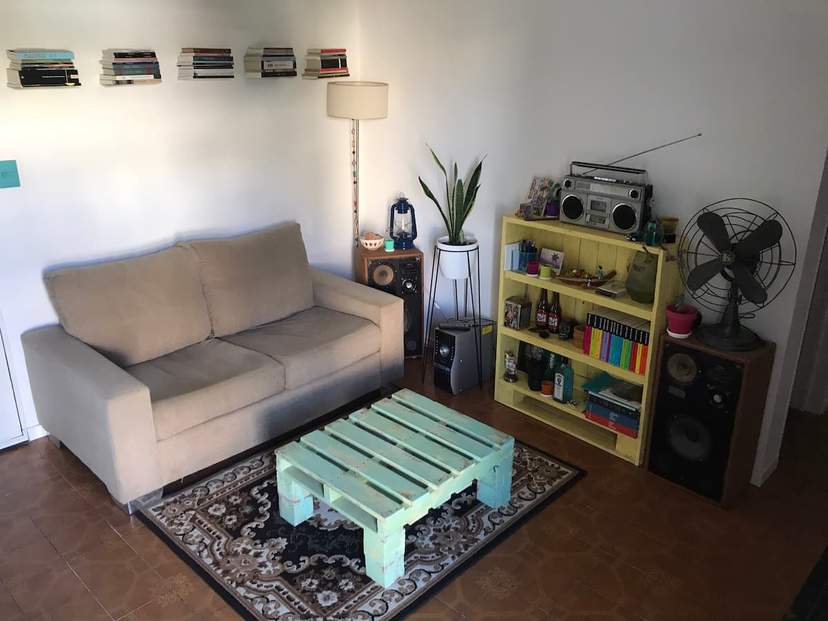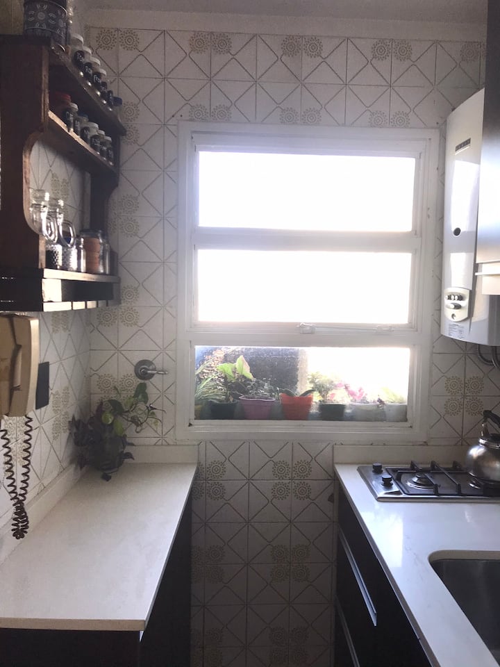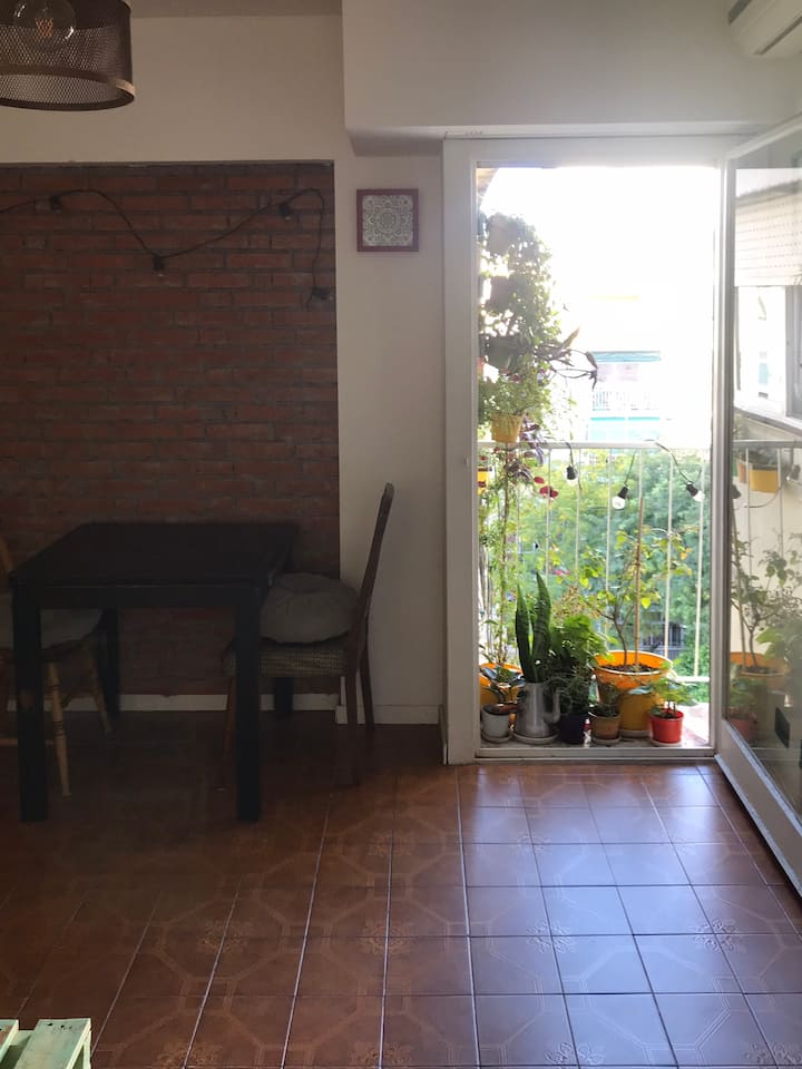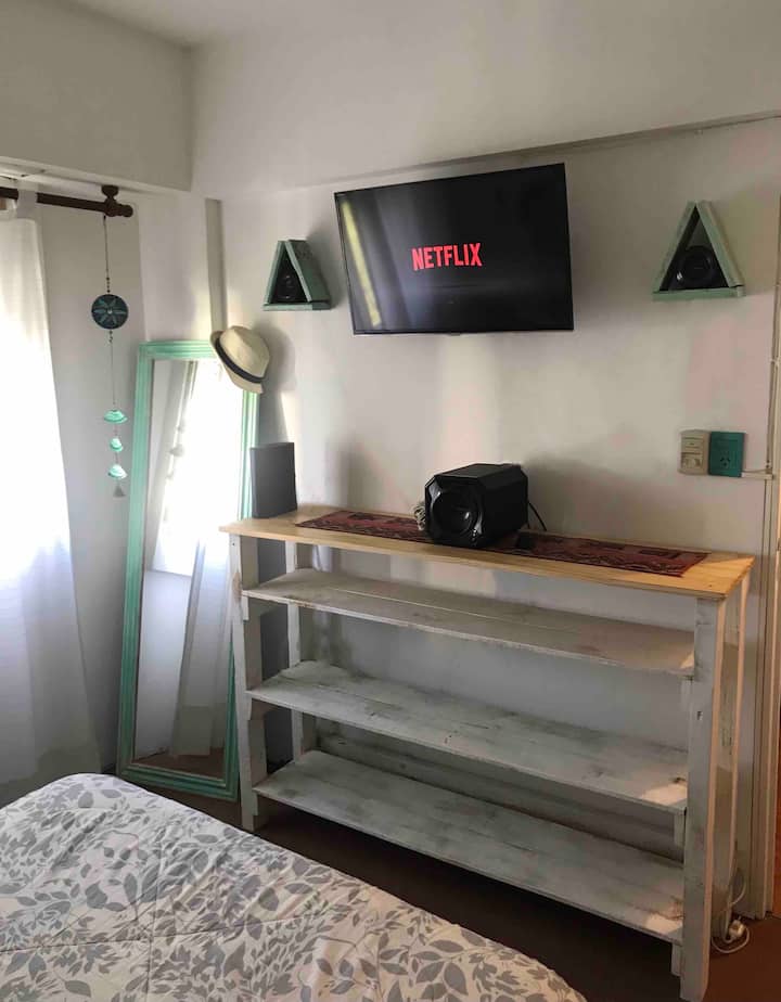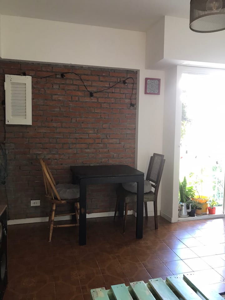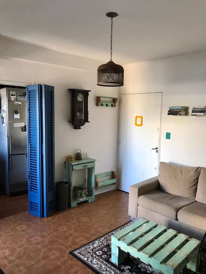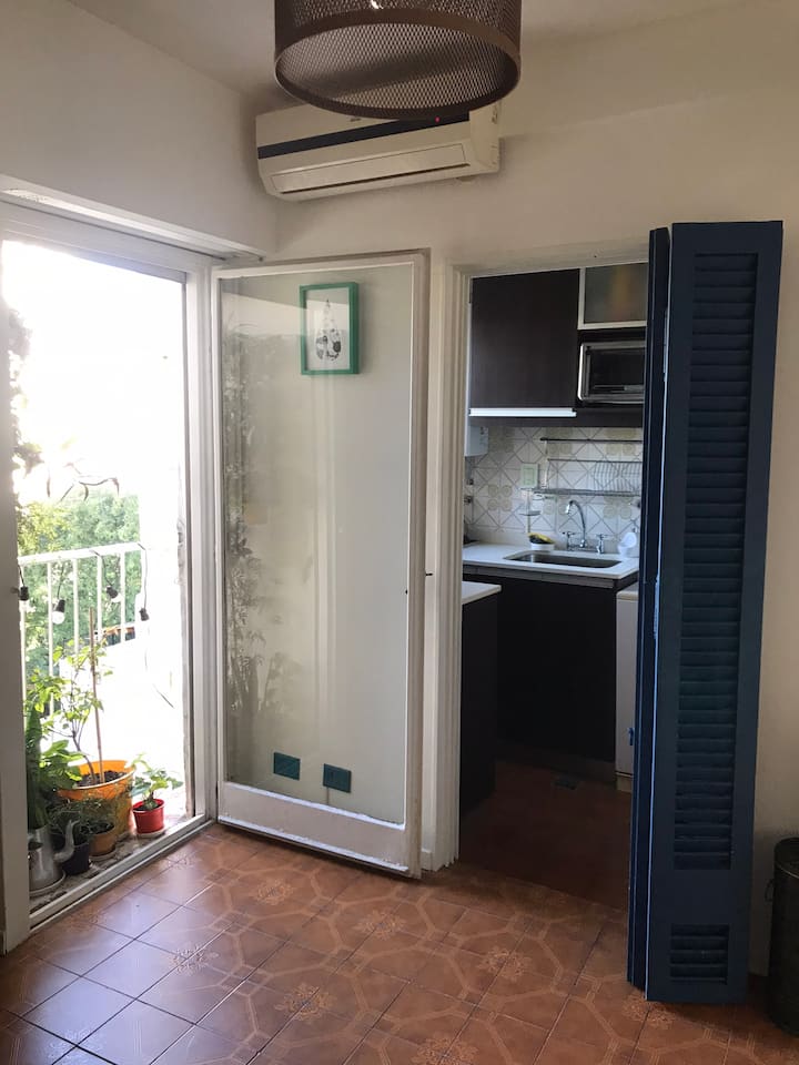 Departamento de 2 ambientes en Colegiales, con cocina independiente y equipada. Living con sofá y mesa, WiFi y balcón francés. Baño amplio y dormitorio con cama doble, Smart TV y acceso a Netflix.