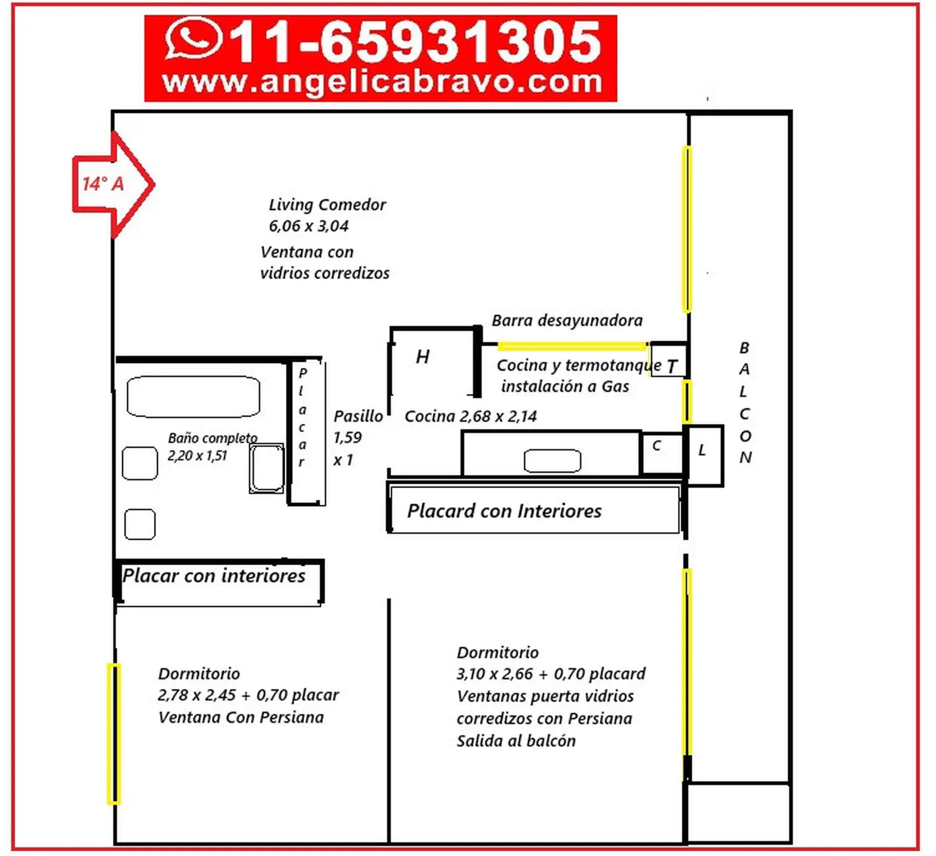 Departamento de 2 1/2 ambientes en Colegiales, piso 14°, contrafrente, con balcón corrido. 53 m² totales (47 m² cubiertos) y balcón de 6 m²; todos los ambientes tienen ventilación externa y orientación oeste. El living comedor de 6,06 x 3,04 tiene salida al balcón. La cocina es completa e incluye termotanque a gas y área de desayunador; hay lavadero con bacha e instalación para lavarropas en el balcón. El baño es completo (2,20 x 1,51) con ventana al exterior; el dormitorio principal (3,10 x 2,6