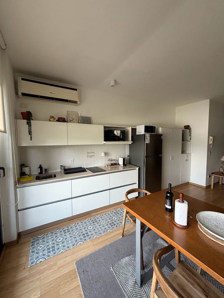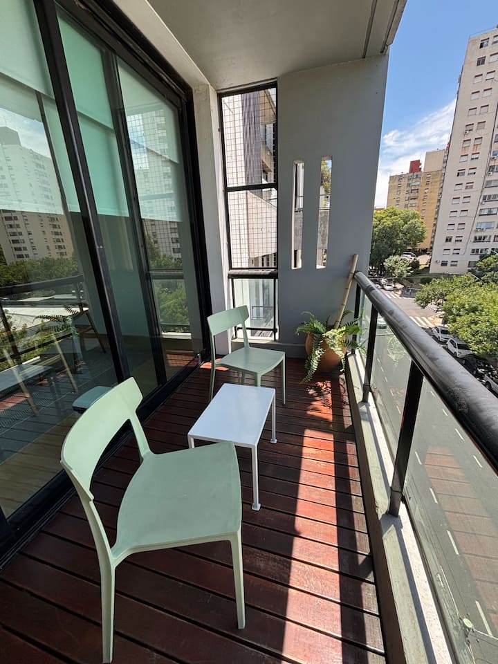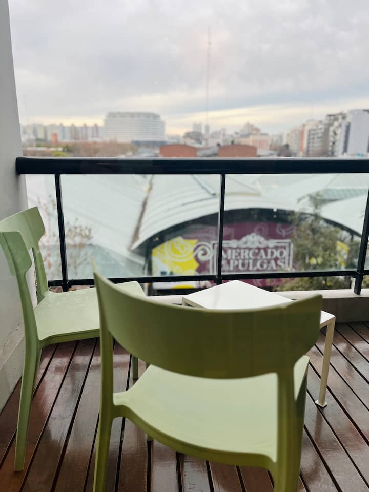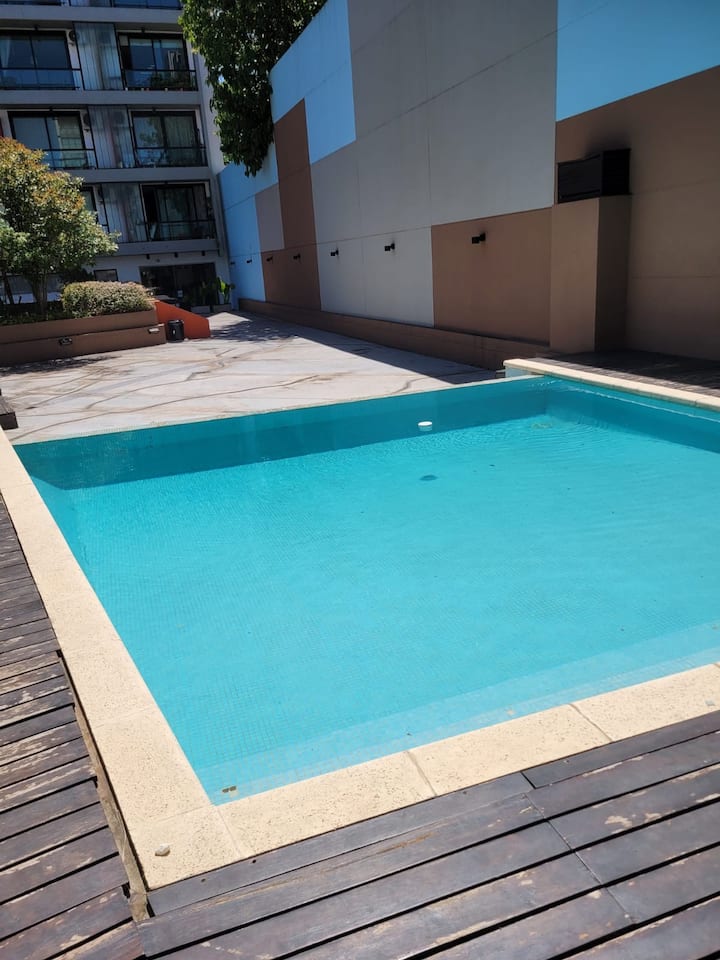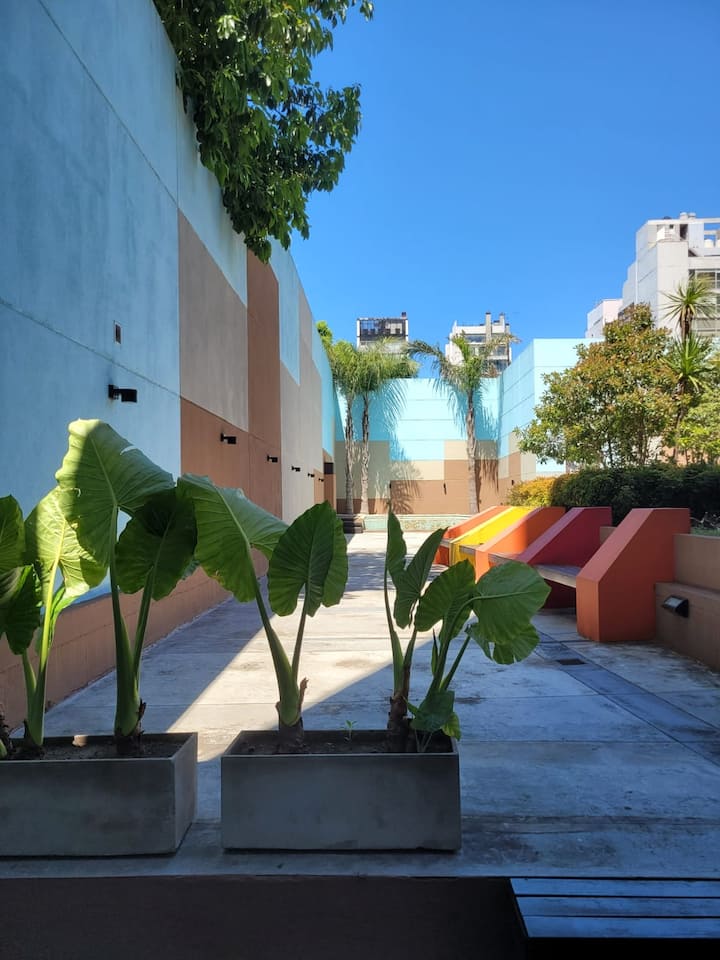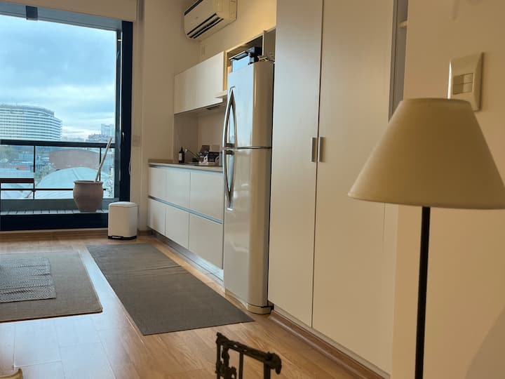 Departamento tipo estudio en Colegiales, con balcón privado al frente. Cuenta con 1 baño completo con ducha. Está totalmente equipado: cama doble de 1,40, heladera y cafetera Nespresso, mesa para 4 y WiFi. El edificio tiene 2 ascensores, lavandería y piscina con solárium.