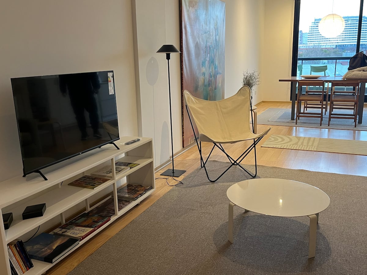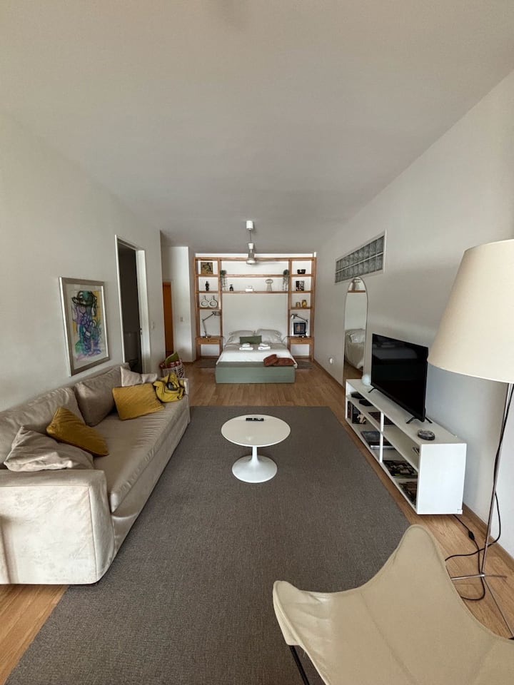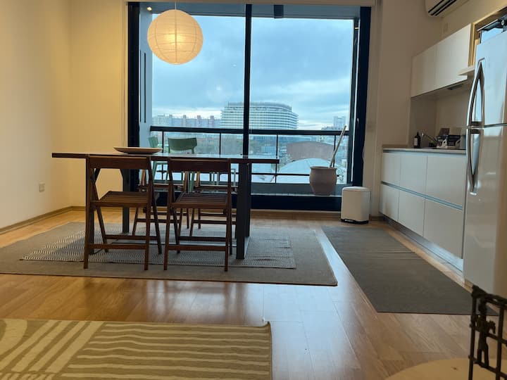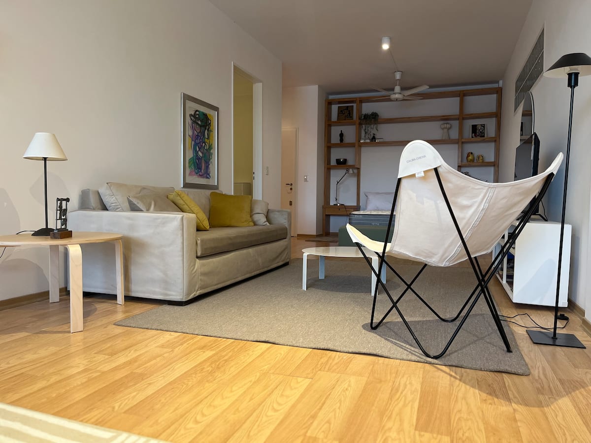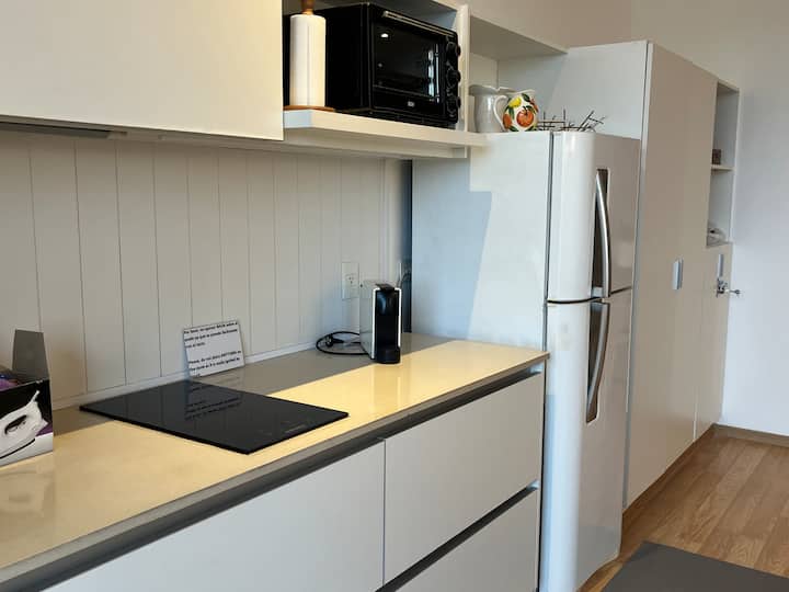 Departamento tipo estudio en Colegiales, con balcón privado al frente. Cuenta con 1 baño completo con ducha. Está totalmente equipado: cama doble de 1,40, heladera y cafetera Nespresso, mesa para 4 y WiFi. El edificio tiene 2 ascensores, lavandería y piscina con solárium.