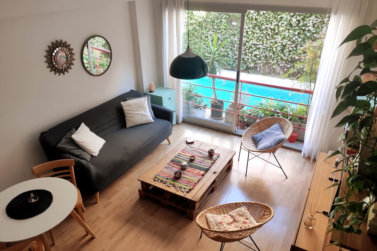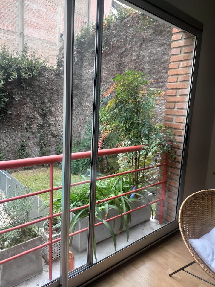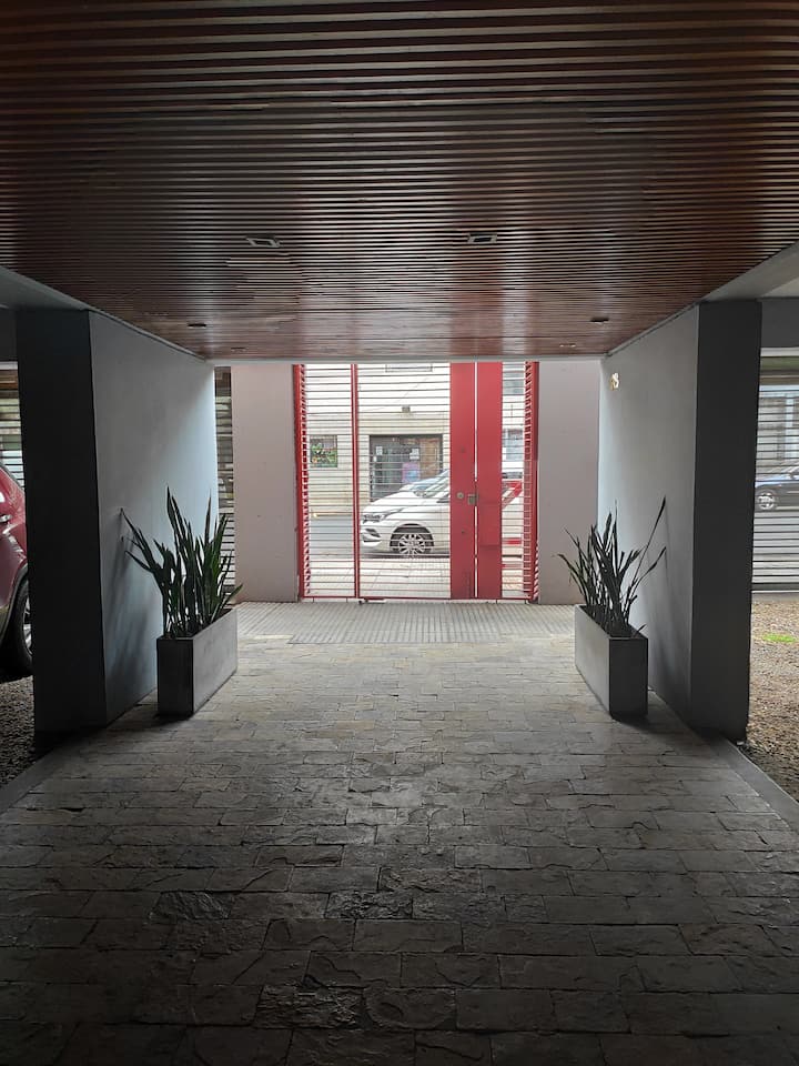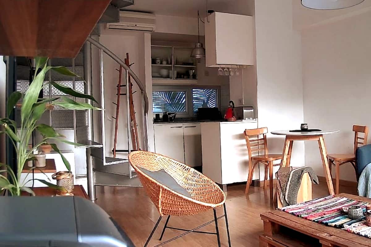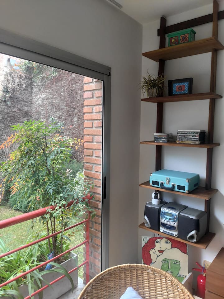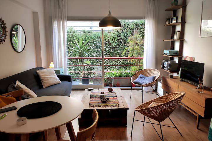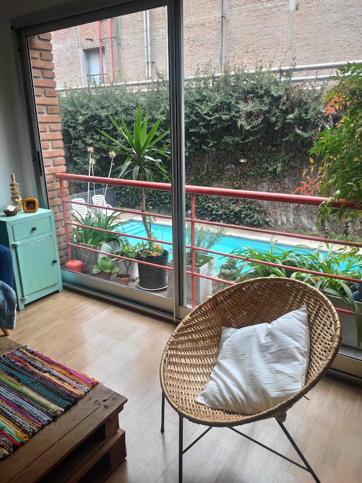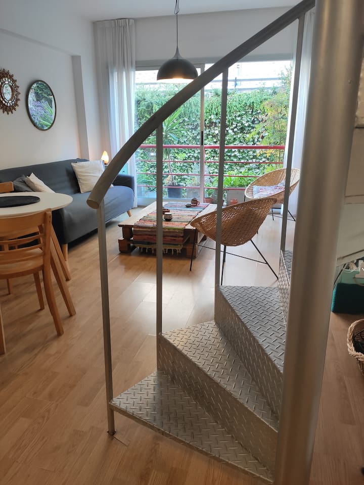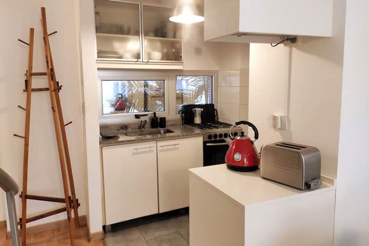 Duplex de 2 niveles de 43 m² en Colegiales. Se encuentra en el 1er piso y da al jardín del complejo, con buena iluminación y ambiente tranquilo. En la planta baja hay cocina integrada y living-comedor con ventana al jardín; una escalera interna lleva al dormitorio principal con vista al jardín, un área de descanso y baño. Incluye conexión a internet de 300 Mbps por WiFi o cable UTP, con sistemas de respaldo, y el edificio cuenta con jardín grande, lavandería, pileta y parrilla.